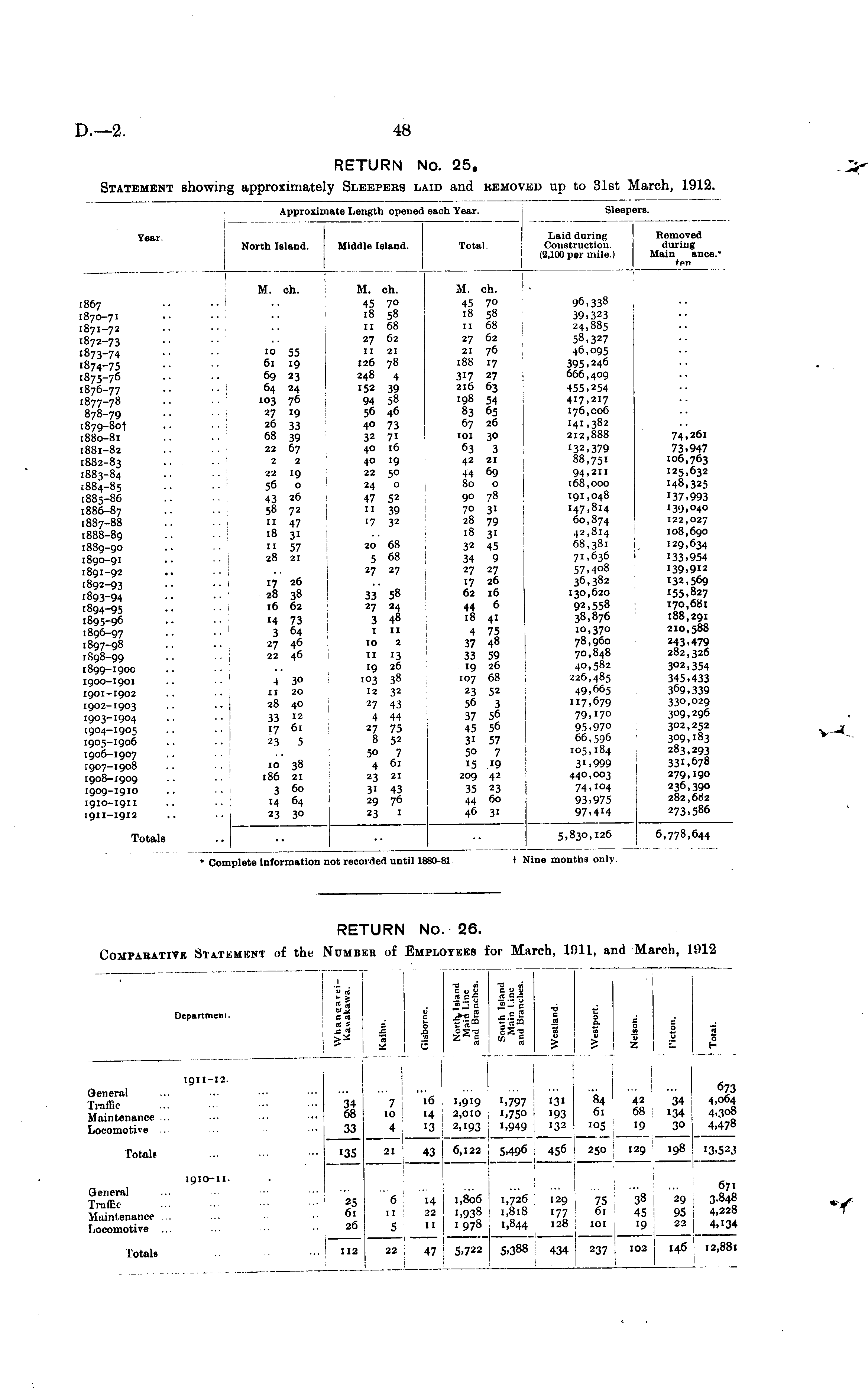 RETURN No. 25. Statement showing approximately Sleepers laid and removed up to 31st March, 1912.