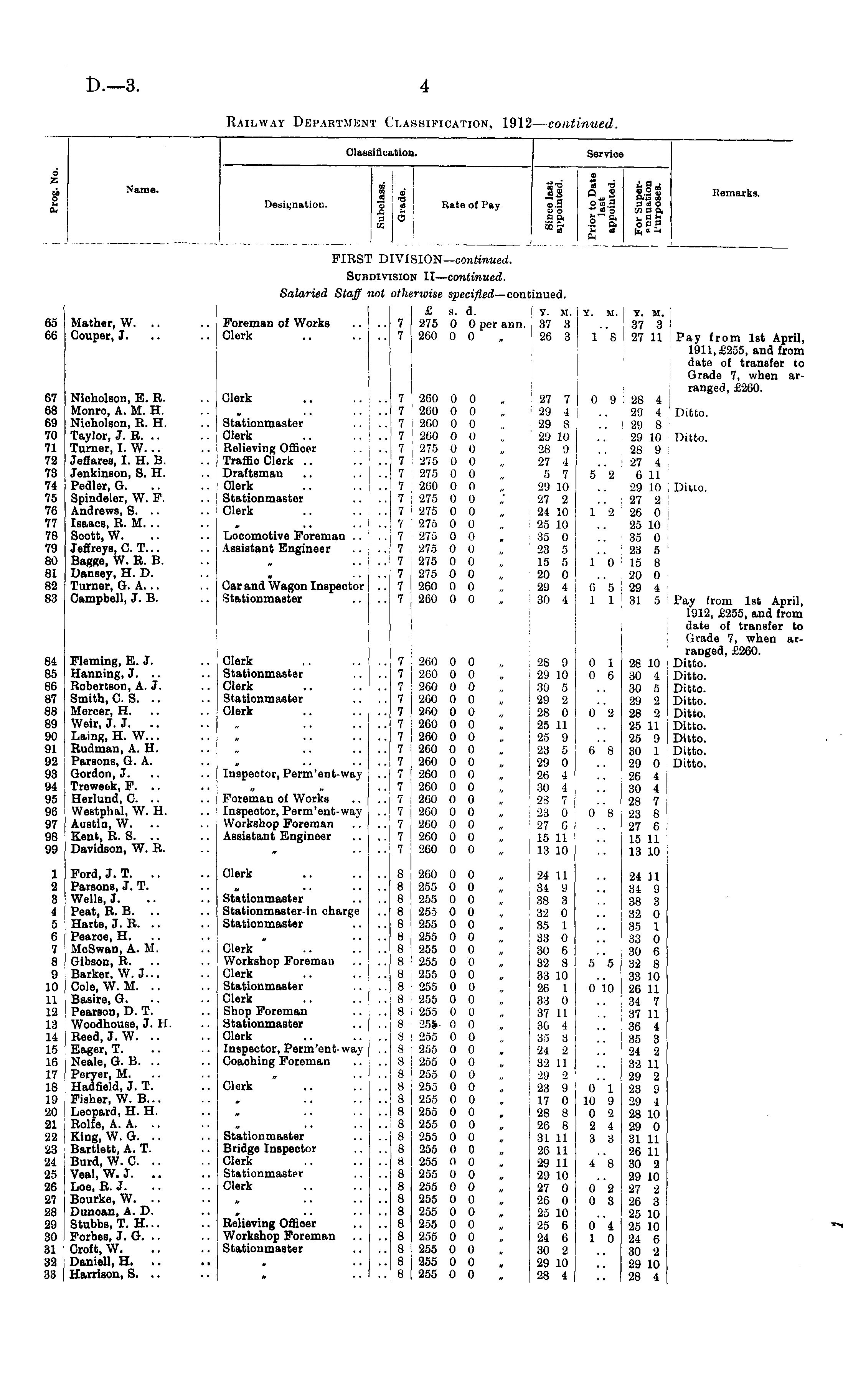 Classification. Service 6 7. CO o fa ft Name. 4 © © Designation. © 39 3 CO © ■3 as 5 Rate of Pay © ©03 d 3 fa ? J 3© Q © ".2™ ©3 0©3 3 © o OO 'faoSo CO 3 P, b a S~ ft fa 3 fa 55 ft § & o c ? W OS fa © [fa 3. -, ft Remarks. FIRST D IVI l VI! I SI ON —con tinned. SUBDIVl isio: ;io: )N II— continued. >5 Mather, W. .. Couper, J. Salaried Staff not Foreman of Works Clerk .. .. .. otht itht 7 7 7 7 xrwise specified— continued. I £ a. d. I y. 5i. 275 0 0 per ann. 37 3 260 0 0 „ 26 3 Y. M. Y. M. j 37 3 1 8 27 11 Pay from 1st April, 1911, £255, and from date of transfer to Grade 7, when arranged, £260. 0 9 : 28 4 23 4 ' Ditto. 29 8 .. 29 10 Ditto. 28 9 .. 27 4 5 2 6 11 29 10 ; Ditto. .. 27 2 12 2G 0 25 10 35 0 23 5 1 0 15 8 20 0 G 5 29 4 1 1 31 5 ' Pay from 1st April, 1912, £255, and from date of transfer to Grade 7, when arranged, £260. 0 1 28 10 Ditto. 0 G 30 4 Ditto. 30 5 Ditto. 29 2 Ditto. 0 2 28 2 Ditto. 25 11 Ditto. 25 9 j Ditto. 6 8 30 1 Ditto. 29 0 Ditto. Nicholson, E. R. Monro, A. M. H. Nicholson, R. H. Taylor, J. R. Turner, I. W. .. Jeffares, I. H. B. Jenkinson, 8. H. Pedler, G. Spindeler, W. P. Andrews, 8. .. Isaacs, R. M. .. Scott, W. Jeffreys, C T... Bagge, W. R. B. Dansey, H. D. Turner, G. A... Campbell, J. B. Clerk G7 68 69 70 71 72 73 74 75 7G 77 78 79 80 81 82 83 Stationmaster Clerk Relieving Officer Traffio Clerk .. .. Draftsman Clerk .. .. .. Stationmaster Clerk .. .. .. 7 7 7 7 7 7 7 7 7 7 7 7 7 7 7 7 7 260 0 0 „ 27 7 260 0 0 „ i 29 4 2G0 0 0 „ 29 8 260 0 0 „ ' 29 10 275 0 0 „ 28 9 275 0 0 27 4 275 0 0 , 5 7 260 0 0 „ 29 10 ; 275 0 0 „' 27 2 1 275 0 0 „ 24 10 : 275 0 0 „ 25 10 275 0 0 , 35 0 275 0 0 , 23 5 275 0 0 „ 15 5 275 0 0 , 20 0 260 0 0 „ 29 4 260 0 0 „ 30 4 Locomotive Foreman .. Assistant Engineer Car and Wagon Inspector Stationmaster 84 85 8G 87 8S 89 90 91 92 93 94 95 9G 97 98 99 Fleming, E. J. Hanning, J. .. Robertson, A. J. Smith, C. S. .. Mercer, H. Weir, J. J. Laing, H. W... Rudman, A. H. Parsons, G. A. Gordon, J. Treweek, F. .. Herlund, O. .. Westphal, W. H. Austin, W. Kent, R. S. Davidson, W. R. Clerk .. .. .. Stationmaster Clerk Stationmaster Clerk 7 7 7 7 7 7 7 7 7 7 7 7 7 7 7 7 7 7 7 7 7 7 7 7 7 7 7 7 7 7 7 260 0 0 „ 28 9 260 0 0 „ , 29 10 260 0 0 „ i 30 5 260 0 0 i 29 2 260 0 0 „ i 28 0 260 0 0 „ i 25 11 260 0 0 25 9 260 0 0 . 23 5 260 0 0 , 29 0 260 0 0 0 26 4 260 0 0 „ 30 4 2G0 0 0 „ 23 7 260 0 0 „ 23 0 260 0 0 „ 27 0 260 0 0 15 11 260 0 0 13 10 0 1 0 G 28 10 30 4 30 5 29 2 28 2 25 11 25 9 30 1 29 0 26 4 30 4 28 7 23 8 27 6 15 11 13 10 0 2 6 *8 Inspector, Perm'ent-way Foreman of Works Inspeotor, Perm'ent-way Workshop Foreman Assistant Engineer 0*8 1 9 3 i 5 6 7 8 9 10 11 12 18 14 15 16 17 18 19 20 21 22 28 21 25 26 27 28 29 30 31 32 88 Ford, J. T. Parsons, J. T. Wells, J. Peat, R. B. Harte, J. R. Pearoe, H. MoSwan, A. M. Gibson, R. Barker, W. J... Cole, W. M. .. Basire, G. Pearson, D. T. Woodhouse, J. H. Reed, J. W. .. Eager, T. Neale, G. B. Peryer, M. Hadfield, J. T. Fisher, W. B... Leopard, H. H. Rolfe, A. A. King, W. G. .. Bartlett, A. T. Burd, W. 0. Veal, W.J. .. Loe, R. J. Bourke, W. .. Duncan, A. D. Stubbs, T. H... Forbes, J. G. Croft, W. Daniell, H. Harrison, S. .. Clerk Stationmaster Stationmaster-in charge Stationmaster Clerk Workshop Foreman Clerk .. .. .. Stationmaster Clerk .. .. .. Shop Foreman Stationmaster Clerk .. .. .. Inspector, Perm'ent-way .. Coaohing Foreman 8 S 8 8 8 8 8 8 8 3 8 8 8 8 8 8 8 8 8 8 8 8 8 8 8 8 S 8 s 8 8 8 8 8 8 8 8 8 8 8 8 8 8 8 8 8 • 8 8 8 8 8 8 8 8 8 8 8 8 8 8 8 S 8 8 8 8 260 0 0 24 11 255 0 0 , 34 9 255 0 0 „ 38 3 255 0 0 ., 32 0 255 0 0 35 1 255 0 0 „ 33 0 255 0 0 „ 30 6 255 0 0 „ 32 8 255 0 0 . 33 10 965 0 0 , ! 26 1 • 255 0 0 „ 33 0 255 0 0 „ 37 11 25* 0 0 3G 4 ! 255 0 0 , 35 3 255 0 0 , 24 2 255 0 0 32 11 255 0 0 „ 29 2 255 0 0 3 ; 23 9 255 0 0 „ 17 0 255 0 0 „ ' 28 8 255 0 0 „ | 26 8 255 0 0 31 11 255 0 0 „ 26 11 255 0 0 „ 29 11 255 0 0 „ 29 10 255 0 0 . 27 0 255 0 0 „ 26 0 255 0 0 „ 25 10 255 0 0 , 25 6 255 0 0 , 24 6 255 0 0 , 30 2 255 0 0 . 29 10 255 0 0 28 4 5 *5 0 10 24 11 34 9 38 3 32 0 35 1 33 0 30 6 32 8 33 10 26 11 34 7 37 11 36 4 35 3 24 2 32 11 29 2 23 9 29 4 28 10 29 0 31 11 26 11 30 2 29 10 27 2 26 8 25 10 25 10 24 6 30 2 29 10 Clerk .. .. .. 0 1 10 9 0 2 2 4 3 3 Stationmaster Bridge Inspector Clerk .. .. .. Stationmaster Clerk .. .. .. 4**8 0**2 0 3 Relieving Offioer Workshop Foreman Stationmaster 0*4 1 0