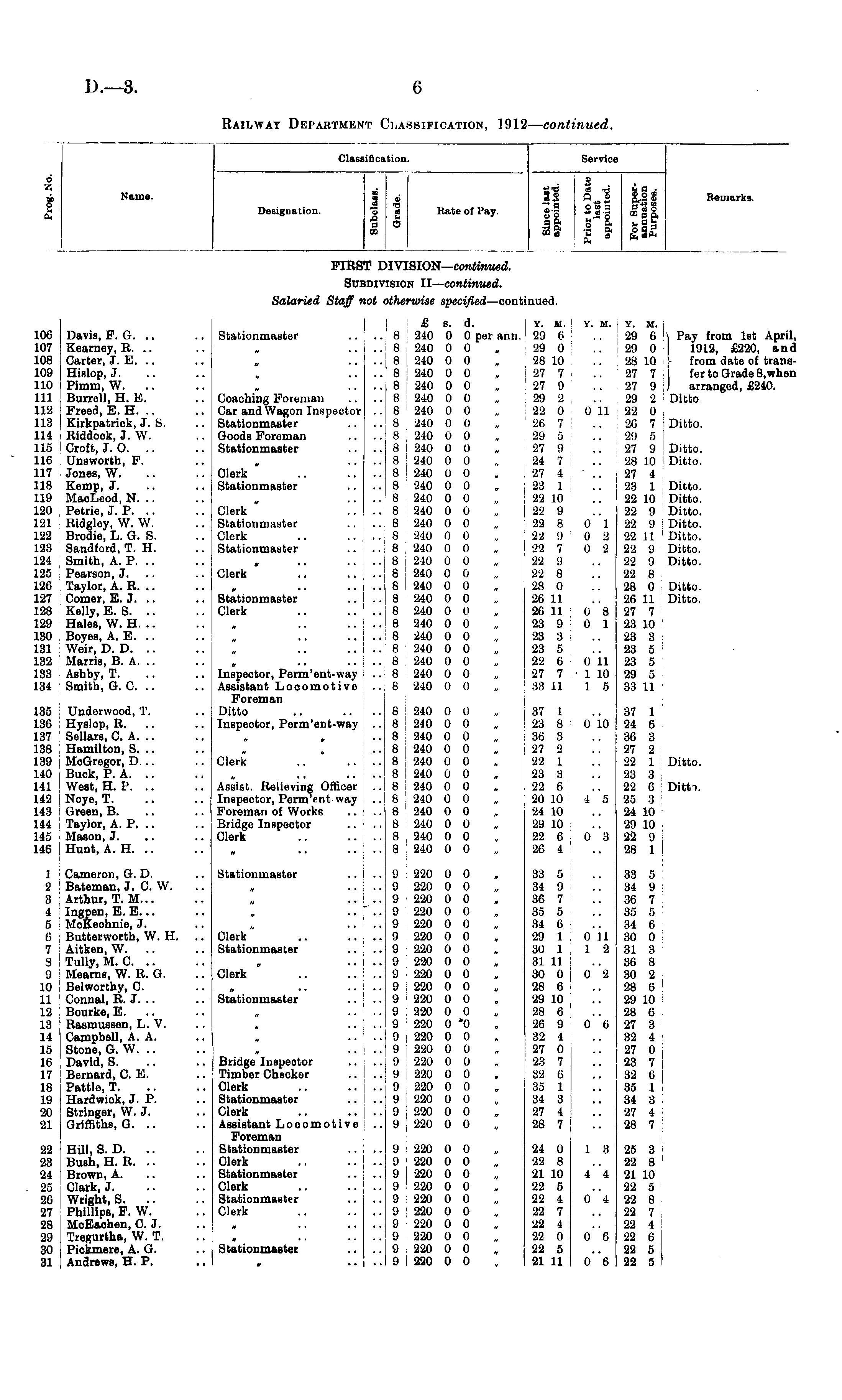 Clasi lifi cation. Service o' 7, $ ft Name. oo I « © 03 a O co 2 . 3S ajs &-2SS ©.a sis .rss go **'5 co sft 3 & oft fa 3 >, 5S& | s- £S5 Remarks. Designation. Rate of Pay. FIRS' iIVISION— continued. Sub IDI' ision II— continued. Salaried Staff n IO* jtherwise specified —cont: inued. 106 107 108 109 110 111 112 113 114 115 116 117 118 119 120 121 122 123 124 125 126 127 128 129 130 131 132 183 134 Davis, F. G. Kearney, R. .. Carter, J. E. Hislop, J. Pimm, W. Burrell, H. E. Freed, E. H. Kirkpatrick, J. S. Riddook, J. W. Croft, J. O. Unsworth, F. Jones, W. Kemp, 3. MaoLeod, N. .. Petrie, J. P. Ridgley, W. W. Brodie, L. G. 8. Sandford, T. H. Smith, A. P. Pearson, J. Taylor, A. R. .. Comer, E. J. Kelly, E. 8. Hales, W. H. .. Boyes, A. E. Weir, D. D. Marris, B. A. Ashby, T. Smith, G. C. .. Stationmaster Coaching Foreman Car and Wagon Inspector Stationmaster Goods Foreman Stationmaster Clerk Stationmaster Clerk Stationmaster Clerk Stationmaster £ s. d. 8 240 0 0 per ann. 8 240 0 0 8 240 0 0 8 240 0 0 8 240 0 0 8 240 0 0 8 240 0 0 8 240 0 0 8 240 0 0 8 240 0 0 8 240 0 0 8 240 0 0 8 240 0 0 8 240 0 0 8 240 0 0 8 240 0 0 8 240 0 0 8 240 0 0 8 240 0 0 8 240 C 0 8 240 0 0 8 240 0 0 8 240 0 0 8 240 0 0 8 240 0 0 8 240 0 0 8,240 0 0 8 240 0 0 8 240 0 0 I Y, K. I Y. M. j Y. M. 29 6 29 6 \ Pay from 1st April, 29 0 .. 29 0 1912, £220, and 28 10 .. 28 10 !- from date of trans27 7 .. 27 7 i fer to Grade 8,when 27 9 .. 27 9 J arranged, £240. 29 2 29 2 Ditto. 22 0 0 11 22 0 26 7 .. 26 7 Ditto. 29 5 .. 29 5 27 9 .. 27 9 Ditto. 24 7 .. 28 10 ! Ditto. 27 4 ' .. j 27 4 | 23 1 j .. 23 1 Ditto. 22 10 .. ; 22 10 Ditto. 22 9 .. 22 9 Ditto. 22 8 0 1 22 9 Ditto. 22 9 0 2 22 11 Ditto. 22 7 0 2 22 9 Ditto. 29 9 .. 22 9 Ditto. 22 8 .. 22 8 28 0 .. 28 0 Ditto. 26 11 .. 26 11 Ditto. 26 11 0 8 27 7 23 9 0 1 23 10 23 3 .. 23 3 23 5 .. 23 5 22 6 0 11 23 5 27 7 • 1 10 29 5 33 11 15 33 11 Clerk 0 • • •. Stationmaster Clerk 3 Inspector, Perm'ent-way Assistant Looomotive Foreman Ditto Inspector, Perm'ent-way 135 136 137 138 139 140 141 142 143 144 145 146 Underwood, T. Hyslop, R. Sellars, 0. A. Hamilton, S. .. MoGregor, D. .. Buok, P. A. West, H. P. Noye, T. Green, B. Taylor, A. P. Mason, J. Hunt, A. H. .. 8 240 0 0 8 | 240 0 0 8 240 0 0 8 240 0 0 8 240 0 0 8 240 0 0 8 240 0 0 8 ' 240 0 0 8 240 0 0 8 240 0 0 8 240 0 0 8 240 0 0 .._ 3 __ 3 I Clerk Assist. Relieving Officer Inspector, Perm'ent way Foreman of Works Bridge Inspector Clerk 37 1 .. 37 1 23 8 0 10 24 6 36 3 .. 36 3 27 2 .. 27 2 22 1 .. 22 1 Ditto. 23 3 .. 23 3 22 6 .. 22 6 Ditt->. 20 10 4 5 25 8 24 10 .. 24 10 29 10 .. 29 10 22 6 0 3 22 9 26 4 .. 28 1 0 • • .. 1 2 3 4 5 6 7 3 9 10 11 12 13 14 15 16 17 18 19 20 21 Cameron, G. D, Bateman, J. C. W. Arthur, T. M... Ingpen, E.E... McKechnie, J. Butterworth, W. H. Aitken, W. .. Tully, M. C .. Mearns, W. R. G. Belworthy, 0. Connal, R. J. Bourke, E. Rasmussen, L. V. Campbell, A. A. Stone, G. W. .. David, S. Bernard, C. E. Pattlo, T. Hardwick, J. P. Stringer, W. J. Griffiths, G. .. Stationmaster Clerk" Stationmaster Clerk Stationmaster 9 220 0 0 9 220 0 0 9 220 0 0 9 220 0 0 9 220 0 0 9 220 0 0 9 220 0 0 9 220 0 0 9 i 220 0 0 9 j 220 0 0 9 I 220 0 0 9 | 330 0 0 9 I 220 0 *0 9 220 0 0 9 220 0 0 9 220 0 0 9 220 0 0 9 220 0 0 9 ! 220 0 0 9 i 220 0 0 9 220 0 0 33 5 .. 33 5 34 9 .. 34 9 36 7 .. 36 7 35 5 .. 35 5 34 6 .. 34 6 29 1 0 11 30 0 30 1 1 2 31 3 31 11 .. 36 8 30 0 0 2 30 2 28 6 .. 28 6 29 10 .. 29 10 28 6 .. 28 6 26 9 0 6 27 3 82 4 .. 32 4 : 27 0 .. 27 0 23 7 .. 23 7 32 6 .. 32 6 35 1 .. 35 1 34 3 .. 34 3 27 4 .. 27 4 28 7 .. 28 7 Bridge Iuspeotor Timber Checker Clerk Stationmaster Clerk Assistant Looomotive Foreman Stationmaster Clerk Stationmaster Clerk Stationmaster Clerk 22 23 24 25 26 27 28 29 30 31 Hill, 8. D. Bush, H. R. Brown, A. Clark, J. Wright, S. .. Phillips, F. W. McEabhen, 0. J. Tregurtha, W. T. Pickmere, A. G. Andrews, H. P. 9 220 0 0 9 220 0 0 9 220 0 0 9 220 0 0 9 220 0 0 9 220 0 0 9 220 0 0 9 220 0 0 9 220 0 0 9 220 0 0 24 0 1 3 25 3 22 8 .. 22 8 21 10 4 4 21 10 22 5 .. 22 5 22 4 0 4 22 8 22 7 .. 22 7 22 4 .. 22 4 22 0 0 6 22 6 22 5 .. 22 5 , 21 11 0 6 22 5 I Stationmaster