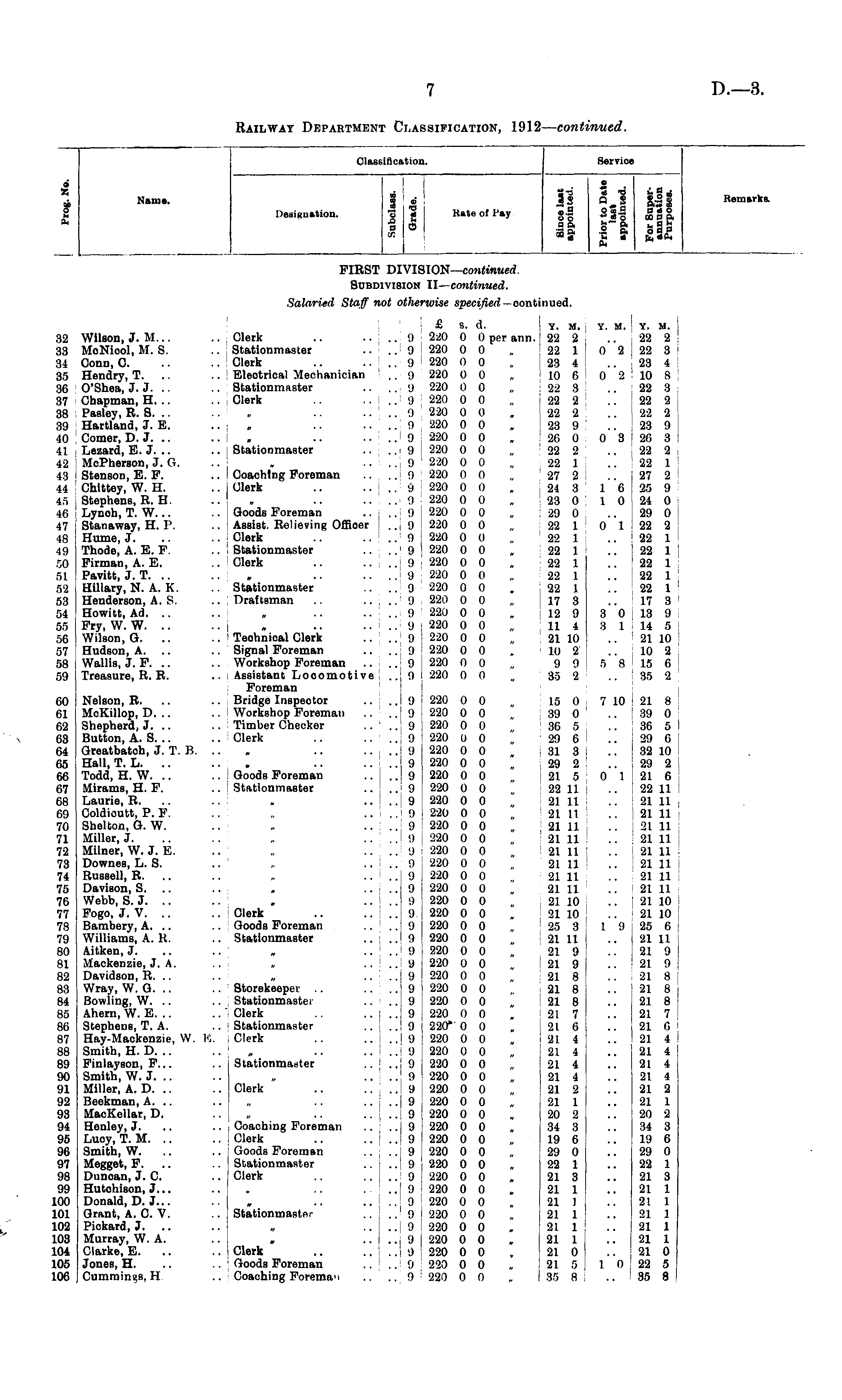Classincatioi Service 6 Z $ fa 3. Name. Designation. I 4 •3 A. to Rate of Pay J2 a, 3 o o 3 Q« Li in O to 2 p 9 O ** * o cc P P. ■2"S sgs fa © fe-ft Hem ark 1 FIRST DIVIS Subdivision SION— continued. t II— continued. Salaried Staff not othei rwise specified - continued. 32 Wilson, J. M... .. Clerk .. .. .. 9 33 McNiool, M. S. .. Stationmaster .. .. 9 34 Conn, O. .. .. Clerk .. .. 9 35 Hendry, T. .. .. Electrical Mechanician .. 9 36 O'Shea, J. J. .. .. Stationmaster .. .. 9 37 Chapman, H. .. .. Clerk .. .. .. 9 38 Pasley, R. 8. .. . .. .... 9 39 Hartland, J. E. .. . .. .... 9 40 '. Comer, D. J. .. „ .. .... 9 41 Lezard, E. J. .. .. Stationmaster .. ..9 42 McPherson, J. G. „ .... 9 43 i Stenson, E. P. .. I Coaching Foreman .. .. 9 ! 44 Chittey, W. H. .. j Clerk .. .. .. 9 45 Stephens, R. H. .. „ .. .... 9 46 Lynoh, T. W. .. .. Goods Foreman .. ..9 47 Stanaway, H. P. .. Assist. Relieving Offioer .. 9 48 Hume, J. .. .. Clerk .. .. 9 49 Thode, A. E. F. .. Stationmaster .. ..9 50 Firman, A. E. .. Clerk .. ..9 51 Pavitt, J. T. .. 3 .. .... 9 52 Hillary, N. A. K. Stationmaster .. ..9 53 Henderson, A. S. .. Draftsman .. .... 9 , 54 Howitt, Ad. .. „ .. .... 9 ! 55 Fry, W. W. .. .. » .. .... 9 56 Wilson, G. .. .. Teohnical Clerk .. .. 9 57 Hudson, A. .. .. Signal Foreman ..' .. 9 58 Wallis, J. P. .. .. Workshop Foreman .. .. 9 59 Treasure, R. R. .. Assistant Looomotive .. 9 Foreman 60 Nelson, R. .. .. Bridge Inspector ..9 61 McKillop, D. .. .. Workshop Foreman .. 9 62 Shepherd, J. .. .. Timber Checker .. .. 9 ] 63 Button, A. S. .. .. Clerk .. .. .. 9 I 64 Greatbatoh, J. T. B. .. „ .. .... 9 65 Hall, T. L. .. . .. .... 9 66 Todd, H. W. .. .. Goods Foreman .. ..9 67 Mirams, H. P. .. Stationmaster .. .. 9 68 Laurie, R. .. . .... 9 69 Coldicutt, P. F. .. „ ... 9 70 Shelton, G. W. .. » .... 9 71 Miller, J. .. .. „ .... 9 72 Milner, W. J. E. .. „ .... 9 73 Downes, L. S. .. „ .... 9 74 Russell, R. .. .. „ .... 9 75 DaviBon, S. .. .. , .... 9 76 Webb, S.J. .. . .... 9 77 Pogo, J. V. .. .. Clerk .. .. .. 9 78 Bambery, A. .. Goods Foreman .. 9 79 Williams, A. R. .. Stationmaster .. ..9 80 Aitken, 3. .. „ .... 9 81 Mackenzie, J. A. „ .... 9 82 Davidson, R. .. .. „ .... 9 83 Wray, W. G. .. .. Storekeeper .. .. 9 84 Bowling, W. .. Stationmaster .. ..9 85 Ahem, W. E. .. .. Clerk .. .. 9 86 Stephens, T. A. Stationmaster .. .. 9 87 Hay-Mackenzie, W. B. Clerk .. .. ..9 88 Smith, H. D. .. .. „ .. .... 9 89 Finlayson, F... .. Stationmaster .. ..9 90 Smith, W. J. .. .. „ .... 9 91 Miller, A. D. .. .. Clerk .. .. .. 9 92 Beekman, A. .. .. „ .. .... 9 93 MacKellar, D. .. „ .. .... 9 94 Henley, J. .. .. Coaching Foreman .. .. 9 95 Lucy, T. M. .. .. Clerk .. .. .. 9 96 Smith, W. .. .. Goods Foreman .. .. 9 97 Megget, F. .. .. Stationmaster .. .. 9 98 Duncan, J. C. .. Clerk .. .. 9 99 Hutohison, J... .. . .. .... 9 100 Donald, D. J... .. » .. .... 9 101 Grant, A. 0. V. .. Stationmaster .. .. 9 102 Pickard, J. .. .. „ .... 9 I 103 Murray, W. A. .. . .... 9 104 Clarke, E. .. .. Clerk .. .. .. 9 105 Jones, H. .. Goods Foreman .. 9 106 Cumminos, H Coaching Foreman ..9 £ s. d. y. m. Y. 5i. 220 0 0 per ann. 22 2 220 0 0 „ 22 1 0 2 220 0 0 » 23 4 220 0 0 „ 10 6 0 2 220 0 0 „ 22 3 220 0 0 „ i 22 2 220 0 0 . 22 2 220 0 0 , 23 9 220 0 0 „ 26 0 0 8 220 0 0 „ 22 2 220 0 0 „ 22 1 220 0 0 „ -27 2 220 0 0 . 21 3 1 6 220 0 0 „ 23 0 1 0 220 0 0 „ 29 0 220 0 0 „ 22 1 0 1 220 0 0 „ 22 1 220 0 0 , 22 1 220 0 0 „ 22 1 220 0 0 ,. 22 1 220 0 0 . 22 1 220 0 0 , 17 3 220 0 0 . 12 9 3 0 220 0 0 „ 11 4 3 1 220 0 0 „ 21 10 220 0 0 , 10 2 220 0 0 „ 9 9 5 8 220 0 0 . 35 2 Y. 51. 22 2 22 3 23 4 10 8 22 3 22 2 22 2 23 9 26 3 22 2 22 1 27 2 25 9 24 0 29 0 22 2 22 1 22 1 22 1 22 1 22 1 17 3 13 9 14 5 21 10 10 2 15 6 35 2 220 0 0 „ 15 0 7 10 220 0 0 39 0 : 220 0 0 36 5 1 220 0 0 29 6 220 0 0 , 31 3 220 0 0 „ 29 2 220 0 0 „ 21 5 0 1 220 0 0 22 11 220 0 0 . 21 11 220 0 0 . 21 11 220 0 0 „ 21 11 220 0 0 „ 21 11 220 0 0 , 21 11 220 0 0 „ 21 11 220 0 0 , 21 11 220 0 0 „ 21 11 220 0 0 „ 21 10 220 0 0 „ 21 10 220 0 0 „ 25 3 1 9 220 0 0 , 21 11 220 0 0 „ 21 9 220 0 0 „ 21 9 220 0 0 „ 21 8 i 220 0 0 , 21 8 220 0 0 „ 21 8 220 0 0 , 21 7 220* 0 0 „ 21 6 220 0 0 3 21 4 220 0 0 „ 21 4 220 0 0 „ 21 4 220 0 0 „ 21 4 220 0 0 „ 21 2 220 0 0 „ 21 1 220 0 0 „ 20 2 220 0 0 , 34 3 220 0 0 „ 19 6 220 0 0 „ 29 0 220 0 0 „ 22 1 220 0 0 „ 21 3 220 0 0 . 21 1 220 0 0 , 21 1 220 0 0 „ 21 1 220 0 0 . 21 1 220 0 0 . 21 1 220 0 0 , 21 0 220 0 0 21 5 1 0 220 0 0 „ I 35 8 21 8 39 0 36 5 29 6 32 10 29 2 21 6 22 11 21 11 21 11 21 11 21 11 21 11 21 11 21 11 21 11 21 10 21 10 25 6 21 11 21 9 21 9 21 8 21 8 21 8 21 7 21 6 21 4 21 4 21 4 21 4 21 2 21 1 20 2 34 3 19 6 29 0 22 1 21 3 21 1 21 1 21 1 21 1 21 1 21 0 22 5 35 8