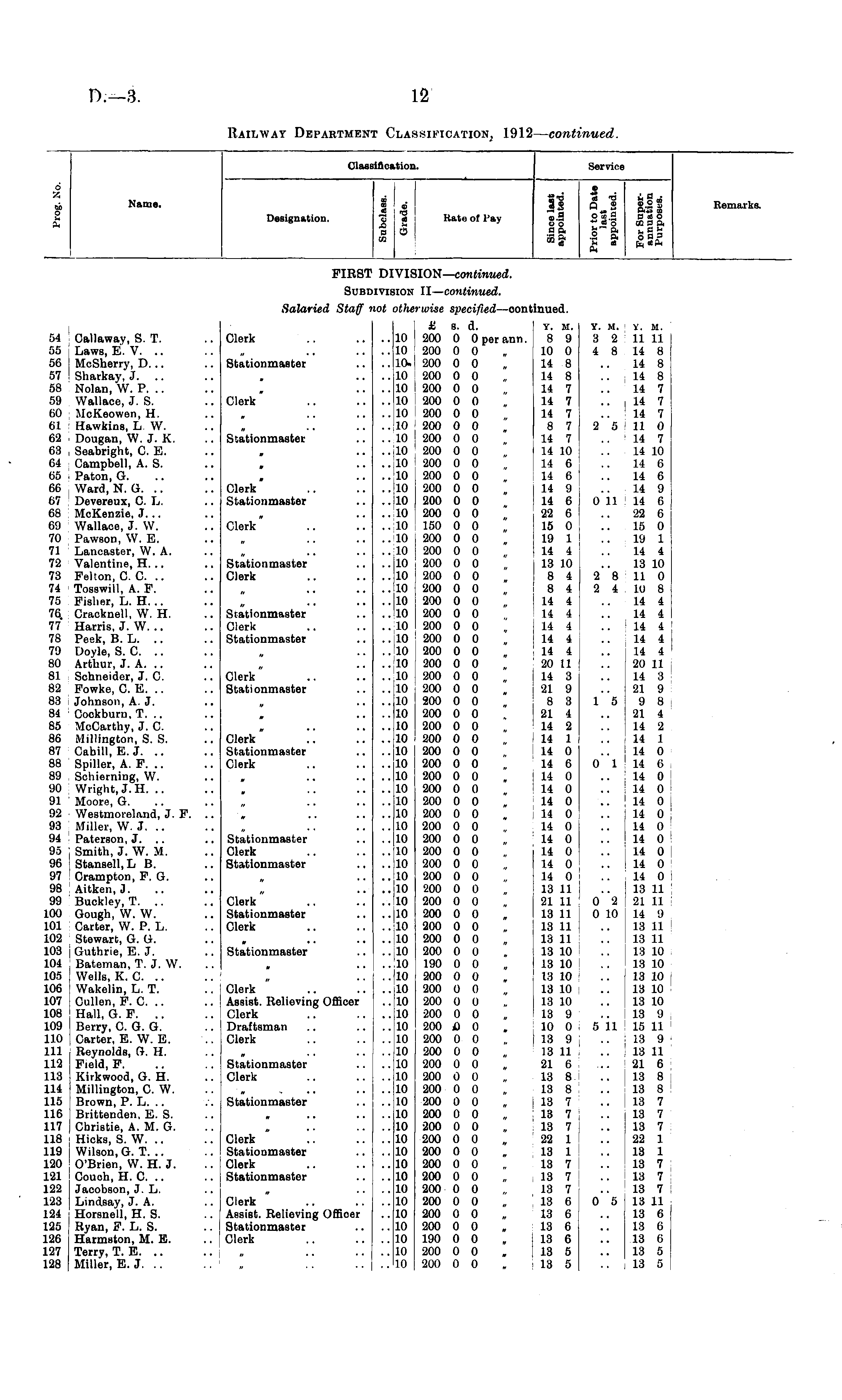 Classiflci ition. Service 6 7, p Name. Designation. to ■ a "o JL\ 3 QQ 3) I i Rate of Pay ■ 213 d 03 i a «.9 ° M 2 S d O OO OQS P< 3 a ,2 a ofl,* 3 92 9 H 9 fc * Ph P". Remarks. FIRST Dl :vi; 3ION — continued. Subdivii ;to> [ II — continued. 54 Callaway, S. T. 55 Laws, E. V. .. 56 McSherry, D. .. 57 ! Sharkay, J. .. 58 Nolan, W. P. .. 59 Wallace, J. S. 60 McKeowen, H. Gl Hawkins, L W. 62 Dougan, W. J. K. 63 , Seabright, CE, 64 Campbell, A. S. 65 Paton, G. 66 Ward.N. G. .. 67 Devereux, C. L. 68 McKenzie, J. .. 69 Wallace, J. W. 70 Pawson, W. E. 71 Lancaster, W. A. 72 Valentine, H. .. 73 Felton, 0. C. .. 74 Tosswill, A. P. 75 Fisher, L. H. .. 76, Cracknell, W. H. 77 Harris, J. W. .. 78 Peek, B. L. .. 79 Doyle, S. C. .. 80 Arthur, J. A. .. 81 Schneider, J. C. 82 Fowke, CE, „ 83 i Johnson, A. J. 84 Cockburn, T. .. 85 McCarthy, J. C 86 Millington, S. S. 87 Cahill, E.J. .. 88 Spiller, A. F. .. 89 Scliierning, W. 90 Wright, J. H. .. 91 Moore, G. 92 Westmoreland, J. P. 93 Miller, W. J. .. 94 Paterson, J. 95 j Smith, J. W. M. 96 I Stansell.L B. 97 ! Crampton, P. G. 98 Aitken, J. 99 Buckley, T. .. 100 Gough, W. W. 101 Carter, W. P. L. 102 Stewart, G. G. 103 > Guthrie, E. J. 104 Bateman, T. J. W. 105 , Wells, K. C. .. 106 ! Wakelin, L. T. 107 Cullen, P. C .. 108 Hall, G. P. .. 109 Berry, C G. G. 110 ! Carter, E. W. E. 111 | Reynolds, G. H. 112 Field, F. 113 Kirkwood, G. H. 114 | Millington, C W. 115 | Brown, P. L. .. 116 Brittenden, E. S. 117 i Christie, A. M. G. 118 Hicks, S. W. .. 119 Wilson, G. T. .. 120 O'Brien, W. H. J. 121 i Couch,H. C. .. 122 Jacobson, J. L. 123 I Lindsay, J. A. 124 Horsnell, H. S. 125 , Ryan, P. L. S. 126 Harmston, M. B, 127 Terry, T. E. .. 128 Miller, E. J. .. Salaried Staff not Clerk Stationmaster Clerk" .. .. .. Stationmaster Clerk" .. '.'. .. Stationmaster Clerk .. .. .. Stationmaster Clerk .. .. .. Stationmaster Clerk .. .. .. Stationmaster Clerk" .. '.'. '.'. Stationmaster Clerk .. .. .. Stationmaster Clerk .. .. .. otht 10 10 10 10 10 10 10 10 10 ,10 10 10 10 10 10 10 10 10 10 :io lio 10 10 10 10 10 10 10 [10 1° fio 10 10 10 10 10 10 10 10 10 10 !10 110 10 10 10 10 10 10 10 10 10 10 10 10 10 10 10 10 10 10 10 10 10 10 10 10 10 10 10 10 10 10 10 10 '.rwise specified — cont £ s. d. 200 0 0 per ann. 200 0 0 200 0 0 200 0 0 200 0 0 200 0 0 200 0 0 200 0 0 . 200 0 0 200 0 0 200 0 0 200 0 0 200 0 0 200 0 0 200 0 0 150 0 0 , 200 0 0 200 0 0 200 0 0 200 0 0 200 0 0 200 0 0 200 0 0 200 0 0 200 0 0 200 0 0 200 0 0 200 0 0 j 200 0 0 1 200 0 0 200 0 0 200 0 0 200 0 0 200 0 0 200 0 0 200 0 0 200 0 0 200 0 0 200 0 0 200 0 0 200 0 0 200 0 0 200 0 0 200 0 0 200 0 0 200 0 0 200 0 0 200 0 0 200 0 0 200 0 0 190 0 0 200 0 0 200 0 0 200 0 0 200 0 0 200 a o 200 0 0 200 0 0 200 0 0 200 0 0 200 0 0 200 0 0 200 0 0 200 0 0 200 0 0 200 0 0 200 0 0 200 0 0 200 0 0 200 0 0 200 0 0 200 0 0 190 0 0 200 0 0 200 0 0 tinued. | Y. 51. ! 8 9 10 0 14 8 14 8 14 7 14 7 14 7 8 7 14 7 14 10 14 6 14 6 14 9 14 6 22 6 15 0 19 1 14 4 13 10 8 4 8 4 14 4 14 4 14 4 14 4 14 4 20 11 14 3 I 21 9 ; 8 3 ; 21 4 14 2 14 1 14 0 14 6 1 14 0 14 0 14 0 14 0 14 0 14 0 14 0 14 0 14 0 ' 13 11 21 11 13 11 13 11 18 11 13 10 13 10 13 10 13 10 I 13 10 I 13 9 10 0, I 13 9 13 11 21 6 13 8 13 8 13 7 13 7 13 7 22 1 13 1 13 7 13 7 13 7 13 6 13 6 13 6 13 6 13 5 13 5 Y. 51. Y. 51. 3 2 11 11 4 8 14 8 14 8 14 8 14 7 .. | 14 7 14 7 2 5 11 0 14 7 14 10 14 6 14 6 14 9 0 11 14 6 22 6 15 0 19 1 14 4 13 10 2 8 11 0 2 4 10 8 14 4 14 4 14 4 14 4 14 4 20 11 14 3 21 9 15 9 8 21 4 14 2 14 1 14 0 0 1 14 6 14 0 14 0 14 0 .. 14 0 .. 14 0 .. 14 0 ! 14 0 .. I 14 0 14 0 I 13 11 0 2 21 11 0 10 14 9 13 11 13 11 13 10 13 10 13 10 13 10 13 10 13 9 5 11 15 11 13 9 13 11 21 6 13 8 ; 13 8 13 7 .. 18 7 .. 13 7 .. I 22 1 13 1 13 7 13 7 13 7 0 5 13 11 13 6 13 6 .. 13 6 13 5 13 5 Stationmaster Clerk .. .. .. Stationmaster Clerk .. .. .. Stationmaster Clerk .. .. .. Stationmaster Clerk .. .. .. Assist. Relieving Officer Clerk .. .. .. Draftsman Clerk .. .. .. Stationmaster Clerk .. .. .. Stationmaster Clerk .. .. .. Statioumaster Clerk .. .. .. Stationmaster Clerk .. .. .. Assist. Relieving Officer Stationmaster Clerk .. .. ..