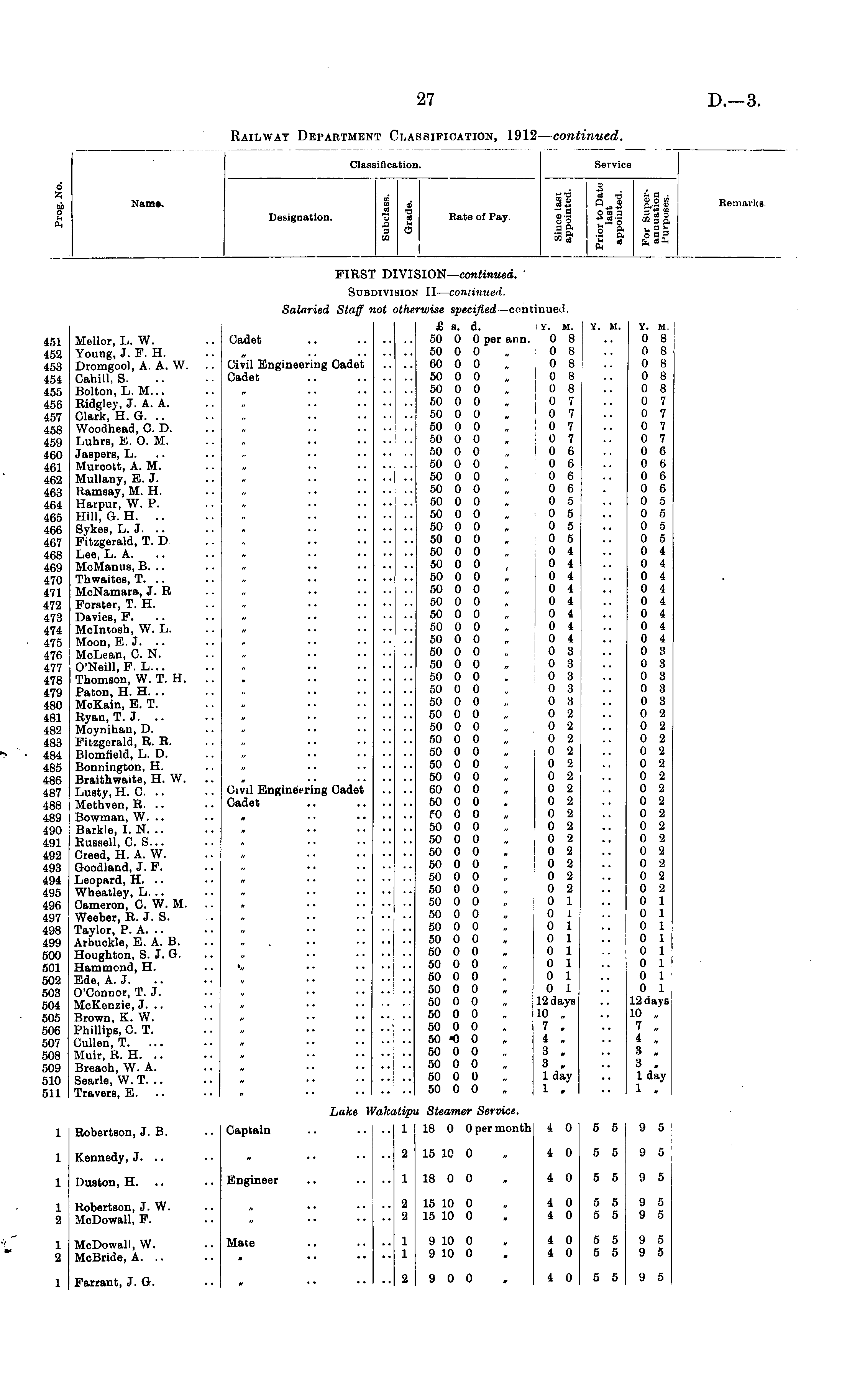 Clas: lifi cation. Service 6 y, Nam*. Designation. m 3 1 Cβ a Rate of Pay. 0) it s J-3 3, S o g; 4) q tn III Remarks. FIRS! 1)] :vii 5ION— continued. Sub IIV1 SlOti II— continued. 451 452 453 454 455 456 457 458 459 460 461 462 463 464 465 466 467 468 469 470 471 472 473 474 475 476 477 478 479 480 481 482 483 484 485 486 487 488 489 490 491 492 493 494 495 496 497 498 499 500 501 502 503 504 505 506 507 508 509 510 511 Mellor, L. W. Young, J. F. H. Dromgool, A. A. W. Cahill, S. Bolton, L. M... Ridgley, J. A. A. Clark, H. G. .. Woodhead, C. D. Luhra, K. O. M. Jaspers, L. Muroott, A. M. Mullany, E. J. Ramsay, M. H. Harpur, W. P. Hill, G. H. .. Sykee, L. J. .. Fitzgerald, T. D Lee, L. A. McManus, B. .. Thwaites, T. .. MeNamara, J. R Forster, T. H. Davies, F. Mclntosta, W. L. Moon, E. J. .. McLean, C. N. O'Neill, F. L... Thomson, W. T. H. Paton, H. H. .. McKain, E. T. Ryan, T. J. .. Moynihan, D. Fitzgerald, R. R. Blomfield, L. D. Bonnington, H. Braithwaite, H. W. Lusty, H. C. Methven, R. .. Bowman, W. .. Barkle, I. N. .. Russell, C. S... Creed, H. A. W. Goodland, J. F. Leopard, H. .. Wheatley, L. .. Cameron, C. W. M. Weeber, R. J. S. Taylor, P. A. .. Arbuokle, E. A. B. Houghton, S. J. G. Hammond, H. Ede, A. J. O'Connor, T. J. MoKenzie, J. .. Brown, K. W. Phillips, C. T. Cullen, T. Muir, R. H. Breach, W. A. Searle, W.T. .. Travers, E. Salaried Staff i Cadet Civil Engineering Cadet Cadet ;ot < )the; 'wise specified —continued. S, s. d. v. m. 50 0 0 per arm. 0 8 50 0 0 „ 0 8 60 0 0 „ 0 8 50 0 0 „ 0 8 50 0 0 „ ! 0 8 50 0 0 „ 0 ! 50 0 0 „ 0 7 50 0 0 . ! 0 7 50 0 0 , '07 50 0 0 „ 10 6 50 0 0 „ 0 6 50 0 0 „ 0 6 50 0 0 „ 0 6 50 0 0 „ 0 5 50 0 0 „ 0 5 50 0 0 „ 0 5 50 0 0 . 0 5 50 0 0 . 0 4 •50 0 0 , 10 4 50 0 0 „ '04 50 0 0 „ 0 4 50 0 0 . 0 4 50 0 0 „ 0 4 50 0 0 „ 0 4 50 0 0 „ 0 4 50 0 0 „ 0 3 50 0 0 „ I 0 3 50 0 0 . 0 3 50 0 0 „ 0 3 50 0 0 „ 0 3 50 0 0 . 0 2 50 0 0 „ 0 2 50 0 0 „ ] 0 2 50 0 0 „ ; 0 2 50 0 0 „ 10 2 50 0 0 „ 0 2 60 0 0 „ 0 2 50 0 0 . 0 2 f0 0 0 „ 0 2 50 0 0 „ 0 2 50 0 0 „ i 0 2 50 0 0 . ' 0 2 50 0 0 „ 0 2 50 0 0 „ I 0 2 50 0 0 „ J 0 2 50 0 0 „ 0 1 50 0 0 „ 0 1 50 0 0 „ 0 1 50 0 0 „ 0 1 50 0 0 „ 0 1 50 0 0 „ 0 1 50 0 0 .. 0 1 50 0 0 . 0 1 50 0 0 „ 12 days 50 0 0 „ 10 , 50 0 0 . 7 . 50 -0 0 „ 4 „ 50 0 0 „ 3 . 50 0 0 „ 3 . 50 0 0 „ 1 day 50 0 0 „ 1 . Y. M. ■• Y. M. 0 8 0 8 0 8 0 8 0 8 0 7 0 7 0 7 0 7 0 6 0 6 0 6 0 6 0 5 0 5 0 5 0 5 0 4 0 4 0 4 0 4 0 4 0 4 0 4 0 4 0 3 0 3 0 3 0 3 0 3 0 2 0 2 0 2 0 2 0 2 0 2 0 2 0 2 0 2 0 2 0 2 0 2 0 2 0 2 0 2 0 1 0 1 0 1 0 1 0 1 0 1 0 1 0 1 12 days 10 „ 7 i ",, 3 . 3 . 1 day 1 . Oivil Engineering Cadet Cadet It • • • • Lake Vi 'ak( ;tip i Steamer Service. 9 5 1 Robertson, J. B. Captain 1 18 0 0 per month 4 0 5 5 1 Kennedy, J. .. 2 15 10 0 . 4 0 5 5 9 5 1 Duston, H. Engineer 1 18 0 0 » 4 0 5 5 9 5 1 2 Robertson, J. W. MoDowall, F. 2 2 15 10 0 „ 4 0 15 10 0 , 4 0 5 5 5 5 9 5 9 5 1 2 McDowall, W. McBride, A. .. Mate 1 1 9 10 0 , 4 0 9 10 0 . 4 0 5 5 5 5 9 5 9 5 1 Farrant, J. G. 2 9 0 0 . 4 0 5 5 9 5