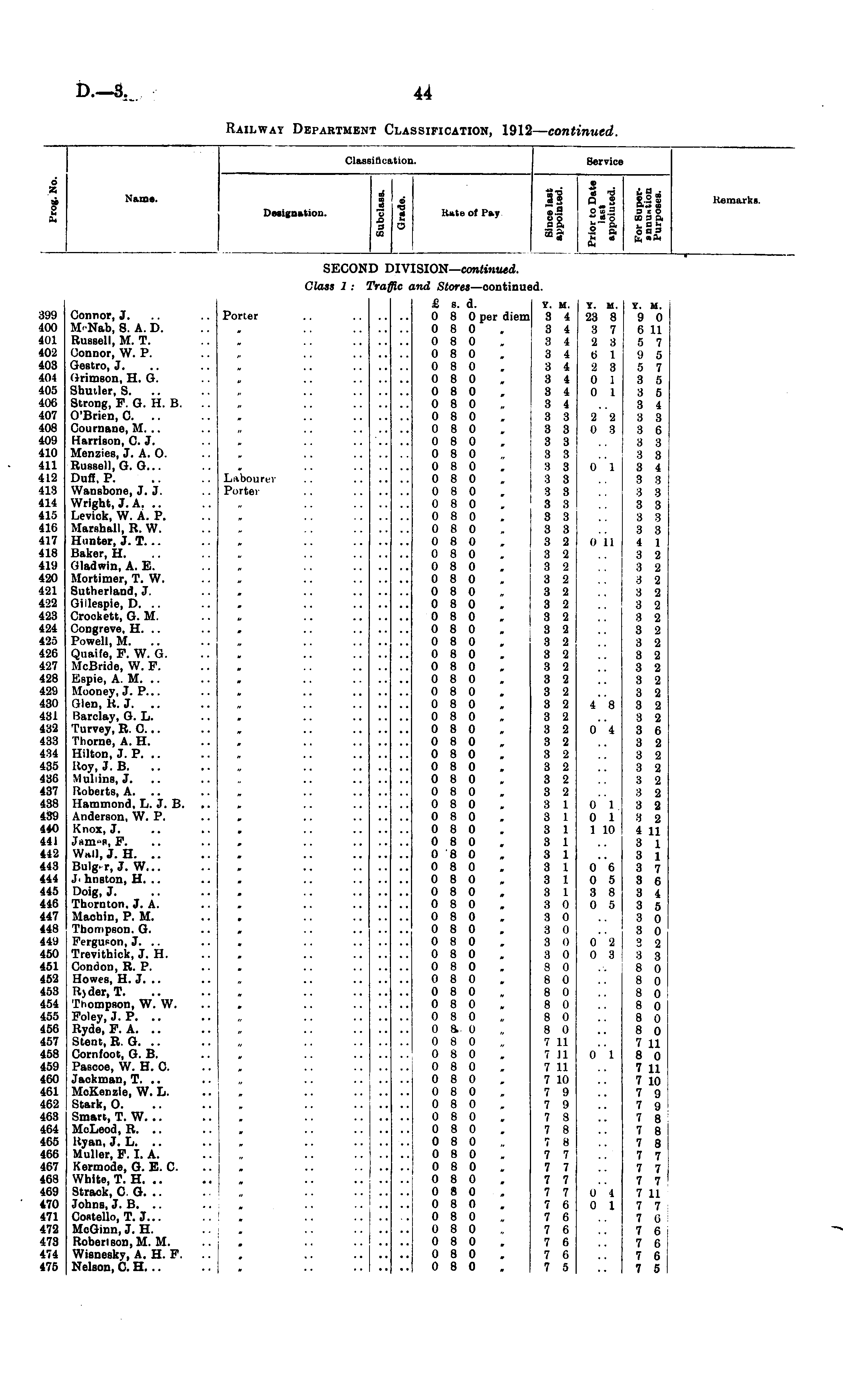 Clasi iiticatiol Service 6 I Name. Designation. fi s « BO it I i 111 a> 9 Ouc2 3*O Remarks. Hate of Pay SECON >iv: :SION— continued. Class 1 : '. Vα, 7c f ,nd Stores —continue id. 399 400 401 402 403 404 405 406 407 408 409 410 411 412 413 414 415 416 417 418 419 420 421 422 423 424 425 426 427 428 429 430 431 432 433 434 435 436 437 438 439 440 441 442 443 444 445 446 447 448 449 450 451 452 453 454 455 456 457 458 459 460 461 462 463 464 465 466 467 468 469 470 471 472 473 474 475 Connor, J. M-Nab, S. A. D. Russell, M. T. Connor, W. P. Gestro, J. (irimson, H. G. Sbutler, S. Strong, P. G. H. B. O'Brien, C. .. Cournane, M. .. Harrison, C. J. Menzies, J. A. O. Russell, G. G... Duff, P. Wansbone, J. J. Wright, J. A. .. Levick, W. A. P. Marshall, R. W. Hunter, J. T. .. Baker, H. Glad win, A. E. Mortimer, T. W. Sutherland, J. Giilespie, D. .. Crockett, G. M. Congreve, H. .. Powell, M. Qnaife, F. W. G. McBride, W. F. Kspie, A.M. Mooney, J. P... Glen, R. J. .. Barclay, G. L. Turvey, E. C... Thome, A. H. Hilton, J. P. .. Hoy, J. B. Muli ins, J. Roberts, A. Hammond, L. J. B. Anderson, W. P. Knox, J. Jam-R, F. WkII.J. H. .. Bulgr, J. W... j< hnston, H. .. Doig, J. Thornton. J. A. Machin, P. M. Thompson. G. Ferguson, J. .. Trevithick, J. H. Condon, R. P. Howes, H. J. .. Rjder, T. Thompson, W. W. Foley, J. P. .. Ryde, F. A. .. Stent, KG. .. Cornfoot, G. B. Pascoe, W. H. C. Jackman, T. .. MoKenzie, W. L. Stark, O. Smart, T. W. .. McLeod, R. .. Kyan, J. L. Muller, F. I. A. Kermode, G. E. C. White, T. H. .. Strack, CO... Johns, J. B. .. Coetello, T. J... McGinn, J. H. Robertson, M. M. Wisneeky, A. H. F. Nelson, C. H. .. Porter Labourer Porter it m £ e. d. 0 8 0 per diem 0 8 0 0 8 0 0 8 0 0 8 0 0 8 0 0 8 0 0 8 0 0 8 0 0 8 0 0 8 0 0 8 0 0 8 0 0 8 0 0 8 0 0 8 0 0 8 0 0 8 0 0 8 0 0 8 0 0 8 0 0 8 0 0 8 0 0 8 0 0 8 0 0 8 0 0 8 0 0 8 0 0 8 0 0 8 0 0 8 0 0 8 0 0 8 0 0 8 0 0 8 0 0 8 0 0 8 0 0 8 0 0 8 0 0 8 0 0 8 0 0 8 0 0 8 0 0 8 0 0 8 0 0 8 0 0 8 0 0 8 0 0 8 0 0 8 0 0 8 0 0 8 0 0 8 0 0 8 0 0 8 0 0 8 0 0 8 0 o a. o 0 8 0 0 8 0 0 8 0 0 8 0 0 8 0 0 8 0 0 8 0 0 8 0 0 8 0 0 8 0 0 8 0 0 8 0 0 8 0 0 8 0 0 8 0 0 8 0 0 8 0 0 8 0 0 8 0 ¥. M. 3 4 3 4 3 4 3 4 3 4 3 4 3 4 3 4 3 8 3 3 3 3 3 3 8 3 8 3 8 3 3 8 3 3 3 3 3 2 3 2 3 2 3 2 3 2 3 2 3 2 3 2 3 2 3 2 3 2 3 2 3 2 3 2 3 2 3 2 3 2 3 2 3 2 3 2 3 2 3 1 3 1 3 1 3 1 3 1 3 1 3 1 3 1 3 0 3 0 3 0 3 0 3 0 8 0 8 0 8 0 8 0 8 0 8 0 7 11 7 II 7 11 7 10 7 9 7 9 7 8 7 8 7 8 7 7 7 7 7 7 7 7 7 0 7 6 7 6 7 6 7 6 7 5 y. h. 23 8 3 7 2 3 ti 1 2 3 0 1 0 1 2 2 0 3 0 1 oil 48 0 4 X. M. 9 0 6 11 5 7 9 5 5 7 3 5 3 5 3 4 3 3 3 6 ■S 3 8 3 3 4 3 3 8 8 3 3 3 3 3 3 4 1 3 2 3 2 3 2 3 2 3 2 8 2 3 2 3 2 3 2 3 2 3 2 3 2 3 2 3 2 3 6 3 2 3 2 3 2 3 2 8 2 3 2 8 2 4 11 3 1 3 1 3 7 3 6 3 4 3 5 3 0 3 0 3 2 8 3 8 0 8 0 8 0 8 0 8 0 8 0 7 11 8 0 7 11 7 10 7 9 7 9 7 8 7 8 7 8 7 7 7 7 7 7 7 11 7 7 7 6 7 6 7 6 7 6 7 5 n 0 1 0 1 1 10 m 0 6 0 5 3 8 0 5 w 0 2 0 3 0 1 v «• 0 i 0 1 • w 0