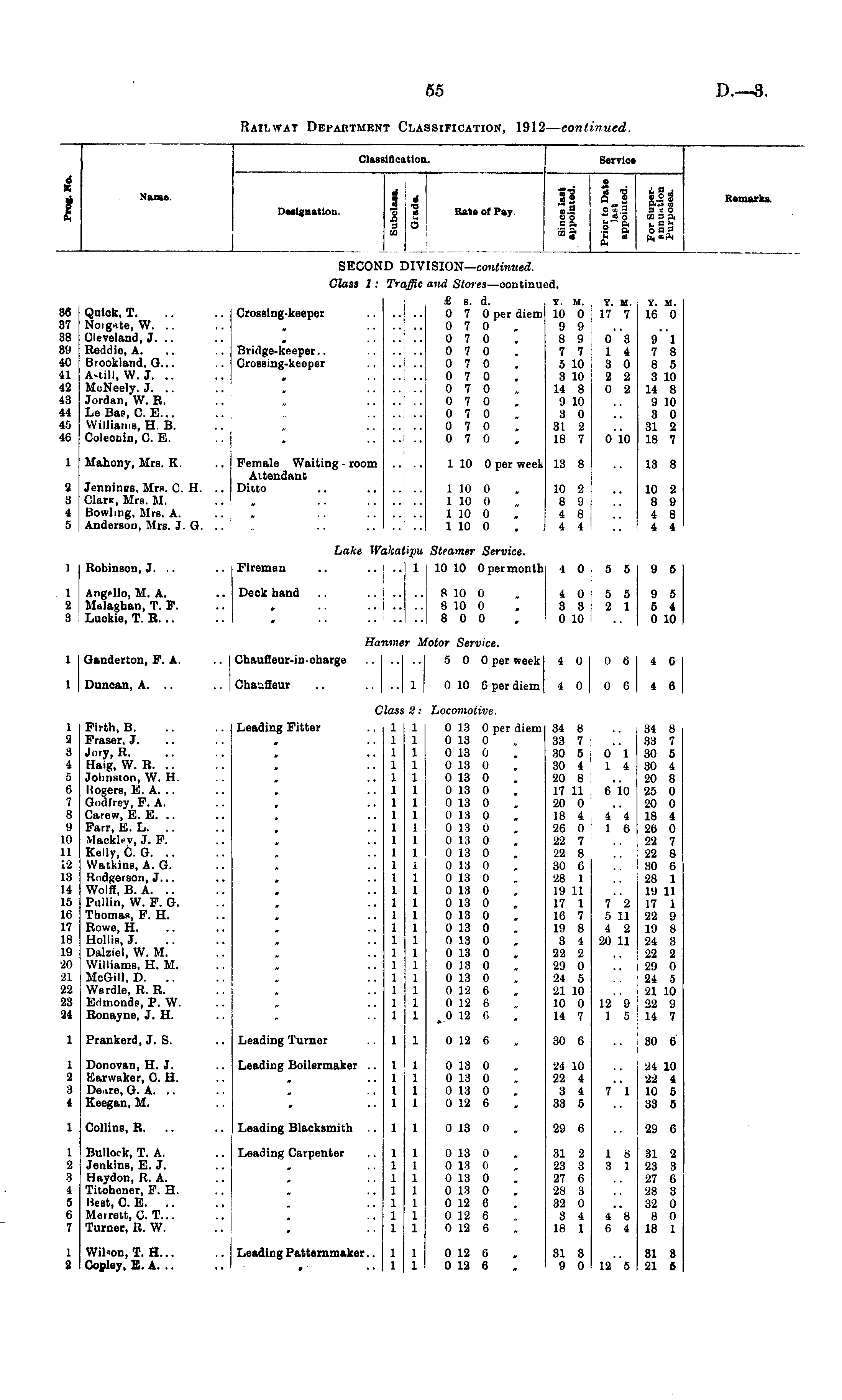Classification. Service 4 X i © Name. | -, || $J$ Designation. o 1 Rats of Pay 13 £j.2 rjfa © a L * o a O a a g-s. « co a .2 a ft Name II 13 o o a a to a « * 4 * S ni a * s.2 8 -J ftfa © o © a 3 = 0 ■fa © o to a a fe~ a fa a fa .2 a oa a fa a ft * ft ft w Remarks. SECOND DIVISION— continued. Class 1 : Traffic and Stores —continued. 36 37 38 89 40 41 42 43 44 45 4G £ s. d. Y. M. Y. M. Quick, T. .. .. Crossing-keeper 0 7 0 per diem 10 0 17 7 Noigate, W. .. .. , 070. 99 Cleveland, J. .. .. . 070. 8908 Reddie, A. .. .. Bridge-keeper.. 070 . 77 14 Brookiand, G... .. Crossing-keeper 070 , 5 10 30 A-till, W. J. .. .. . 070. 3 10 22 McNeely. J. .. .. , 0 7 0 14 8 0 2 Jordan, W. R. .. . .. ..I .. 0 7 0 , 9 10 LeBas, C E... .. , ......070. 30 Williams, H. B. .. „ ...... 0 7 0 . 81 2 Colecnin, C. E. .. . ...... 0 7 0 . 18 7 0 10 Y. M. 16 0 9 1 7 8 8 5 3 10 14 8 9 10 3 0 31 2 18 7 1 Mahony, Mrs. K. .. Female Waiting - room .. .. 1 10 0 per week 13 8 Attendant Jennines, Mrs. C H. .. Ditto .. 1 10 0 . 10 2 Claru, Mrs. M. .. . .. 1 10 0 „ 8 9 Bowling, Mrs. A. . .. 1 10 0 . 4 8 Anderson, Mrs. J. G. .. „ .. 1 10 0 . 4 4 13 8 2 3 4 5 10 2 8 9 4 8 4 4 1 1 2 3 Lake Wakatipu Steamer Service. Robinson, J. .. .. Fireman .. .. ..1 10 10 Opermonth 4 0 5 5 Angello, M. A. .. Deck hand .. 8 10 0 , 4055 Malaghan, T. F. .. . .. 8 10 0 . 83:21 Luckie, T. R. .. .. . .. 8 0 0 . 0 10 9 5 9 5 5 4 0 10 Hanmer Motor Service. 1 1 Ganderton, F. A. .. Chauffeur-in-charge 5 0 0 per week 4 0 0 6 Duncan, A. .. .. Chauffeur .. .. .. 1 0 10 6 per diem 4 0 0 6 1 4 6 4 6 Class 2: Locomotive. 2: 34 8 33 7 30 5 30 4 20 8 25 0 20 0 18 4 26 0 22 7 22 8 30 6 28 1 19 11 17 1 22 9 19 8 24 3 22 2 29 0 24 5 21 10 22 9 14 7 1 2 8 4 5 6 7 8 9 10 11 12 13 14 15 16 17 18 19 2(1 21 22 23 24 Firth, B. .. .. Leading Fitter 1 1 0 13 0 per diem 34 8 Fraser. J. .. , .. 1 1 0 13 0 33 7 .. Jory, R. .. .. . ..11 0 13 0 „ 30 5 0 1 Haig, W. R. .. .. . ..11 0 13 0 , 30 4 ' 1 4 Johnston, W. H. . ..11 0 13 0 20 8 Rogers, E. A. .. .. . ..11 0 13 0 17 11 6 10 Godfrey, F. A. .. , ..11 0 13 0 20 0 Carew, E. E. .. .. . ..11 0 13 0. 18 444 Farr, E. L. .. .. . ..11 0 13 0 26 0 ' 1 6 Macklev, J. F. .. . ..11 0 13 0 22 7 .. Kelly, C. G. .. .. . ..11 0 13 0 22 8 .. Watkins, A. G. .. , ..11 0 13 0 30 6 Rndgerson, J... .. . .. 1 1 0 13 0 28 1 Wolff, B. A. .. .. . ..11 0 13 0 19 11 Ptillin, W. F. G. .. . .. 1 1 0 18 0 17 172 Thomas, P. H. .. . ..11 0 13 0 16 7 5 11 Rowe, H. .. .. . ..11 0 13 0 19 8 4 2 Hollis, J. .. .. , ..11 0 13 0 8 4 20 11 Dalziel, W. M. .. . ..11 0 13 0 22 2 Williams, H. M. .. . ..11 0 13 0 29 0 McGill, D. .. .. . ..11 0 13 0 24 5 Wardle, R. R. .. . ..11 0 12 6 2110 Edmonds, P. W. .. . ..11 0 12 6 , 10 0 12 9 Ronayne, J. H. .. . 1 1 0 12 6 14 7 1 5 1 1 1 1 1 1 1 1 1 1 1 1 1 1 1 1 1 1 1 1 1 1 1 1 1 Prankerd, J. S. .. Leading Turner ..11 0 12 6 . 30 6 1 30 6 1 2 3 4 Donovan, H. J. Leading Boilermaker ..11 0 13 0 , 24 10 Earwaker, C H. .. . ..11 0 13 0 22 4 De,.re, G. A. .. .. . ..11 0130. 3471 Keegan, M. .. . .. 1 1 0 12 6 . 83 5 1 1 1 1 24 10 22 4 10 5 38 5 1 Collins, R. .. .. Leading Blacksmith ..11 0 13 0 , 29 6 1 29 6 I 2 3 4 5 G 7 Bullock, T. A. .. Leading Carpenter ..11 0 13 0 . 31 2 18 Jenkins, E. J. .. . ..11 0 13 0 23 3 3 1 Haydon, R. A. .. . ..11 0 13 0 27 6 Titohener, P. H. .. . ..11 0 13 0 28 3 Best, C. E. .. .. . ..11 0 12 6 32 0 Merrett, C.T... . ..11 0 12 6. 8448 Turner, R. W, . .. 1 1 0 12 6 18 1 6 4 1 1 1 1 1 1 1 31 2 23 3 27 6 28 3 32 0 8 0 18 1 1 2 Wilson, T. H... .. Leading Patternmaker.. 11 0 12 6 . 31 3 Copley, E. A. .. .. . .. 1 1 012 6 . 9 0 12 5 1 1 31 8 21 5
