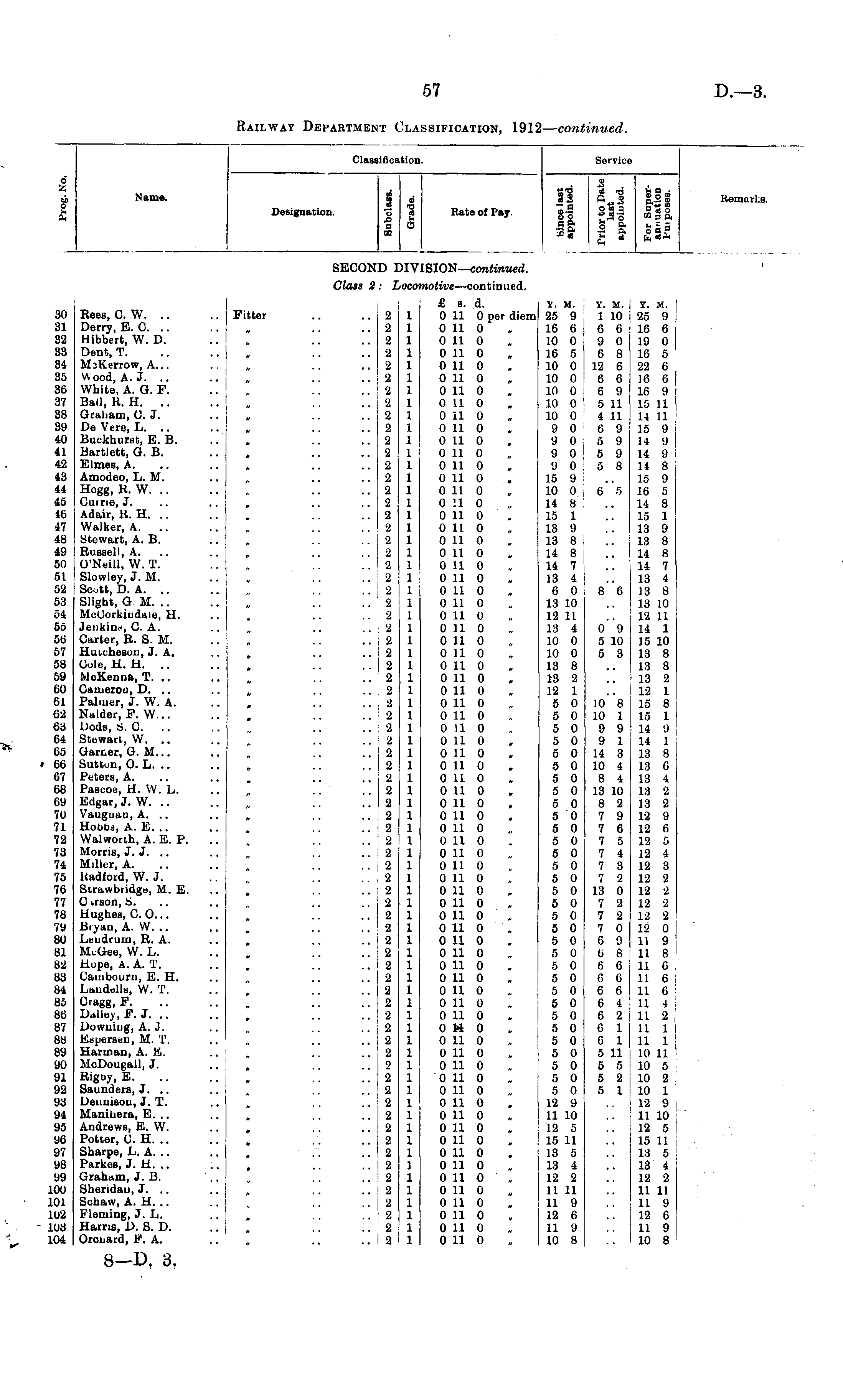 Classification, Service d 2 I Name. I I to i I 5 31 Ij « I I i* a • PI itomiai q. Designation. Rate of Pay. SECON )iv: 8ION— continued. Class 2 ,OCO1 notive —continued. 30 31 32 33 34 35 36 37 38 39 40 41 42 43 44 45 46 47 48 49 50 51 52 53 54 55 5b 57 58 59 GO 61 62 63 64 65 66 67 68 69 70 71 72 73 74 75 76 77 78 7U 80 81 82 83 84 85 86 87 88 89 90 91 92 93 94 95 ye 97 98 99 100 101 102 103 104 Rees, C. W. .. Derry, E. C. .. Hibbert, W. D. Dent, T. MsKerrow, A... V\ ood, A.J. White, A. G. P. Ball, B. H. .. Graham, C. J. Dβ Vere, L. .. Buckhurst, E. B. Bartlett, G. B. Elmes, A. Amodeo, L. M. Hogg, R. W. Gurrie, J. Adair, B. H. .. Walker, A. .. Stewart, A. B. Russell, A. O'Neill, W. T. Slowley, J. M. Sett, D. A. .. Slight, G M. .. MoCorkiudaie, H. Jeiikiu.-, C. A. Carter, R. S. M. Hincheson, J. A. Cole, H. H. .. McKenna, T. .. Cameron, D. .. Palmer, J. W. A. Nalder, P. W... Dods, t>. C. Stewart, W. .. Garner, G. M... Suttwn, O. L. .. Peters, A. Paec-oe, H. W. L. Edgar, J. W. Vauguarj, A. .. Hobbs, A. E. .. Walworth, A. E. P. Morris, J. J. Miller, A. Kadford, W. J. Strawbiidge, M. E. C trson, S. Hughes, G. 0... Biyan, A. W. .. Leudrum, R. A. McUee, W. L. Hope, A. A. T. Cainbourn, E. H. Laudells, VV. T. Cragg, P. JDalle>, P. J. .. Downing, A. J. M. T. Harm an, A. K. McDougall, J. Rigoy, E. Saunders, J. .. Deniiisoii, J. T. Maniuera, E. .. Andrews, E. W. Potter, G. H. Sharpe, L. A. .. Parkes, J. H. .. Graham, J. B. Sheridan, J. .. Sohaw, A. H. .. Fleming, J. L. Harris, D. S. D. Orcuard, B\ A. Fitter H tr n II m i m i •• .. 2 2 2 2 2 2 2 ■2 2 2 2 2 2 2 ■2 2 2 ■J 2 2 2 ■2 2 2 2 2 2 2 2 2 2 2 2 2 2 2 2 2 2 2 2 2 2 2 2 2 2 2 2 2 2 2 2 2 2 2 2 2 2 2 2 2 2 2 2 2 2 2 2 2 2 2 2 2 1 1 1 1 1 1 1 1 1 1 1 1 1 1 1 1 1 1 1 1 1 1 1 1 1 1 1 1 1 1 1 1 1 1 1 1 1 1 1 1 1 1 1 1 1 1 1 1 1 1 1 1 1 1 1 1 1 1 1 1 1 1 1 1 1 1 1 1 1 1 1 1 1 1 1 & s. d. 0 11 0 per diem 0 11 0 0 11 0 0 11 0 0 11 0 0 11 0 0 11 0 0 11 0 0 11 0 0 11 0 0 11 0 0 11 0 0 11 0 0 11 0 0 11 0 0 11 0 0 11 0 0 11 0 0 11 0 0 11 0 0 11 0 0 11 0 0 11 0 0 11 0 0 11 0 0 11 0 0 11 0 0 11 0 0 11 0 0 11 0 0 11 0 0 11 0 0 11 0 0 11 0 0 11 0 0 11 0 0 11 0 0 11 0 0 11 0 0 11 0 0 11 0 0 11 0 0 11 0 0 11 0 0 11 0 0 11 0 0 11 0 0 11 0 0 11 0 0 11 0 0 11 0 0 11 0 0 11 0 0 11 0 0 11 0 0 11 0 0 11 0 0 14 0 0 11 0 0 11 0 0 11 0 0 11 0 0 11 0 0 11 0 0 11 0 0 11 0 0 11 0 0 11 0 0 11 0 0 11 0 0 11 0 0 11 0 0 11 0 0 11 0 0 11 0 Y. M. 25 9 16 6 10 0 16 5 10 0 10 0 10 0 10 0 10 0 9 0 9 0 9 0 y o 15 9 10 0 14 8 15 1 13 9 13 8 14 8 14 7 13 4 6 0 13 10 12 11 13 4 10 0 10 0 13 8 13 2 12 1 5 0 5 0 5 0 5 0 5 0 5 0 5 0 5 0 5 0 5 0 5 0 5 0 5 0 6 0 5 0 5 0 5 0 5 0 5 0 5 0 5 0 r> o 5 0 5 0 5 0 5 0 6 0 5 0 5 0 5 0 5 0 6 0 12 9 11 10 12 5 15 11 13 5 13 4 12 2 11 11 11 9 12 6 11 <J 10 8 Y. M. 1 10 6 6 9 0 6 8 12 6 6 6 6 9 5 11 4 11 6 9 5 9 5 9 5 8 6*V> 8"6 0 9 5 10 5 3 10 8 10 1 9 9 9 1 14 3 10 4 8 4 13 10 8 2 7 9 7 6 7 5 7 4 7 3 7 2 13 0 7 2 7 2 7 0 6 9 0 8 (. 6 6 6 6 6 6 4 6 2 G 1 G 1 5 11 5 5 5 2 5 1 Y. M. 25 9 16 6 19 0 16 5 22 6 16 6 16 9 15 11 14 11 15 9 14 <J 14 9 14 8 15 9 16 5 14 8 15 1 13 9 13 8 14 8 14 7 13 4 13 8 13 10 12 11 14 1 15 10 13 8 13 8 13 2 12 1 15 8 15 1 14 y 14 1 13 8 13 G 13 4 18 2 13 2 12 y 12 6 12 5 12 4 12 3 12 2 12 2 12 2 12 2 12 0 11 9 11 8 11 6 11 6 11 6 11 4 11 2 11 1 11 1 10 11 10 5 10 2 10 1 12 9 11 10 12 5 15 11 13 5 13 4 12 2 11 11 11 9 12 6 11 9 10 8 • * I