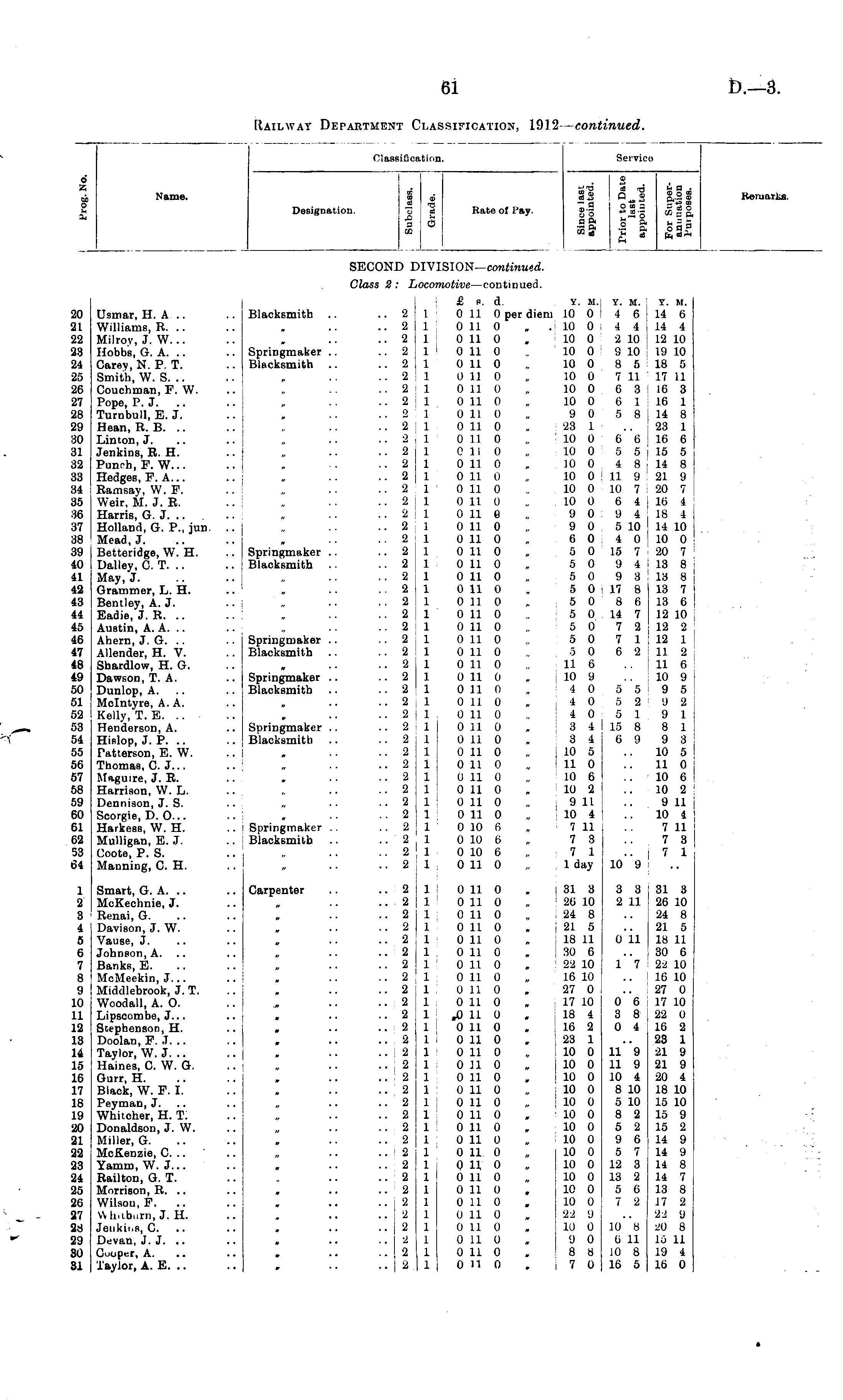 Clasi .ifj cation. Servico 6 Name. I 2 Rate of I'ay. D s≤ p≤ ii i 1 ! u a ■ 0>o5 = o n a ft Koiuarl.s. Designation. SECOND )IVISION— continued. Class 2 : J locomotive —continued. 20 ■21 22 ■23 2-1 25 26 27 28 29 80 81 32 33 84 35 86 87 38 89 40 41 42 43 44 45 46 47 48 49 50 51 52 58 54 55 5G 57 58 59 60 Gl 63 58 61 Usmar, H. A .. Williams, R. .. Milroy, J. W. .. Hobbs, G. A. Carey, N. P, T. Smith, W. S. .. Couchman, F. W. Pope, P. J. Turnbull, E. J. Hean, R. B. Linton, J. Jenkins, R. H. Punch, P. W... Hedges, F. A... Ramsay, W. F. Weir. M. J. R. Harris, G. J. .. . Holland, G. P., jun. Mead, J. Betteridge, W. H. Dalley, C. T. May, J. Grammer, L. H. Bentley, A. J. Eadie, J. R. .. Austin, A. A. Ahern, J. G. Allender, H. V. Sbardlow, H. G. Dawson, T. A. Dunlop, A. Molntyre, A. A. Kelly, T. E. .. Henderson, A. Hislop, J. P. .. Patterson, E. W. Thomas, C. J... Maguire, J. R. Harrison, W. L. Dennison, J. S. Scorgie, D. O... Harkess, W. H. Mulligan, E. J. Coote, P. S. Manning, C. H. .. Blacksmith .. .. Springmaker .. .. Blacksmith Springmaker .. .. Blacksmith .. Springmaker .. .. Blacksmith .. .. Springmaker .. .. Blacksmith .. Springmaker .. .. Blacksmith .. m .. .. Springmaker .. .. Blacksmith .. 2 .. 2 .. 2 .. 2 .. 2 .. 2 .. 2 .. 2 2 '.'. 2 .. 2 .. 2 .. 2 .. 2 .. 2 .. 2 .. 2 .. 2 .. 2 .. 2 .. 2 .. 2 .. 2 .. 2 .. 2 .. 2 .. 2 .. 2 .. 2 .. 2 .. 2 .. 2 .. 2 .. 2 .. 2 .. 2 .. 2 .. 2 .. 2 :: \ .. 2 .. 2 .. 2 .. 2 £ p. d. y. H.j y. m. y. m. 1 0 110 per diem 10 0 4 6 14 6 1 0 11 0 . . 10 0 4 4 14 4 1 0 11 0 „ 10 0 2 10 i 12 10 1 0 11 0 . 10 0 9 10 19 10 1 0 11 0 „ 10 0 8 5 18 5 1 0 11 0 „ 10 0 7 11 17 11 1 0 11 0 „ 10 0 G 3 16 3 1 0 11 0 . 10 0 6 1 16 1 1 0 11 0 . 9 0 5 8 j 14 8 1 0 11 0 , 23 1 .. 23 1 1 0 11 0 „ 10 0 6 6 16 6 1 0 110 „ 10 0 5 5 i 15 5 1 0 11 0 . 10 0 4 8 j 14 8 1 0 11 0 „ 10 0 11 9 21 9 I , Oil 0 „ 10 0 10 7 20 7 1 0 11 0 ,. 10 0 6 4 i 16 4 1 0 116 ., 'J 0 'J 4 18 4 1 0 11 0 .. 9 0 5 10 i 14 10 1 0 11 0 ., 6 0 4 0 10 0 1 0 11 0 „ 5 0 15 7 20 7 1 0 11 0 „ 5 0 9 4 I 13 8 1 0 11 0 , 5 0 9 3 13 8 1 0 11 0 » 5 0 17 8 13 7 1 0 110 . 50 86 13 6 1 0 11 0 „ 5 0 14 7 12 10 1 0 11 0 „ 5 0 7 2 12 2 1 0 11 0 . 5 0 7 1 ; 12 1 1 0 11 0 „ .5 0 6 2 ; 11 2 1 0 11 0 „ 11 6 .. 11 6 1 0 11 0 . j 10 9 .. 10 9 1 0 110 , 40 5 5 9 5 1 0 11 0 . 4 0 5 2 9 2 1 0 110 ., 40 5191 1 0 110 . 3 4 15 8 8 1 1 0 11 0 , 3 4 6 9 9 3 1 0 11 0 „ i 10 5 .. 10 5 1 0 110 „ 11 0 .. 11 0 1 0 11 0 „ 10 6 .. 10 6 1 0 11 0 . 10 2 .. 10 2 1 0 11 0 „ j 9 11 .. 9 11 1 0 11 0 . 10 4 .. 10 4 1 0 10 l> . 7 11 . . 7 11 1 0 10 6 „ 7 3 .. 7 3 1 0 10 6 „ 7 1 ..7 1 1 0 110 „ 1 day 10 9 1 '2 8 4 S 6 7 8 0 10 11 12 13 u 15 16 17 18 19 Smart, G. A. .. McKeohnie, J. Renai, G. Davison, J. W. Vause, J. Johnson, A. Banks, E. McMeekin, J... Middlebrook, J. T. Woodall, A. O. Lipsoombe, J... Stephenson, H. Doolan, F. J. .. Taylor, W. J. .. Haines, C. W. G. Gurr, H. Black, W. F. I. Peyman, J. Whitcher, H. T. Donaldson, J. W. Miller, G. McKenzie, 0. .. YamiD, W. J... Railton, G. T. Morrison, R. .. Wilson, F. Whiiburn, J. H. Jenkii.s, C. Devan, J.J. .. Cooper, A. Taylor, A. E. .. .. Carpenter • • -# • • • • m • • • • • • ■ • • n • • • > w • • • ■ • • • .. 2 .. 2 .. 2 .. 2 :: I .. 2 .. 2 .. 2 :: \ .. 2 .. 2 .. 2 .. 2 .. 2 .. 2 .. 2 :: I .. 2 .. 2 .. 2 .. 2 .. 2 .. 2 .. 2 .. a .. 2 .. 2 .. 2 1 0 11 0 , 31 3 3 3 31 3 1 0 11 0 „ ' 26 10 2 11 26 10 1 0 11 0 „ . 24 8 .. 24 8 i: Oil 0 . 21 5 .. 21 5 1 0 11 0 „ 18 11 0 11 18 11 1 0 11 0 , 30 6 .. 30 6 1 Oil 0 . ! 22 10 1 7 22 10 1 0 11 0 . ! 16 10 .. i 16 10 1 0 11 0 , 27 0 .. 27 0 1 0 11 0 , 17 10 0 6 I 17 10 1 ,0 11 0 . 18 4 3 8 ■ j 22 0 1 0 11 0 . 16 2 0 4 i 16 2 1 0 11 0 . 23 1 .. 23 1 1 0 11 0 . 10 0 11 9 21 9 1 0 11 0 . 10 0 11 9 21 9 1 0 11 0 . 10 0 10 4 20 4 1 0 11 0 , 10 0 8 10 18 10 1 0 11 0 „ 10 0 5 10 15 10 1 0 11 0 . 10 0 8 2 15 9 1 0 11 0 , 10 0 5 2 15 2 1 0 11 0 „ 10 0 9 6 14 9 1 ! 0 11 0 „ j 10 0 5 7 14 9 1 0 H 0 „ 10 0 12 3 14 8 1 0 11 0 „ i 10 0 13 2 14 7 1 0 11 0 . 10 0 5 6 13 8 1 0 11 0 , 10 0 7 2 17 2 1 0 11 0 , 22 9 .. 22 9 1 0 11 0 , 10 0 10 8 20 8 1 0 11 0 . 9 0 6 11 15 11 1 0 11 0 . 8 8 10 8 19 4 1 0110 . 7 0 16 5 16 0 il ia 18 14 ie 16 17 18 i'J 50 U
