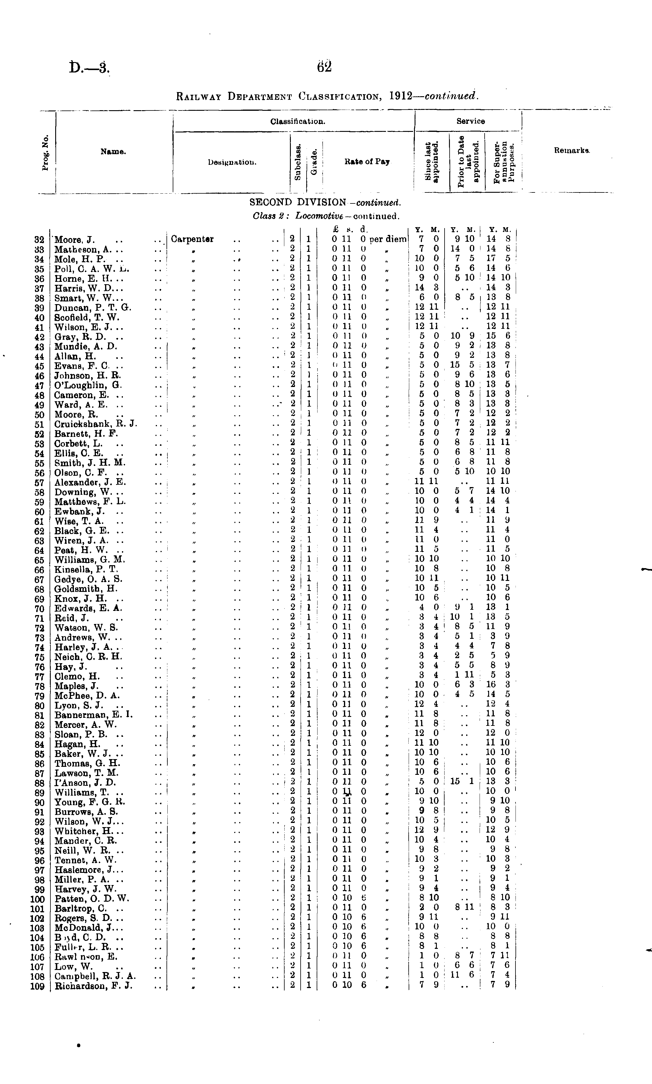 Classification. Service ! *«».. t 41 11 Ij Hi 2 Uesitsimtion. I 1 Kate of Pay g| S g-g £ g ° 1| 5 II f I III SECOND DIVISION -continued. Classification. Service Remarks. Glass H : Locomotive — continued. 32 ;w 84 8fi 86 :!7 88 89 40 11 19 48 44 46 46 47 48 49 .-,o 51 52 53 54 55 56 57 58 59 80 61 62 63 64 65 66 67 68 69 70 71 72 73 74 75 7G 77 78 7!) HO HI 82 88 84 85 86 87 R8 Si) 90 91 92 93 91 95 96 97 98 99 LOO 101 .02 L08 l04 105 LOO L07 108 L00 £ S. d. T. M. Y. M. i Y. M. 52 Moore. J. .. .. Carpenter .. ..2 1 0 11 0 per diem 7 0 9 10 14 8 33 Matheson, A. .. ..' . .. ..2 1 0 11 0 7 0 14 0 14 8 34 I Mole, H. P. .. .. . .. ..2 1 0 11 0 „ 10 0 7 5 17 5 : 35 Poll, 0. A. W. Jj. .. . .. ..21 0 11 0 „ 10 0 5 6 14 6 36 Home, E. H. .. .. . .. ..2 1 Oil 0 , 9 0 5 10 14 10 37 I Harris, W. D... .. ,. .. .21 Oil 0 , 14 3 .. 14 3 38 Smart, W. W... .. . .. ..2 1 0 11 0 . 6 0 8 5 t 13 8 39 Duncan, P. T. G. .. . .. ..2 1 0 11 o . 12 11 .. ,12 11 10 Scofield, T. W. .. . .. ..2 1 0 110 „ 12 11 .. 12 11 tl Wilson, E.J. .. .. . .. .21 Oil U „ 1211 .. 1211 12 Gray, R. D. .. .. . ■. ..2 1 0 11 0 „ 5 0 10 9 15 6 13 i Mundie, A. D. .. . .. ..21 0110 . 5 0 9 2 , 13 8 ! 14 Allan, H. .. .. . .. ..2 1 o 11 0 . 5 0 9 2 13 8 15 Evans, P. C. .. .. . .. ..21 nil II , 5 0 15 5 13 7 16 Jnhnson, H. R. .. . .. ..2 1 0 11 0 „ 5 0 9 6 13 6 17 O'Loughlin, G. .. . .. ..2 1 0 11 0 „ 5 0 8 10 13 5 18 Cameron, E. .. .. . .. ..2 1 o 11 0 ,. 5 0 8 5 13 3 19 Ward, A. E. .. .. . .. .21 0 11 0 „ 5 0 ' 8 8 18 8 50 Moore, R. .. •• . ■■ ..2 1 0 11 0 . 5 0 7 2 12 2 51 Cruicfcshank, R. J. .. . .. ..2 1 Oil 0 „ 5 0 7 2 12 -l 52 Barnett, H. F. .. .. .. ..2 1 0 11 0 .. 5 0 7 2 12 2 53 Corbett, L. .. .. .. •• ..2 1 0 11 0 . 5 0 8 5 11 11 54 Ellis, C. E. .. .. i ,, .. ..2 1 0 11 0 ,. 5 0 6 8 11 8 55 Smith, J. H. M. .. . .. ..2 1 0 11 0 5 0 6 8 11 8 56 Olson, C. F. .. .. ,. .. ..2 1 0 11 0 „ 5 0 5 10 10 10 57 Alexander, J. E. .. . .. ..2 1 0 11 0 1111 ..1111 58 Downing, W. .. .. . • ■ ..21 0110 „ 10 0 5 7 14 10 59 Matthews, F. L. .. „ .. ..2 1 0 11 0 ., 10 0 4 4 14 4 30 Ewbank, J. .. .. „ .. ..2 1 0 11 0 „ 10 0 4 1 14 1 51 I Wise, T. A ,, •• ..2 1 0 11 0 11 9 11 'J 52 Black, G. E. .. .. ., •• ..2 1 0 11 0 . 11 4 .. 11 4 53 Wiren, J. A .. ..2 1 0 11 0 „ 11 0 .. 11 0 34 Peat, H. W. .. .. . .. .. 2 1 Oil 0 , 11 5 .. 11 5 35 Williame, G. M. .. . .. ..21 0 11 0 „ 10 10 .. 10 10 56 Kinsella, P. T. .. „ .. ..2 1 Oil 0 . 10 8 .. 10 8 37 Gedye.O. A. S. .. . .. ..2 1 0 11 0 . 10 11 .. 10 11 38 Goldsmith, H. .. . .. .. 2 1 ! 0 11 0 ,. 10 5 .. 10 5 39 Knox, J. H .. .. 2 1 0 11 0 . 10 6 .. 10 6 70 Edwards, E. A. .. . .. ..HI 0 11 0 . 4 0 9 1 13 1 71 Reid, J. .. .. . • • ..21 0 11 0 „ 3 4 10 1 13 5 72 Watson, W. S. .• ,. .. .. 2 1 0 11 0 . 3 4 i 8 5 11 9 73 Andrews, W... .. . .. ..2 1 0 11 0 „ 3 4 5 13 9 U Harley, J. A. .. .. ,. .. ..21 0 11 0 . 344478 75 Neich, C. R. H. .. . .. ..21 0 11 0 „ 342559 76 Hay J. •• ■■ » ■■ ..2 1 0 11 0 3 4 5 5 8 9 77 Clemo, H. .. • ■ . ■ • ..21 0110 „ 8 4 1 11 5 8 78 Maples, J. .. .. .- • • ..21 0 11 0 „ 10 0 6 3 16 3 79 McPhee, D. A. .. . .. ..2 1 0 11 0 „ 10 0 4 5 14 5 30 Lyon, S. J. .. .. . •■ ..2 1 OHO , 12 4 12 4 31 Bannerman, E. I. .. „ .. ..2 1 0 11 0 , 11 8 .. 11 8 32 Mercer, A. W. .. . •• ..2 1 0 11 0 11 8 11 8 33 Sloan, P. B .. .. 2 1 0 11 0 . 12 0 12 0 34 Hagan, H .. ..2 1 0 11 0 . 1110 .. 1110 35 Baker, W. J .. .. 2 1 0 11 0 „ 10 10 .. 10 10 36 Thomas, G. H. .. . .. ..21 0 11 0 „ 10 6 .. 10 6 37 Lawson, T. M. .. , .. ..21 0 11 0 10 6 10 6 38 I'Anson, J. D. .. . .. ..21 0 11 0 . 6 0 15 1 18 8 39 Williams, T .. ..21 0 U 0 . 10 0 .. 10 0 30 Young, F. G. H .. ..21 0110 „ 9 10 .. 9 10 31 Burrows, A. S. .. . • • ..21 0110 . 98 .. 98 32 Wilson, W.J... .. , ■■ .. 2 1 0 11 0 „ 10 5 j .. 10 5 53 Wbitcher, H .. ..21 0 11 0 . 18 9 .. 12 'J U Mander, C. R. .. . • ■ ..21 0 11 0 „ 10 4 .. 10 4 35 Neill, W. R ■ ■ ..21 0 11 0 . '98 .. 98' )6 Tennet, A. W. .. . .. .21 0 11 0 .. 10 3 .. 10 3 37 Haslemore, J. .. .. . .. ..2 1 0 11 0 9 3 .. 9 2 38 Miller, P. A. .. .. . .. ..21 0 11 0 . 91 .. 91 39 Harvey, J. W. .. . •• ..21 0 11 0 „ 94 9 4 30 Patten, O. D. W. .. . .. .. 2 1 0 10 6 . 8 10 .. 8 10 31 Barltrop, C. .. .. - ■■ ..21 0 110 „ [20 S 11 83 32 Rogers, S. D. .. .. . .. ..21 0 10 6 „ ! 9 11 .. 9 11 33 McDonald, J... .. . .. ..2 1 0 10 6 „ 10 I) .. 10 0 34 B>>d, C. D. .. .. . .. ..21 0 10 6 . j 8 8 .. 88 35 FulUr, L. R. .. .. . .. ..21 0 10 6 . !81 .. 81 j6 Rawl n-on, E. .. . .. ..2 1 oil 0 .. ! 1 0 8 7 7 11 37 Low, W. .. .. ., ■• ..2 1 0 11 0 » 10 6 6 7 6 38 Campbell, R. J. A. .. „ .. ..2 1 0 11 0 „ 1 0 ; 11 6 , 7 4 39 Richardson, F. J. .. . .. ..21 0 10 6 . | 7 9 ..[79