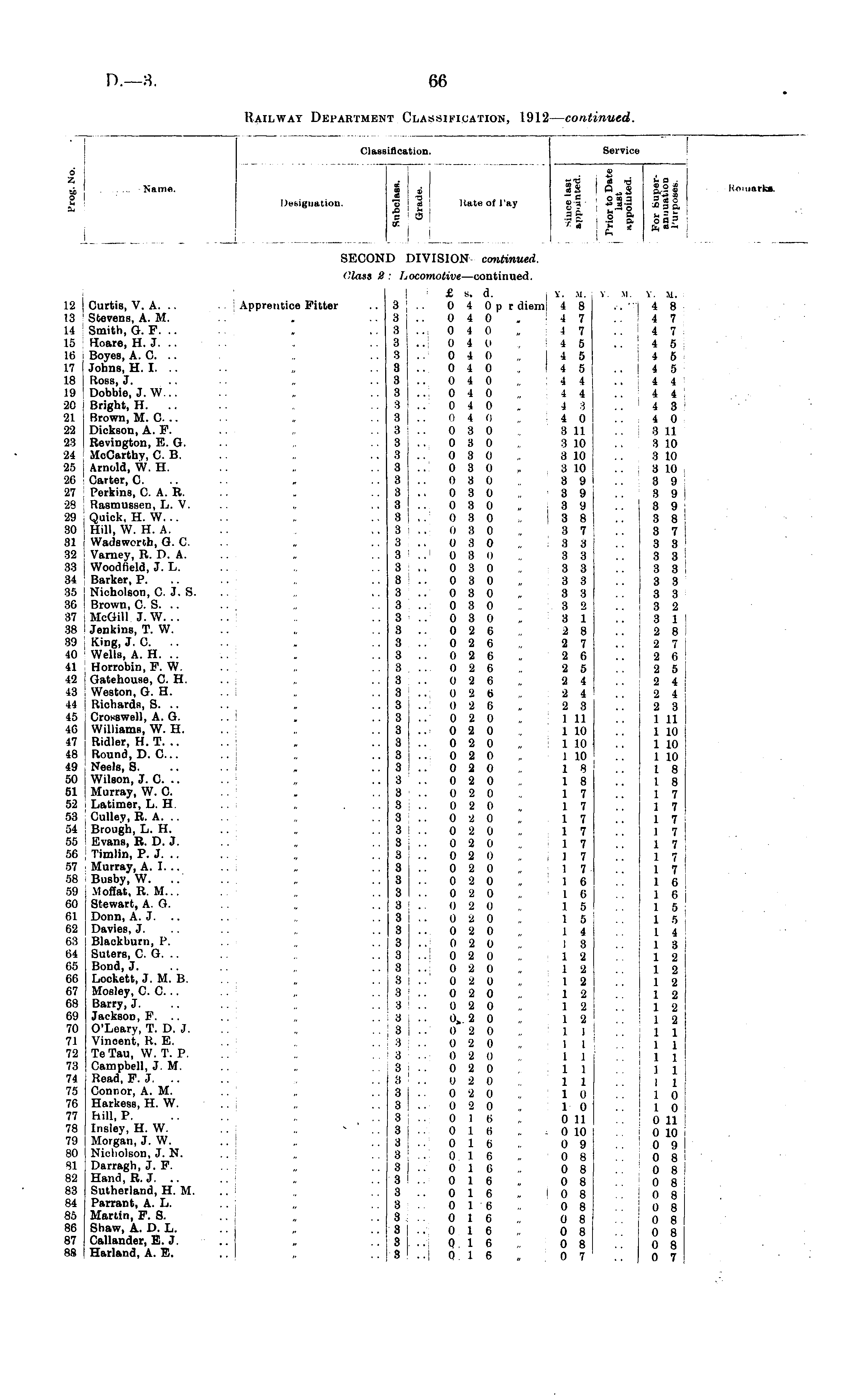 6 a si Name. 2 Classifies 4 i Designation. o 4O a to Class tnci ncation. Service 1 » I I 2 < °-l all Hate of Pay g| ; S3| g|S girt S e» a P. fa. 2 b & 7 & 1 r ft ° 9 - K I r - * : £ * to, o.-, Service rteinarl SECOND ) DIVISION continued. Clan 2 : L Locomotive —continued. 12 | Curtis, V. A. 13 Stevens, A. M. 14 Smith, G. F. 15 Hoare, H. J. 16 Boyes, A. C 17 Johns, H. I. 18 Ross, J. 19 Dobbie, J. W... 20 Bright, H. 21 Brown, M. C. .. 22 Dickson, A. F. 23 Revington, E. G. 24 McCarthy, C B. 25 Arnold, W. H. 26 Carter, C. 27 Perkins, C A. R. 28 Rasmussen, L. V. 29 Quick, H. W. .. 30 Hill, W. H. A. 31 Wadsworth, G. C. 32 Varney, R. D. A. 33 Woodfield, J. L. 34 Barker, P. 35 Nicholson, C J. S. 36 Brown, C S. 37 McGill J. W. .. 38 1 Jenkins, T. W. 39 King, J. C. .. 40 Wells, A. H. .. 11 Horrobin, F. W. 42 Gatehouse, C H. 43 Weston, G. H. 44 Richards, S. .. 15 Crosswell, A. G. 46 Williams, W. H. 47 Ridler, H. T. .. 48 Round, D. C... 49 Neels, 8. 50 i Wilson, J. C. 51 Murray, W. C. 52 Latimer, L. H. 53 Culley, R. A. 54 Brough, L. H. 55 Evans, R. D. J. 56 Timlin, P. J. 57 Murray, A. I. .. 58 '. Busby, W. 59 Moffat, R. M... 60 Stewart, A. G. 61 Donn, A. J. .. 62 Davies, J. 63 Blackburn, P. 64 Suters, C. G. 65 Bond, J. 66 Lockett, J. M. B. 67 Mosley, 0. 0... 68 Barry, J. 69 Jackson, F. .. 70 O'Leary, T. D. J. 71 Vincent, R. E. 72 Te Tau, W. T. P. 73 Campbell, J. M. 74 Read, F. J. 75 Connor, A. M. 76 Harkess, H. W. 77 hill, P. 78 Insley, H. W. 79 Morgan, J. W. 80 Nicholson, J. N. 31 Darragh, J. F. 82 Hand, R.J. .. 83 Sutherland, H. M. 84 Parrant, A. L. B5 Martin, F. 8. 86 Shaw, A. D. L. 37 Callander, E. J. =18 Harland, A. E. 12 18 li 15 1G 17 18 19 90 21 22 23 24 25 26 27 28 29 30 31 32 88 84 85 36 37 38 39 10 11 42 13 11 15 16 17 18 19 60 51 52 68 54 66 56 57 58 59 60 Gl G2 63 ill 65 66 67 68 69 70 71 72 73 74 75 70 77 78 79 80 81 89 83 84 85 8G 87 8S Apprentice Fitter .. 3 ! ..3 ..3 ..3 ..3 ..8 ..3 .3 .. 8 ..3 .3 ..3 ..8 .. 3 ..8 .3 ..3 ..3 ..3 ..3 ..3 ..3 ..8 ..3 .. 3 ..3 ..3 ..3 :: : :: J ..3 ..3 ..3 ..3 ..3 ..3 ..3 ..3 ..3 ..3 ... 3 ..3 ..3 ..3 ..3 ..3 ..3 .. 3 ..3 .3 ..3 ..3 .. 3 ..3 ..8 .. 3 .. 3 .. 8 . . 3 ..3 3 8 .. 8 ..3 .. 3 . . 3 .. 8 .. 3 ..3 .. 3 .. 8 .3 .3 .. 3 ..3 ..8 .. 8 £ s. d. j y. M. v. m. v. M. 3 0 4 0 p r diem! 4 8 .. " 4 8 3.. 040 . 47 47 8 .., 0 4 0 » 17 47 3 ..! 0 4 0 , 4 5 .. ! 4 5 ; 3.. 040 „ 14 5 45 3.. 040 . I 4 5 ..46 3 . . 0 4 0 „ 4 4 . . 4 4 3.. 040 „ 44 44 3 .. 0 4 0 . 4 3 ..43' 8 .. 0 4 0 „ 4 0 4 0 3 .. 0 3 0 3 11 3 11 8 .. 0 3 0 „ 3 10 8 10 8 ., 0 3 0 ,. 3 10 3 10 3 0 3 0 „ 3 10 ... 3 10 8 .. 0 8 0 8 9 .. 3 9 3 .. 0 3 0 „ 3 9 3 9! 8 .. 0 3 0 „ 3 9 .. 3 9; A , . 0 3 0 .. i 3 8 .. 3 8! 8 .. (13 0 „ 3 7 .. 3 7 ! 8 .. 0 3 0 „ 3 3 .. 3 8 1 3 .. 0 8 0 3 3 .. 3 3| 3.. 030 ,. 33 .. 33l 3.. 030 „ 33 .. 33 3.. 030. 33 .. 33 3.. 030 32 j 3 2 8 .. 030 . 31 .. ! 3 1 3.. 026 28 ..28 3.. 026 27 ..127 8.. 026 „ 26 I 2 6 3 .. 0 2 6 „ 2 5 .. J 2 5 3 .. 0 2 6 „ 2 4 .. ! 2 4 8 .. 0 2 6 „ 2 4 .. 2 4 3 .. 0 2 G 2 3 .. 2 3 8 .. 0 2 0 1 11 .. 1 11 8 .. 0 2 0 1 10 1 10 A 0 2 0 „ 1 10 .. 1 10 8 ... 0 2 0 „ 1 10 ! 1 10 3.. 020 „ 18 .. 18 3.. 020 18 .. 18 3.. 020 17 .. 17 8 .. 020 „ 17 .. 17 3 .. 0 2 0 . 17 .. 17 3 .. 020 „ 17 .. 17| 8 .. 0 2 0 „ 17 .. 1 7 1 3.. 02 0 „ 17 .. 17 3.. 020 „ 17 .. 17 3 0 2 0 16 16 3.. 020 „ 16 16 8 . 0 2 0. 15 .. 15 3 I .. 020 . 15 15 8.. 020 „ 14 14 3 .. 0 2 0 13 13 3 ..! 0 2 0 12 12 8 0 2 0 „ 1 -J . . 12 A ■ 0 2 0 . 12 12 8 0 2 0 ,. 12 12 3 I 0 2 0 „ 12 .. 12 3 ■ • 0.. 2 0 „ 12 12 8 .. 020 „ 11 .. 11 ■'i 0 2 0 . 11 11 8 .. 0 2 0 „ 11'.. 11 3 i .. 0 2 0 11 11 3 .. 0 2 0 11 .. 11 3 I - • 0 2 0 „ 10 .. 10 A 0 2 0 , 10 .. 10 A 0 16 , 0 11 0 11 3 • • 0 16 .. - 0 10 .. 1 0 10 :i 0 16 ,. 0 9 ...09 A 0 16 . 0 8 ..08: 8 1 0 16 .. 0 8 ..08! 3 0 16 . 0 8 0 8 1 3-. 016 „ 108 ..0 8 3- 016 „ 08 ..08 8 J . 0 16 „ 0 8 .. i 0 8 3 I •. 016 „ 08 08 3 I • • i Q. 1 6 „ 0 8 .. 0 8 3 ! .. | 0 1 6 . 07 07