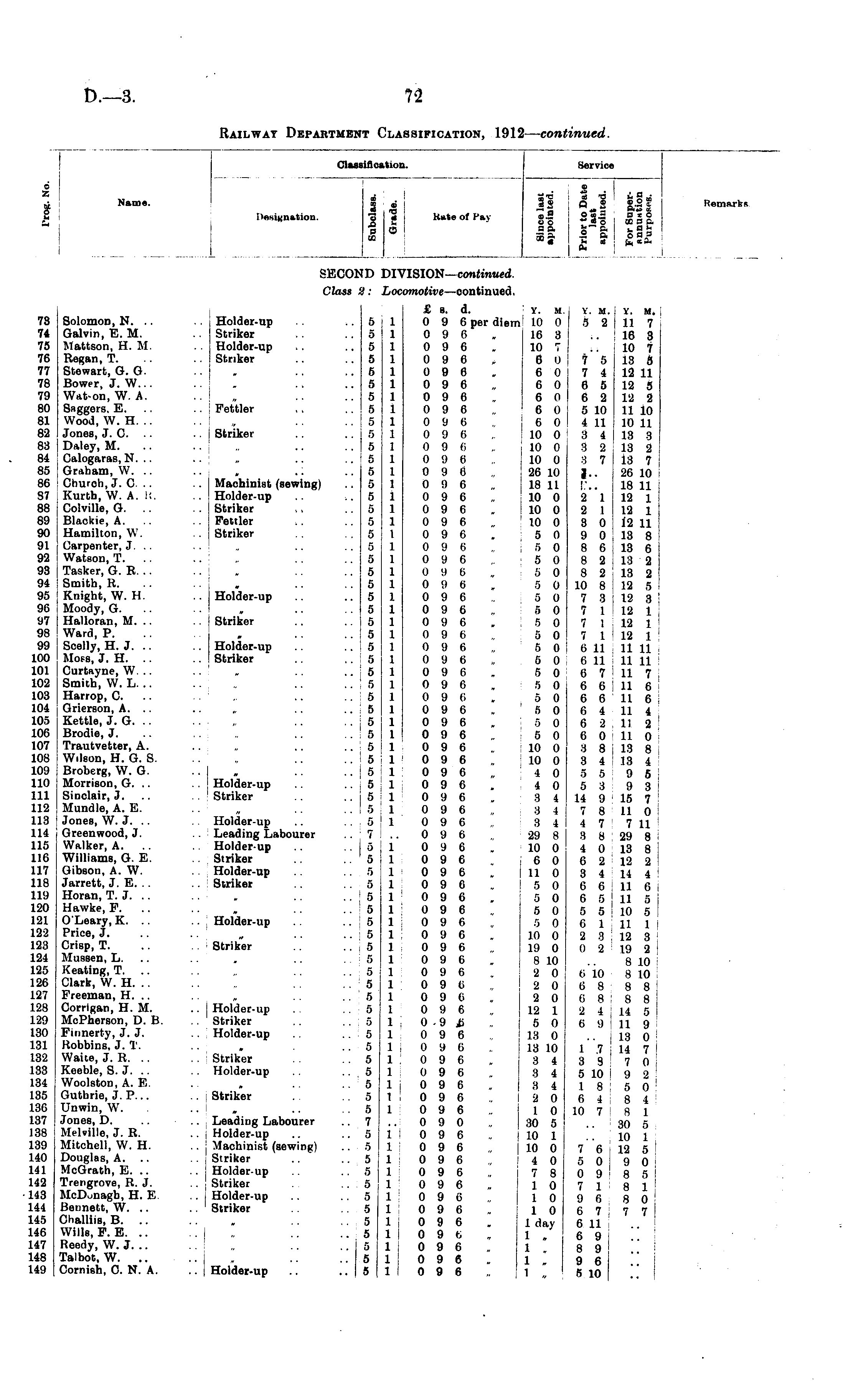 0 X 6 Name. fa Classifii •j s Hesitation. o a co Clasi 4 « 1 3 X. ttion. I CB V *> i fa 9 Kate of Pay Kate of Pay © _ -C "S 03 I fa 9 «j i S ; Q £ S,° i 1 H a© - Bx' 6 oo ***o coaa a a g""ft fa 2 S si .2 a o a a «=? g * £2ft Service Remarks SECOND D DIV 'IV VISION— continued. Class 2: I. Loco ,00 omotive —continued, 73 74 75 76 77 78 79 80 81 82 83 84 85 86 37 88 89 90 91 92 93 94 95 96 97 98 99 100 101 102 103 104 105 106 107 108 109 110 111 112 113 114 115 116 117 118 119 120 121 122 123 124 125 126 127 128 129 130 131 132 133 134 135 136 137 138 139 140 141 142 143 144 145 146 147 148 149 78 Solomon, N. .. 74 Galvin, E. M. 75 Mattson, H. M. 76 Regan, T. 77 Stewart, G. G. 78 Bower, J. W... 79 Wat-on, W. A. 30 Saggers. E. .. 31 Wood, W. H. .. 32 Jones, J. C. 33 Daley, M. 34 Calogaras, N. .. 35 Graham, W. .. 36 Church, J. C. .. 37 Kurth, W. A. !:. 38 Colville, G. .. 39 Blackie, A. 30 Hamilton, W. 31 Carpenter, J. .. 32 Watson, T. 33 Tasker, G. R. .. 34 Smith, R. 35 Knight, W. H. 36 Moody, G. 37 Halloran, M. .. 38 Ward, P. 39 j Scelly, H. J. 30 Moss, J. H. 31 | Curtayne, W. .. 32 j Smith, W. L. .. 33 | Harrop, C. 34 j Grierson, A. .. 35 I Kettle, J. G. 36 | Brodie, J. 37 j Trautvetter, A. 38 Wilson, H. G. S. 39 Broberg, W. G. 10 Morrison, G. .. 11 Sinclair, J. 12 Mundle, A. E. 13 ! Jones, W. J. 14 j Greenwood, J. 15 I Walker, A. .. 16 Williams, G. E. 17 i Gibson, A. W. 18 Jarrett, J. E. .. 19 Horan, T. J. 20 Hawke, F. !1 O'Leary, K. .. !2 Price, J. !3 Crisp, T. !4 Mussen, L. !5 Keating, T. .. 16 Clark, W. H. .. !7 Freeman, H. .. !8 Corrigan, H. M. !9 McPherson, D. B. 10 Finnerty, J. J. 11 Robbins, J. T. 12 Waite, J. R. .. 13 Keeble, S. J. 14 Woolston, A. E. 15 Guthrie, J. P... 16 Unwin, W. 17 Jones, D. 18 Melville, J. R. 19 Mitchell, W. H. 0 Douglas, A. .. 1 McGrath, E. .. 2 Trengrove, R. J. 3 McDunagb, H. E 4 Bennett, W. .. 5 Challiis, B. .. 6 Wills, F. E. .. 7 Reedy, W. J. .. 8 Talbot, W. .. 9 Cornish, C N. A. Holder-np .. 5 Striker .. 5 Holder-up .. .. 5 Striker .. 5 ..5 ..5 ..5 . . Fettler ,. .. 5 .. 5 .. j Striker .. 5 .. 5 .5 ..5 .. Machinist (sewing) .. 5 .. ! Holder-up . 5 . . ! Striker ,, .. 5 .. I Fettler .. 5 . | Striker .. .. 5 ..5 ..5 ..5 ..5 .. Holder-up .. 5 .. 5 . . Striker .. .. 5 ..5 Holder-up .. 5 Striker .. .. 5 ..5 .. 6 .. 5 ..5 :: : :: : I :. : :: :: I .. I 3 .. ..5 .. ! Holder-up .. 5 . . ! Striker .. 5 ..5 Holder-up .. i 6 . Leading Labourer .. 7 Holder-up .. I 5 Striker .. 5 Holder-up .. 5 Striker . . 5 8 .. 5 Holder-up 6 . . 5 Striker .. 5 .5 .. 5 .. 5 ..16 .. Holder-up .5 Striker .. 6 .. Holder-up .5 ..5 Striker .. .. 5 Holder-up . . 5 . . 5 . Striker .. 5 .5 . Leading Labourer .. 7 .. | Holder-up .. .. 5 .. j Machinist (sewing) .. 5 . . i Striker .. .. 5 .. Holder-up 5 .. j Striker .. : 5 .. | Holder-up .. 5 .. Striker .. .. 5 ..5 .. ,. .. .. 5 5 ..j . .. ..5 .. I Holder-up .. 5 1 1 1 1 1 1 1 1 1 1 1 1 1 1 1 1 1 I 1 1 1 1 1 1 1 1 1 1 1 1 1 1 1 1 1 1 1 ; 1 1 1 1 1 1 1 l 1 1 1 1 i 1 1 1 1 1 1 i l 1 , 1 1 , 1 il 1 i i i i i i l l l l £ s. d. 0 9 6 per diem 0 9 6 0 9 6 0 9 6 0 9 6 0 9 6 0 9 6 0 9 6 0 9 6 0 9 6 0 9 6 0 9 6 0 9 6 0 9 6 0 9 6 0 9 6 0 9 6 0 9 6 0 9 6 0 9 6 0 9 6 0 9 6 0 9 6 0 9 6 0 9 6 0 9 6 0 9 6 0 9 6 0 9 6 0 9 6 0 9 G 0 9 6 0 9 6 0 9 6 0 9 6 0 9 6 0 9 6 0 9 6 0 9 6 0 9 6 0 9 6 0 9 6 0 9 6 0 9 6 0 9 6 0 9 6 0 9 6 0 9 6 0 9 6 0 9 6 0 9 6 0 9 6 0 9 6 0 9 6 0 9 0 0 9 6 0-9 i. 0 9 6 0 9 6 0 9 6 0 9 6 0 9 6 0 9 6 0 9 6 0 9 0 0 9 6 0 9 6 0 9 6 0 9 6 0 9 6 0 9 G 0 9 6 0 9 6 0 9 6 0 9 6 0 9 6 0 9 6 I Y. M. Y. M. i Y. M. il 10 0 5 2 | 11 7 16 3 .. : 16 3 10 7 .. 10 7 6 0 7 5 13 5 6 0 7 4 12 11 6 0 6 5 12 5 6 0 6 2 12 2 6 0 5 10 11 10 6 0 4 11 10 11 10 0 3 4 13 3 10 0 3 2 13 2 10 0 8 7 13 7 26 10 I.. 26 10 18 11 !'.. 18 11 10 0 2 1 12 1 10 0 2 1 12 1 10 0 3 0 12 11 5 0 9 0 13 8 ,50 8 6 13 6 : 5 0 8 2 13 2 i 5 0 8 2 13 2 5 0 10 8 12 5 5 0 7 3 12 3 ! 5 0 7 1 12 1 I ; 5 0 7 1 i 12 1 5 0 7 I ! 12 1 5 0 6 11 11 11 5 0 6 11 11 11 5 0 6 7 j 11 7 : 5 0 6 6 ! 11 6 ! 5 0 6 6 11 6 I 5 0 6 4 11 4 5 0 6 2 11 2 j ! 5 0 6 0 11 0 10 0 3 8 13 8 10 0 8 4 13 4 4 0 5 5 9 5 4 0 5 3 9 3 3 4 14 9 : 15 7 3 4 7 8 11 0 i 3 4 4 7 7 11 29 8 8 8 : 29 8 : 10 0 4 0 13 8 6 0 6 2 i 12 2 11 0 3 4 14 4 5 0 6 6 ! 11 6 i 5 0 6 5 J 11 5 i 5 0 5 5 | 10 5 I 5 0 6 1 j 11 1 ! 10 0 2 8 : 12 3 19 0 0 2 : 19 2 8 10 .. 8 10 2 0 G 10 8 10 2 0 6 8 8 8 2 0 6 8 8 8 12 1 2 4 14 5 5 0 6 9 11 9 13 0 .. 13 0 13 10 1 .7 14 7 3 4 3 8 7 0 3 4 5 10 9 2 3 4 1 8 I 5 0 I i 2 0 6 4 8 4 10 10 7 I 8 1 I 30 5 .. 30 5 I 10 1 10 1 10 0 7 6 12 5 4 0 5 0 9 0 7 8 0 9 8 5 10 7 18 1 10 9 6 8 0 10 6 7 7 7 1 day 6 11 1 . 6 9 1 . 8 9 1 . 9 6 1 . 5 10