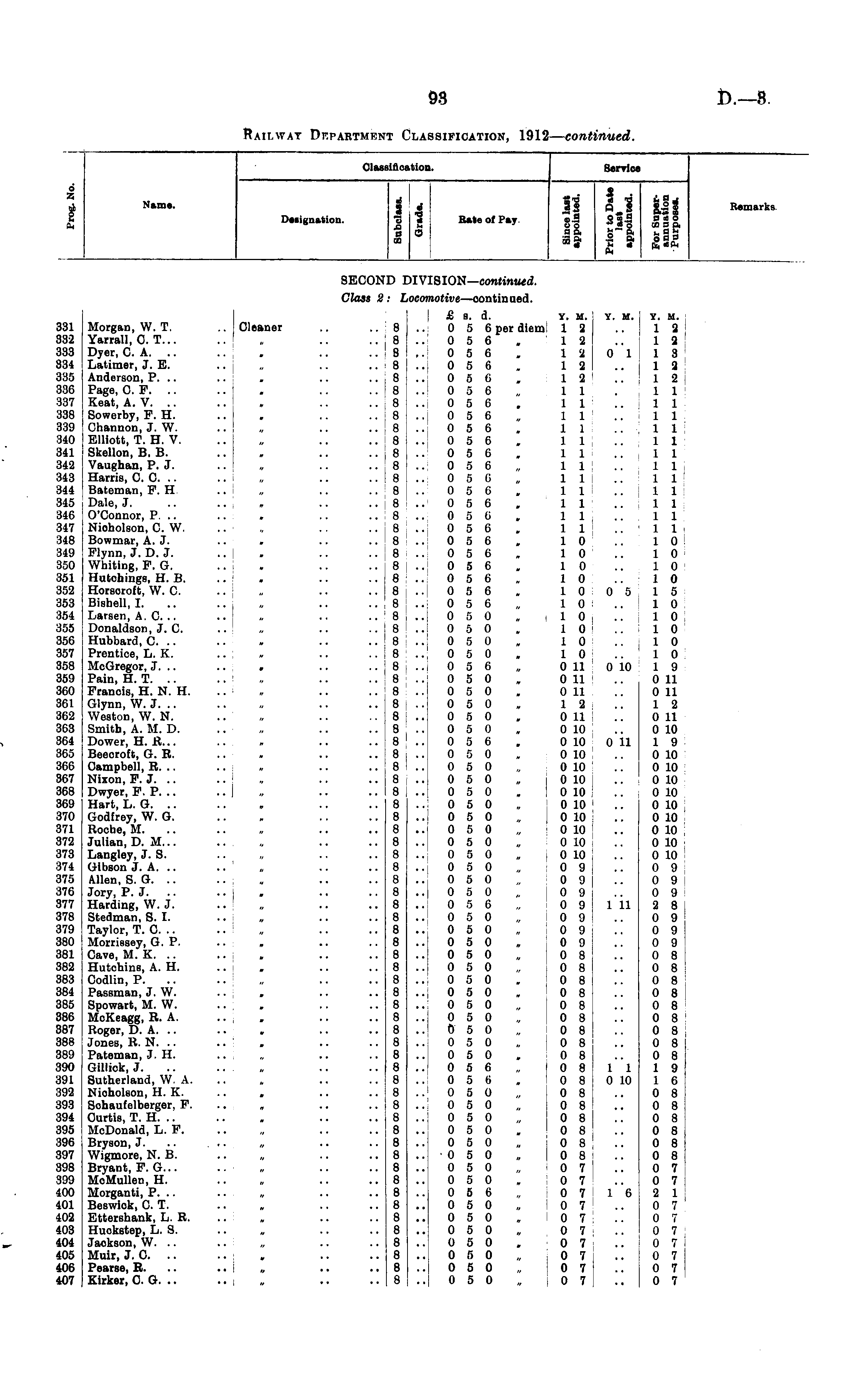 Clasi icatioi Service d 7, fa" ft Name. Designation. © « « "o a a co 4 03 * fa o Rate of Pay li Is o o a a cog. L\ in a © a s © o ** oj o co a a fc"~ ft fa a fa .2 a Sea a * **** Remarks secon: H V 8I0N— continued. Class 2, OCOl lotive —con t in ued. 131 132 133 134 135 186 187 188 189 140 141 142 143 144 145 146 147 148 149 160 151 152 153 154 155 15G S57 158 159 160 161 IG2 IG3 104 IG5 IGG 167 IG8 IG9 170 171 172 173 174 175 I7G 177 178 179 180 181 182 183 184 185 I8G 187 188 189 190 191 199 193 194 195 S96 197 198 199 100 101 ,02 103 104 105 106 107 Morgan, W. T. Yarrall, C T... Dyer, C. A. Latimer, J. E. Anderson, P. .. Page, 0. F. Keat, A. V. Sowerby, F. H. Channon, J. W. Elliott, T. H. V. Skellon, B, B. Vaughan, P. J. Harris, C. C. Bateman, F. H Dale, J. O'Connor, P. .. Nioholson, C. W. Bowmar, A. J. Flynn, J. D. J. Whiting, P. G. Hutchings, H. B. Horsoroft, W. C Bishell, I. Larsen, A. C .. Donaldson, J. C Hubbard, C. .. Prentice, L. K. McGregor, J. .. Pain, H. T. Francis, H. N. H. Glynn, W. J. Weston, W. N. Smith, A. M. D. Dower, H. R... Beecroft, G. R. Campbell, R. .. Nixon, F. J. Dwyer, P. P. .. Hart, L. G. Godfrey, W. G. Roche, M. Julian, D. M... Langley, J. S. Gibson J. A. Allen, 8. G. Jory, P. J. Harding, W. J. Stedman, 8. I. Taylor, T. C .. Morrissey, G. P. Cave, M. K. .. Hutchins, A. H. Codlin, P. Passman, J. W. Spowart, M. W. McKeagg, R. A. Roger, D. A. Jones, R. N. Pateman, J. H. Gillick, J. Sutherland, W. A. Nicholson, H. K. Sohaufelberger, P. Curtis, T. H. .. McDonald, L. F. Bryson, J. Wigmore, N. B. Bryant, F. G... MoMullen, H. Morganti, P. .. Beswiok, C. T. Ettershank, L. R. Huckstep, L. S. Jackson, W. .. Muir, J. C. Pearse, R. Kirker, C.G. Cleaner .. 0 • • 3 • * 3 :: : •• .. . • 0 8 8 9 8 8 8 8 8 8 8 8 8 8 8 8 8 8 8 S 8 S 8 8 S S S 8 8 8 8 8 8 8 8 8 8 8 8 8 8 8 8 8 8 8 8 8 8 8 8 8 8 8 8 8 8 8 8 8 8 8 8 8 8 8 8 8 8 8 8 8 8 8 8 8 8 8 £ 8. d. Y. M. Y. M. Y. M. 0 5 6 per diem 12 ..13 056 . 12 ..19 056 , 12 0113 056, 12 .. 12 056. 12 .. 12 0 5 6 11 ... 11 056. 11 .. 11 0 5 6 11 .. 11 0 5 6 , 11 ... 1 1 056. 11 .. 11 0 5 6 . 11 11 0 5 6 , 11 .. 11 0 5 G „ 11 .. 1 1 : 056. 11 .. 11 056 . 111.. 11 0 5 6 11 .. 11 056 . 11.. 11 0 5 6 . 10 .. 10 0 5 6 . 10 .. 10 0 5 6 . 10 .. 10 0 5 6 . 10 .. 10 056. 10 05 15 0 5 6 „ 10 10 050 „ ,10 .. 10 050 „ 10.. 10 050, 10 .. 10 050. 10 10 0 5 6 „ 0 11 0 10 1 9 0 5 0 , 0 11 .. 0 11 0 5 0 , 0 11 .. 0 11 050 . 13.. 12 0 5 0 . 0 11 ! .. 0 11 0 5 0 . 0 10 .. 0 10 056 . OlO'oll 19 0 5 0 . 0 10 I .. 0 10 0 5 0 „ 0 10 .. 0 10 0 5 0 „ | 0 10 .. 0 10 0 5 0 , ! 0 10 .. | 0 10 0 5 0 3 0 10 .. 0 10 0 5 0 „ 0 10 .. 0 10 0 5 0 „ 0 10 .. 0 10 0 5 0 „ 0 10 .. 0 10 0 5 0 , 0 10 .. 0 10 0 5 0 „ 0 9 .. 0 9 050 „ 09 .. 09 050 „ 0 9 .. 09 0 5 6 „ 0 9 1 11 2 8 0 5 0 „ i 0 9 .. 0 9 0 5 0 „ ! 0 9 .. 0 9 0 5 0 „ 0 9 .. 0 9 0 5 0 „ 0 8 .. 0 8 0 5 0 ,, | 0 8 .. 0 8 050 . ;08 .. 08 050 , 08 .. 08 0 5 0 „ 0 8 .. 0 8 0 5 0 , 0 8 .. 0 8 050 „ 08 .. 08 050 , 08 .. 08 050. 08 .. 08 056 „ 08 11 19 056 , 08 0 10 16 0 5 0 „ 10 8 .. 0 8 0 5 0 „ 10 8 .. 0 8 0 5 0 „ J 0 8 .. 0 8 050 , ' 0 8 .. 08 0 5 0 „ : 0 8 .. 0 8 050 „ |08 .. 08 0 5 0 „ 0 7 .. 0 7 050 , 07 .. 07 056 „ 0 7 16 21 050 „ 07 .. 07' 050 , 07 .. 07 0 5 0 „ 0 7 1.. 07 050 . 07 .. 07 0 5 0 „ 0 7 .. 0 7 0 5 0 „ 10 7 .. 0 7 0 5 0 „ ! 0 7 .. 0 7