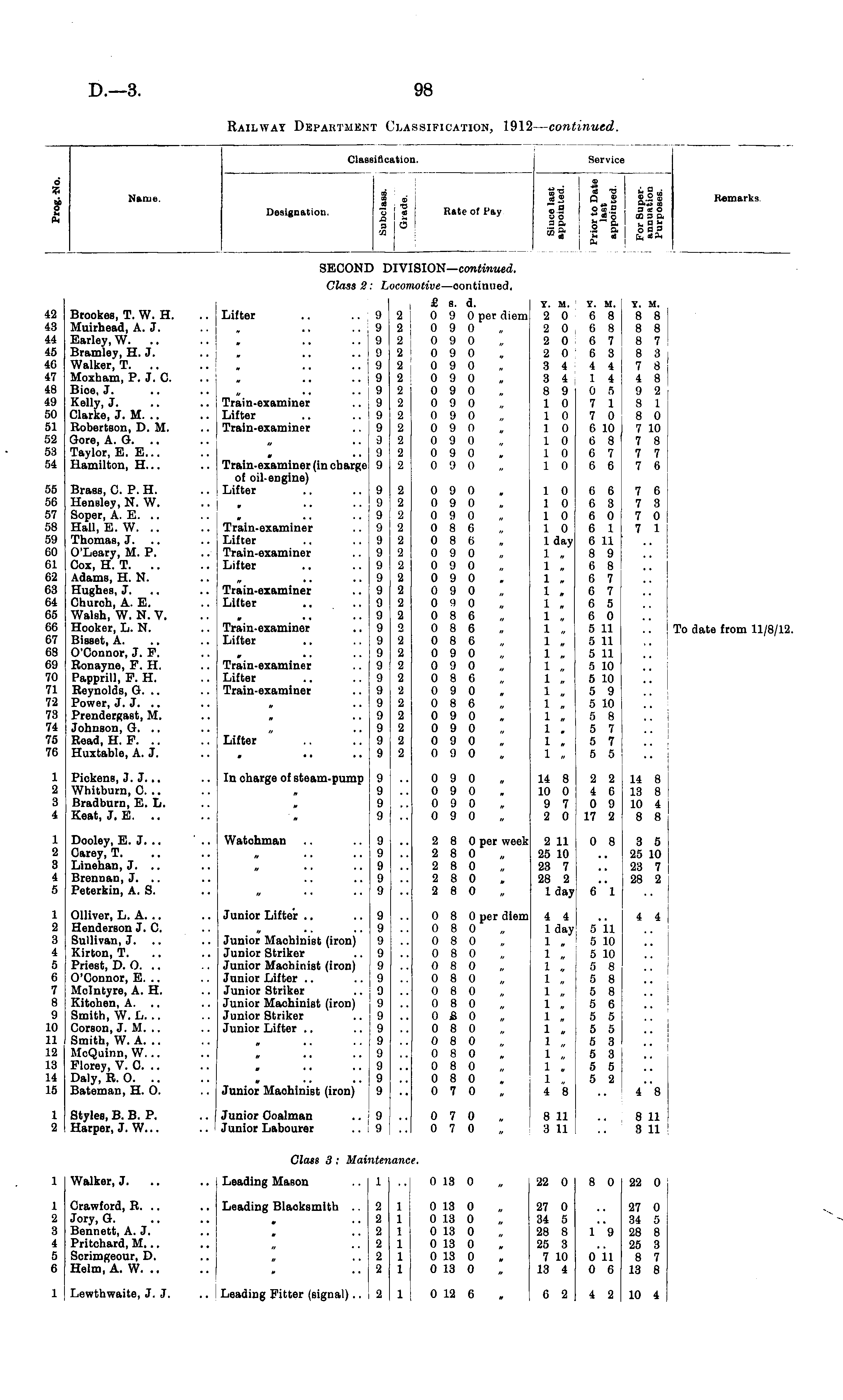 Classification. Service d 7, A o fa ft Name. Designation. © £ l -a I© , ol ■a i s a ! CO Rate of Pay Rate of Pay I © S a © -a fa a ■ i • I Q » S .2 8 ~- .. 43 - ft43 © ©a o©a s©o oo ""* * o cosa a a , S~ a fa a fa Si a .8 a o a a Remarks SECOND 1 )iv: SION— continued. Class 2: 1 locor. wtive —con tinu ed. 43 48 44 45 4G 47 48 49 50 51 52 53 54 Brookes, T. W. H. Muirhead, A. J. Earley, W. Bramley, H. J. Walker, T. .. Moxham, P. J. C. Bioe, J. Kelly, J. Clarke, J. M. .. Robertson, D. M. Gore, A. G. Taylor, E. E... Hamilton, H... Lifter .. .. 9 .. 9 .. 9 .. 9 ..9 i :: :: 8 Train-examiner .. 9 Lifter .. ..9 Train-examiner .. 9 ..9 .. 9 Train-examiner (in charge 9 of oil-engine) Lifter .. ..9 .. 9 .. 9 Train-examiner .. 9 Lifter .. ..9 Train-examiner .. 9 Lifter .. ..9 ..9 Train-examiner .. 9 Lifter .. ..9 .. 9 Train-examiner .. 9 Lifter .. ..9 .. 9 Train-examiner .. 9 Lifter .. ..9 Train-examiner .. 9 .. 9 .. 9 ..9 Lifter .. ..9 .. 9 2 2 2 2 2 2 2 2 2 2 2 2 2 £ s. d. 0 9 0 per diem 0 9 0 0 9 0 0 9 0 0 9 0 0 9 0 0 9 0 0 9 0 0 9 0 0 9 0 0 9 0 0 9 0 0 9 0 Y. M. Y. M. Y. M. i 2 0 6 8 8 8 2 0 G 8 8 8 2 0 6 7 8 7 2 0 6 3 8 3 3 4 4 4 7 8 3 4 14 4 8 8 9 0 5 9 2 10 7 1 8 1 10 7 0 8 0 10 6 10 7 10 10 6 8 7 8 10 6 7 7 7 10 6 6 7 6 55 56 57 58 59 60 61 62 68 64 66 66 G7 GS G9 70 71 72 73 74 75 7G Brass, C. P. H. Hensley, N. W. Soper, A. E. Hall, E. W. Thomas, J. O'Leary, M. P. Cox, H. T. Adams, H. N. Hughes, J. Church, A. E. Walsh, W. N. V. Hooker, L. N. Bisset, A. O'Connor, J. F. Ronayne, F. H. Papprill, F. H. Reynolds, G. .. Power, J. J. Prendergast, M. Johnson, G. .. Read, H. F. Huxtable, A. 3. 2 2 2 2 2 2 2 2 2 2 2 9 2 2 2 2 2 2 2 2 2 2 0 9 0 0 9 0 0 9 0 0 8 6 0 8 6 0 9 0 0 9 0 0 9 0 0 9 0 0 9 0 0 8 6 0 8 6 0 8 6 0 9 0 0 9 0 0 8 6 0 9 0 0 8 6 0 9 0 0 9 0 0 9 0 0 9 0 . 10 6 6 7 6 10 6 3 7 3 10 6 0 7 0 10 6 1 7 1 1 day 6 11 h 1 „ 8 9 1,68 1.67 1,67 1 „ 6 5 1.60 1 „ 5 11 1 „ 5 11 1 „ 5 11 1 „ 5 10 1 „ 5 10 1 „ 5 9 1 „ 5 10 1 0 5 8 1 . 5 7 1.57 1 „ 5 5 To date from 11/8/12. 1 2 8 4 Pickens, J.J... Whitburn, C. .. Bradburn, E. L. Keat, J. E. .. In charge of steam-pump 9 9 9 9 0 9 0 0 9 0 0 9 0 0 9 0 14 8 2 2 14 8 10 0 4 6 13 8 9 7 0 9 10 4 2 0 17 2 8 8 1 2 3 4 5 Dooley, E. J. .. Carey, T. Linehan, J. .. Brennan, J. .. Peterkin, A. S. Watchman .. .. 9 ..9 .. 9 .. 9 9 2 8 0 per week 2 8 0 2 8 0 2 8 0 , 2 8 0 : 2 11 0 8 3 5 25 10 .. 25 10 23 7 .. 23 7 28 2 28 2 1 day 6 1 1 2 3 4 5 6 7 8 9 10 11 12 13 14 15 Olliver, L. A. .. Henderson J. C. Sullivan, J. Kirton, T. Priest, D. 0. O'Connor, E. .. Mclntyre, A. H. Kitchen, A. Smith, W. L. .. Corson, J. M. .. Smith, W. A. .. McQuinn, W. .. Florey, V. 0. .. Daly, R. 0. .. Bateman, H. 0. Junior Lifter .. .. 9 ..9 Junior Machinist (iron) 9 Junior Striker .. 9 Junior Machinist (iron) 9 Junior Lifter .. .. 9 Junior Striker .. 9 Junior Machinist (iron) 9 Junior Striker .. 9 Junior Lifter .. .. 9 9 .. 9 .. 9 .. 9 Junior Machinist (iron) 9 0 8 0 per diem 0 8 0 0 8 0 0 8 0 0 8 0 0 8 0 0 8 0 0 8 0 0 B 0 0 8 0 0 8 0 0 8 0 0 8 0 0 8 0 0 7 0 l 4 4 .. 4 4 1 day 5 11 1 0 5 10 1 . 5 10 1 „ 5 8 1 „ 5 8 1 „ 5 8 1 „ 5 6 1 „ 5 5 1 „ 5 5 1 „ 5 3 1 „ 5 3 1 „ 5 5 1 „ 5 2 4 8 .. 4 8 1 2 Styles, B. B. P. Harper, J. W... Junior Coalman .. 9 Junior Labourer .. 9 0 7 0 0 7 0 8 11 .. 8 11 3 11 .. 3 11 Walker, J. .. Class 3 ; Mainte ntc p. illlh Leading Mason .. 1 1 0 13 0 22 0 8 0 22 0 1 2 3 4 5 6 Crawford, R. .. Jory, G. Bennett, A. J. Pritchard, M... Scrimgeour, D. Helm, A. W. .. Leading Blacksmith .. 2 o .. 2 O .. 2 o 2 2 2 2 2 2 1 1 1 1 1 1 0 13 0 0 13 0 0 13 0 0 13 0 0 13 0 0 13 0 27 0 .. 27 0 34 5 .. 34 5 28 8 1 9 28 8 25 3 .. 25 3 7 10 0 11 8 7 13 4 0 6 13 8 ..2 .. 2 .. 2 1 Lewthwaite, J. J. Leading Fitter (signal).. j 2 2 1 0 12 6 6 2 4 2 10 4