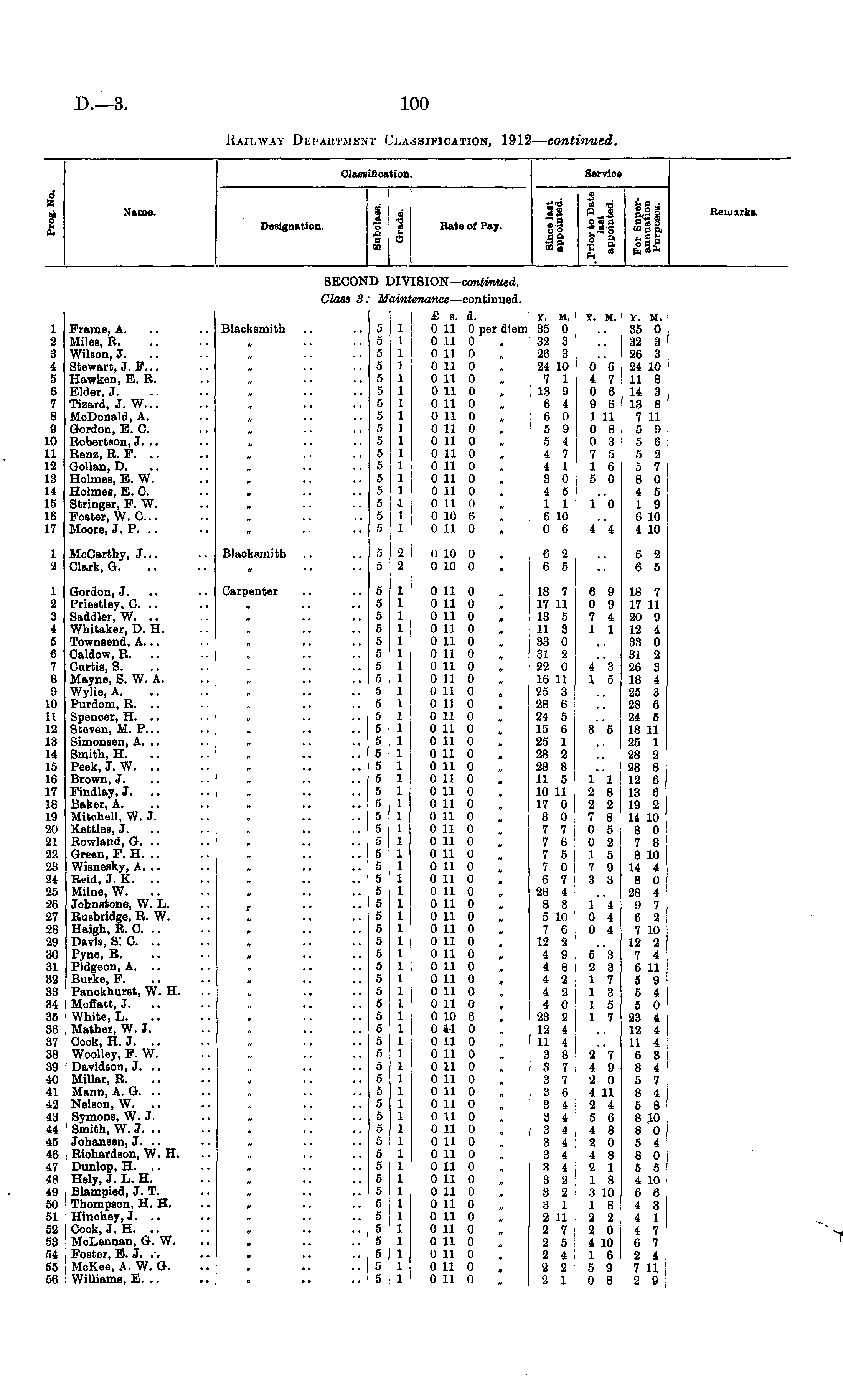 Classification. Service o ? a< ! in Name. Designation. 4 1 5 i Rate ol Pay. u a ■ S..2S Remarks. secon: •rv ISION— continued. Class 3: EMM tenance —continued. i 2 3 4 5 G 7 8 9 10 ii i<2 18 1-1 15 Iβ 17 Frame, A. Miles, B. Wilson, J. Stewart, J. F... Hawkan, E. R. Elder, J. Tizard, J. W... McDonald, A. Gordon, E. C. Robertson, J. .. Renz, R. F. Gollan, D. Holmes, E. W. Holmes, E. O. Stringer, F. W. Foster, W. C... Moore, J. P. Blacksmith n 5 5 5 5 5 5 5 5 5 5 5 5 5 5 5 5 5 J 1 1 1 1 1 1 1 1 1 1 1 1 1 1 1 1 £ s. d. Y. M. 0 11 0 per diem 35 0 0 11 0 „ 32 3 0 11 0 „ 26 3 0 11 0 . 24 10 0 11 0 „ 7 1 0 11 0 . 13 9 0 11 0 , 6 4 0 11 0 „ 6 0 0 11 0 . 5 9 0 11 0 . 5 4 0 11 0 . 4 7 0 11 0 „ 4 1 0 11 0 . 3 0 0 11 0 . 4 5 0 11 0 „ 11 0 10 6 , 6 10 0 11 0 , 0 6 y. m. 0 6 4 7 0 6 9 6 1 11 0 8 0 3 7 5 1 6 5 0 Y. M. 35 0 32 3 26 3 24 10 11 8 14 3 13 8 7 11 5 9 5 6 5 2 5 7 8 0 4 5 1 9 6 10 4 10 10 4 4 1 2 McCarthy, J... Clark, G. Blacksmith 5 5 2 2 i) 10 0 . 6 2 0 10 0 . ,65 G 2 6 5 1 '2 3 4 S 6 7 8 9 10 11 12 18 14 16 16 17 18 L9 ■20 21 22 28 24 26 26 27 28 29 80 81 89 88 M SB Bβ :J7 38 89 10 11 12 18 41 45 4(i 47 18 19 60 51 52 53 54 55 50 Gordon, J. Priestley, C. .. Saddler, W. .. Whltaker, D. H. Townsend, A... Caldow, R. Curtis, S. Mayne, S. W. A. Wylie, A. Purdom, R. Spencer, H. .. Steven, M. P... Simonsen, A. .. Smith, H. Peek, J. W. Brown, J. Findlay, J. .. Baker, A. Mitohell, W. J. Kettles, J. Rowland, G. .. Green, F. H. Wisnesky, A. .. Rnid, J. K. Milne, W. Johnatone, W. L. Rusbridge, R. W. Haigh, R. C. Davis, S: C. .. Pyne, R. Pidgeon, A. Burke, F. Panckhurst, W. H. Moffatt, J. White, L. Mather, W. J. Cook, H. J. Woolley, F. W. Davidson, J. .. Millar, R. Mann, A. G. Nelson, W. .. Symone, W. J. Smith, W. J. Johansen, J. .. Riohardson, W. H. Dunlop, H. .. Hely, J. L. H. Blampied, J. T. Thompson, H. H. Hinohey, J. .. Cook, J. H. .. MoLennan, G. W. Foster, E. J. McKee, A. W. G. Williams, E. .. Carpenter 5 5 5 5 5 5 5 5 5 5 5 5 5 5 5 5 5 5 5 5 5 5 5 5 5 5 5 5 5 5 5 5 5 5 5 5 5 5 5 5 5 5 5 5 5 5 5 5 5 5 5 5 5 5 5 5 1 1 1 1 1 i 1 1 1 1 1 1 1 1 1 1 1 1 1 1 1 1 1 1 1 1 1 1 1 1 1 1 1 1 1 1 1 1 1 1 1 1 1 1 1 1 I 1 1 1 1 1 1 1 1 1 0 11 0 „ 18 7 0 11 0 „ 17 11 0 11 0 , 13 5 0 11 0 „ 11 3 0 11 0 „ i 33 0 0 11 0 , : 31 2 0 11 0 „ I 22 0 0 110 , 16 11 0 11 0 „ 25 3 0 11 0 . 28 6 0 11 0 „ J 24 5 0 11 0 „ 15 6 0 11 0 . 25 1 0 11 0 . 28 2 0 11 0 „ 28 8 0 11 0 . 11 5 0 11 0 „ 10 11 0 11 0 . 17 0 0 11 0 „ 8 0 0 11 0 , 7 7 0 11 0 . 7 6 0 11 0 , 7 5 0 11 0 „ 7 0 0 11 0 „ 6 7 0 11 0 . 28 4 0 11 0 . 8 3 0 11 0 „ 5 10 0 11 0 . 7 6 0 11 0 . 12 2 0 11 0 . 4 9 0 11 0 . 4 8 0 11 0 , 4 2 0 11 0 „ 4 2 0 11 0 , 4 0 0 10 6 „ 23 2 0 il 0 12 4 0 11 0 „ 11 4 0 11 0 „ 3 8 0 11 0 „ 3 7 0 11 0 „ 3 7 0 11 0 . 3 6 0 11 0 „ 3 4 0 11 0 „ 3 4 0 11 0 . 3 4 0 11 0 „ 3 4 0 11 0 , 3 4 0 11 0 , 3 4 0 11 0 „ 3 2 0 11 0 . 3 2 0 11 0 „ 3 1 0 11 0 . 2 11 0 11 0 „ 2 7 0 11 0 , 2 5 0 11 0 . I 2 4 0 11 0 „ 2 2 0 11 0 „ 2 1 6 9 0 9 7 4 1 1 18 7 17 11 20 9 12 4 33 0 31 2 26 3 18 4 25 3 28 6 24 5 18 11 25 1 28 2 28 8 12 6 13 6 19 2 14 10 8 0 7 8 8 10 14 4 8 0 28 4 9 7 6 2 7 10 12 2 7 4 6 11 5 9 5 4 5 0 23 4 12 4 11 4 6 3 8 4 5 7 8 4 5 8 8 .10 8 0 5 4 8 0 5 5 4 10 6 6 4 3 4 1 4 7 6 7 2 4 7 11 2 9 H 4 3 1 5 3"5 1 1 2 8 2 2 7 8 0 5 0 2 1 5 7 9 3 3 1 4 0 4 0 4 5 3 2 3 1 7 1 3 1 5 1 7 2 7 4 9 2 0 4 11 2 4 5 6 4 8 2 0 4 8 2 1 1 8 3 10 1 8 2 2 2 0 4 10 1 6 5 9 0 8