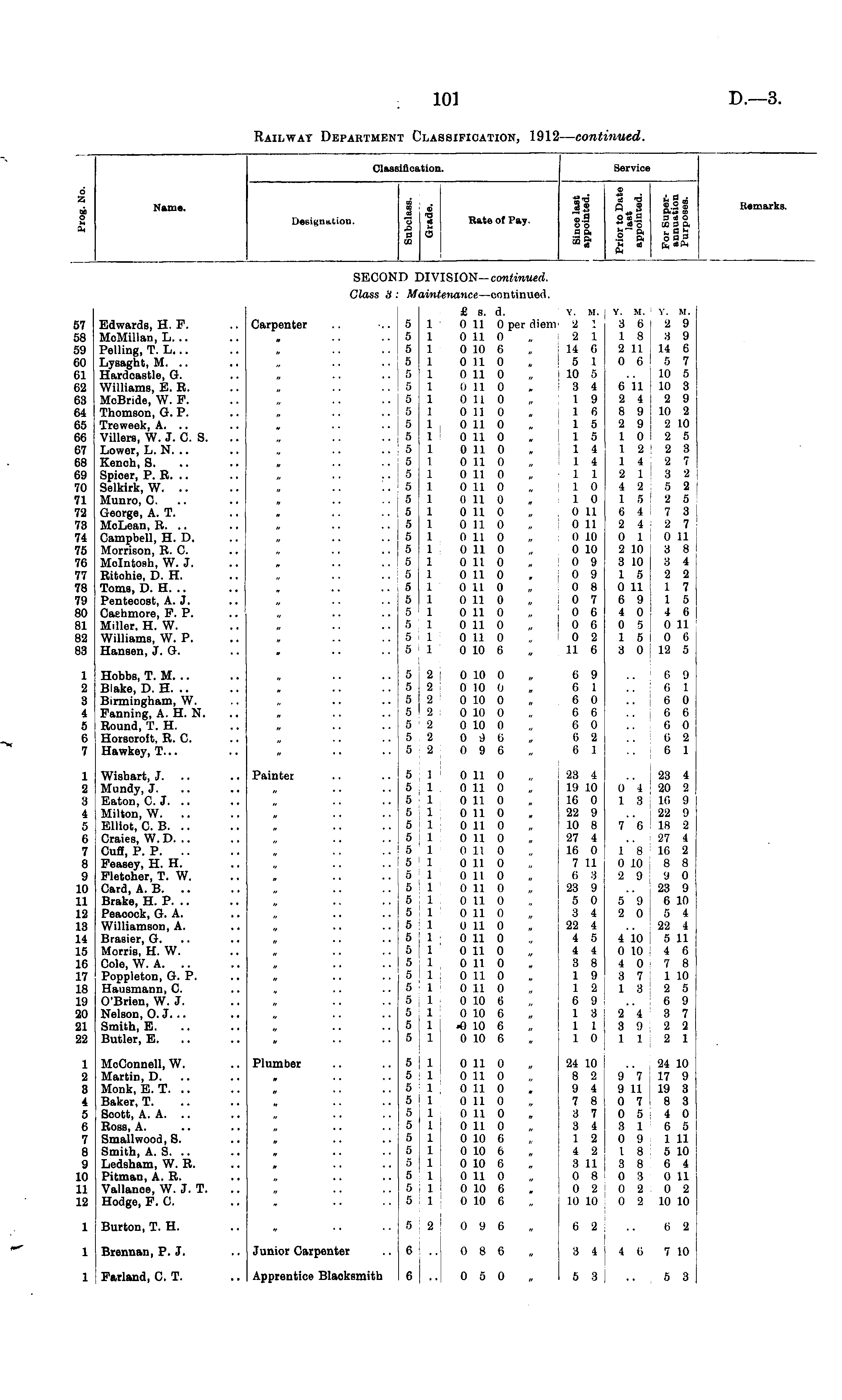 Classification Service d i Name. Designation. o . j= o o * 1 * Bate of Fay. li I.j ill So " * o ccsft Remarks. SECON D I DIV] ISION— continued. Class 3: ; Mi 'ainti tenance —con tinued. 57 58 59 60 lil 02 68 G4 65 c<; m 68 69 70 71 72 73 74 75 Tβ 77 78 7fl 80 81 82 83 Edwards, H. P. McMillan, L... Polling, T. L... Lysaght, M. .. Hardcastle, G. Williams, E. R. McBnde, W. P. Thomson, G. P. Treweek, A. .. Villers, W. J. C. S. Lower, L. N. .. Kench, S. Spicer, P. R. Selkirk, W. .. Munro, C. George, A. T. McLean, R. .. Campbell, H. D. Morrison, R. C. McIntOHh, W. J. Ritchie, D. H. Toms, D. H. .. Pentecost, A. J. Caehmore, P. P. Miller. H. W. Williams, W. P. Hansen, J. G. Carpenter 5 5 S 5 6 5 5 5 8 5 S 6 5 5 r> o 5 5 5 5 5 5 5 5 5 5 S 1 1 1 1 1 1 1 1 1 1 1 1 1 1 1 1 1 1 1 1 1 1 i! £ a. d. y. m. 0 110 per diem 2 1 0 11 0 , I 3 1 0 10 G ,. 14 G 0 11 0 „ 5 1 0 11 0 „ 10 5 0 11 0 , 3 4 0 110 , 19 0 11 0 „ 16 0 11 0 . 15 0 11 0 . 15 0 11 0 . 14 0 11 0 . 14 0 11 0 „ 11 0 11 0 „ 10 0 11 0 , 10 0 11 0 „ 0 11 0 11 0 „ 0 11 0 11 0 „ 0 10 0 11 0 0 10 0 11 0 „ 0 9 0 11 0 . 0 9 0 11 0 . 0 8 0 11 0 , 0 7 0 11 0 „ ; 0 6 0 11 0 „ I 0 G 0 11 0 „ 0 2 0 10 6 „ 11 6 Y. M. 3 6 1 8 2 11 0 6 6 11 2 4 8 9 2 9 1 0 1 2 1 4 2 1 4 2 1 S 6 4 2 4 0 1 2 10 3 10 1 5 0 11 6 9 4 0 0 5 1 5 3 0 r. m. v. m. B o 2 9 18 3 9 2 11 14 6 0 6 5 7 10 5 6 11 10 3 2 4 2 9 8 9 10 2 2 9 2 10 10 2 5 12 2 3 11 2 7 2 1 3 2 4 2 5 2 1 -, 2 5 6 4 7 3 2 4 2 7 0 1 0 11 2 10 3 8 3 10 3 4 15 2 2 0 11 1 7 6 9 15 4 0 4 6 I) 5 0 11 15 0 0 3 0 12 5 1 2 ■A 4 5 6 7 Hobbs, T. M. .. Biake, D. H. .. Birmingham, W. Panning, A. H. N. Round, T. H. Horsoroft, R. C. Hawkey, T... 5 5 5 5 5 5 5 . 6 9 6 1 6 0 6 6 GO 0 2 6 1 2 2 2 ! 2 2 2 2 0 10 0 „ 6 9 0 10 0 „ G 1 0 10 0 „ 6 0 0 10 0 „ 6 6 0 10 0 . 6 0 0 9 0 „ 6 2 0 9 6 , 6 1 1 2 8 4 5 6 7 8 9 10 li 12 18 14 15 10 17 18 19 20 21 22 Wishart, J. .. Mundy, J. Eaton, C. J. .. Milton, W. .. Elliot, C. B. Craies, W. D. .. Cufi, P. P. Peasey, H. H. Pletoher, T. W. Card, A. B. .. Brake, H. P. .. Peacock, G. A. Williamson, A. Brasier, G. Morris, H. W. Cole, W. A. Poppleton, G. P. Hausmann, C. O'Brien, W. J. Nelson, O. J. .. Smith, E. Butler, E. Painter 5 G 5 6 6 6 5 5 5 u 5 5 5 5 5 5 e 6 5 5 5 5 , 1 1 1 1 1 1 1 1 1 1 1 1 1 1 1 1 i 1 1 0 11 0 „ I 23 4 0 11 0 „ 19 10 0 11 0 , 16 0 0 11 0 . 22 9 0 11 0 „ 10 8 0 11 0 . 27 4 0 11 0 16 0 0 11 0 „ 7 11 o li o „ ey 0 11 0 23 9 0 11 0 „ 5 0 0 11 0 „ 3 4 0 11 0 „ 22 4 0 11 0 . 4 5 0 11 0 „ 4 4 0 11 0 „ 3 8 0 11 0 „ 19 0 11 0 „ 12 0 10 6 „ 6 9 0 10 6 . 18 4 10 6 „ 11 0 10 6 „ 10 23 4 0 4 20 2 13 16 9 .. 22 9 7 6 18 2 27 4 1 S 16 2 0 10 8 8 2 9 9 0 23 9 5 9 6 10 2 0 5 4 22 4 4 10 5 11 0 10 4 6 4 0 7 8 8 7 1 10 13 2 5 6 9 2 4 3 7 8 9 2 2 11 2 1 a • • • • 1 2 3 4 E 6 7 8 9 10 11 12 McConnell, W. Martin, D. Monk, E. T. Baker, T. 8cott, A. A. Ross, A. Smallwood, S. Smith, A. S. .. Ledsham, W. R. Pitman, A. R. Vallanoe, W. J. T. Hodge, F. C. Plumber it • • • • 5 6 6 6 5 f> 6 r> :'> r> 5 5 1 1 1 1 1 1 1 1 1 1 ! 0 11 0 „ 24 10 0 11 0 „ 8 2 0 11 0 . 9 4 0 11 0 , 7 8 0 11 0 „ 3 7 0 11 0 „ 3 4 0 10 6 „ 12 0 10 6 „ 4 2 0 10 6 „ 3 11 0 11 0 „ 0 8 0 10 6 . 0 2 0 10 6 „ 10 10 24 10 9 7 17 9 9 11 19 3 0 7 8 3 0 5 4 0 3 1 6 5 0 9 1 11 1 8 : 5 10 3 8 6 4 0 8 0 11 0 2 0 2 0 2 10 10 1 Burton, T. H. 5 i 2 0 9 6 . 6 2 6 2 1 Brennan, P. J. Junior Carpenter 6 0 8 6 . 3 4 4 0 7 10 1 Farland, C. T. Apprentice Blacksmith 6 0 5 0 „ I 5 3 5 3