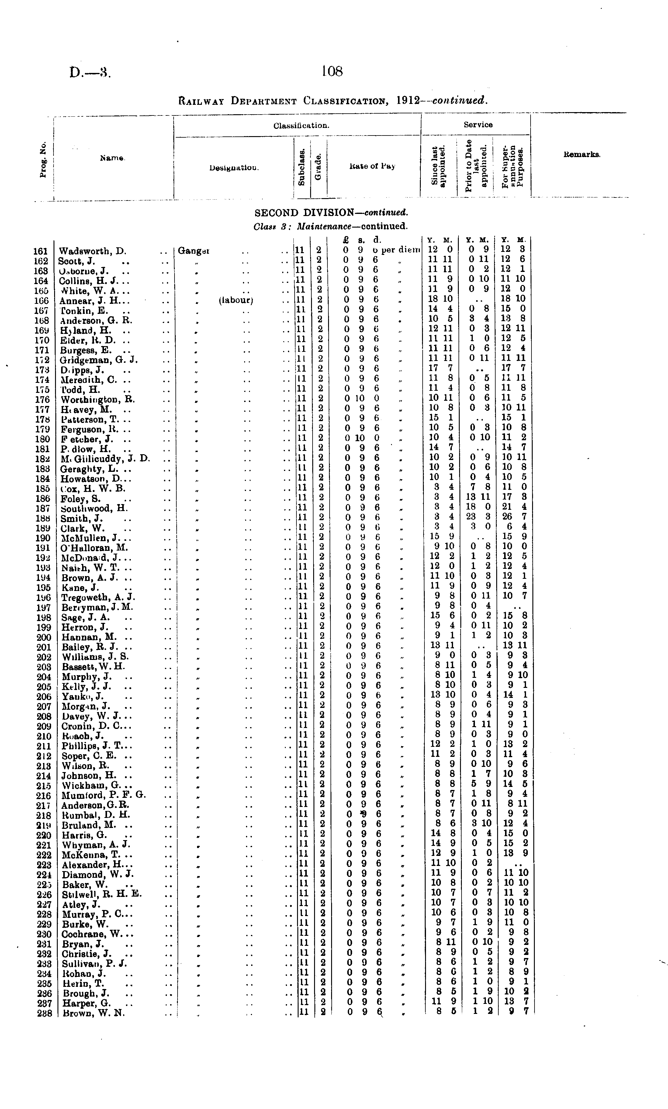 Clash! flcatioi Service o i Z J I Name. Designation. ■J) CO Kate of l'tt> ® J 2 fi S ! §,-21 "© .9 ° .5 p * 8 V o " * O £?Q< B S i .2 a i o a a Remarks. , SECON] nv: [SION— continued. 161 162 163 164 160 166 167 168 16'J 170 171 V,'2 173 174 175 176 177 178 179 180 181 18* 183 184 185 186 187 188 189 190 191 192 193 1U4 195 1% 197 198 199 200 201 202 •203 204 205 206 207 208 209 210 211 212 213 214 215 216 217 218 21.it 220 221 222 223 224 223 2*6 227 228 229 230 231 232 233 234 235 236 237 288 61 62 63 64 60 66 67 68 .69 70 .71 .72 .73 .74 .75 l76 L77 L7H ■79 .80 i81 .82 183 [84 LS6 186 187 L8« L89 190 L91 L92 193 L94 L95 LU6 L97 198 199 200 201 202 203 204 J 205 206 207 208 209 210 211 212 213 214 215 216 217 218 2 Lit 220 221 222 223 224 223 2*6 227 228 229 230 231 232 233 234 235 236 237 288 WacUworth, D. Soott, J. ij.-.uoriie, J. Collins, H. J. .. Ahite, W. A. .. Annear, J. H... Tonkin, E. .. Aiidt-rson, G. R. Hjland.H. .. Eider, K. D. .. Burgess, E. Gridgeman, G. J. Dipps, J. Meredith, C. .. Todd, H. Wortbington, B. Ht avey, M. L>>ktterson, T. .. Ferguson, It. .. P etcher, J. .. P. dlow, H. .. M. Giilicuddy, J. D. Geraghty, h. . . Howatson, D... Cox, H. W. B. Foley, S. sjoutliwood, H. Smith, J. Clark, W. McMullen, J. .. O'Halloran, M. McDonad, J. .. Nai-h, W. T. .. Brown, A. J. .. Kline, J. Tregoweth, A. J. Beriyman, J.M. Sage, J. A. .. Herron, J. Hannan, M. .. Bailey, R. J. Williams, J. S. BasseU.W.H. Murphy, J. I Kelly, J. J. •• Yank.., J. Morgan, J. Davey, \V. J. .. Cronin, D. C... H..aoh, J. Phillips, J. T... Soper, C. E. .. W.lson, R. Johnson, H. .. Wiokhain, G. .. Mumiord, P. P. G. Anderson, G. B. Kumbal, D. H. BruUnd, M. .. Harris, G. Whyman, A. J. McKerma, T. .. Alexander, H... Diamond, W. J. Baker, W. Stilwell, R. H. E. Atley, J. Murray, P. C... Burke, W. Cochrane, W. .. Bryan, J. Christie, J. Sullivan, P. J. Itohan, J. Heiin, T. Brough, J. Harper, G. .. Brown, W. N. ■ • I • • Gangsi • Class H: i (labour) 11 11 11 11 11 11 11 11 11 11 11 11 II 11 11 11 11 11 11 11 11 11 11 11 11 11 11 11 11 11 11 11 11 11 11 11 11 11 11 11 11 II 11 11 11 11 11 11 11 11 11 11 11 11 11 11 11 11 11 11 11 11 11 11 11 11 u 11 11 11 11 11 u 11 11 LI 11 ititt •2 'I 2 3 ■2 2 2 2 2 2 2 2 2 2 2 2 2 2 ■2 •2 '2 ■2 '2 2 ■2 ■2 2 •2 '2 ■2 ■2 ■2 2 2 ■2 2 ■> 2 ■j. 2 2 2 2 9 ■2 2 2 2 2 ■2 •2 2 2 2 a 2 2 2 2 2 2 2 2 2 2 2 2 2 2 2 2 2 2 2 a •2 2 '.nance —continued. £ s. d. 0 9 o per diem 0 9 6 0 9 6 0 9 6 0 9 6 0 9 6 0 9 6 0 9 6 0 9 6 0 9 6 0 9 6 0 9 6 0 9 6 0 9 6 0 9 6 0 10 0 0 9 6 0 9 6 0 9 6 0 10 0 0 9 6 0 9 6 0 9 6 0 9 6 0 9 6 0 9 6 0 9 6 0 9 6 0 9 ti 0 9 6 0 9 6 0 9 6 0 9 6 0 9 6 0 9 6 0 9 6 0 9 6 0 9 6 0 9 6 0 9 6 0 9 6 0 9 6 0 9 6 0 9 6 0 9 6 0 9 6 0 9 6 0 9 6 0 9 6 0 9 6 0 9 6 0 9 6 0 9 6 0 9 6 0 9 6 0 9 6 0 9 6 0 3 6 0 9 6 0 9 6 0 9 6 0 9 6 0 9 6 0 9 6 0 9 6 0 9 6 0 9 6 0 9 6 0 9 6 0 9 6 0 9 6 0 9 6 0 9 6 0 9 6 0 9 6 0 9 6 0 9 6 0 9 6 Y. H. V. M. t. M. 12 0 0 9 12 3 11 11 0 11 12 6 11 11 0 2 12 1 119 0 10 11 10 11 9 0 9 12 0 18 10 .. 18 10 14 4 0 8 15 0 10 5 3 4 13 8 12 11 0 3 12 11 11 11 1 0 12 5 11 11 0 6 12 4 11 11 0 11 11 11 17 7 17 7 11 8 05 11 11 11 4 0 8 11 8 10 11 0 6 11 5 10 8 0 3 10 11 15 1 .. 15 1 10 5 0 3 10 8 ]0 4 0 10 11 2 14 7 .. 14 7 10 2 0 9 10 11 10 2 0 6 10 8 10 1 0 4 10 5 3 4 7 8 11 0 3 4 13 11 17 3 3 4 18 0 21 4 3 4 23 3 26 7 3 4 3 0 6 4 15 9 .. 15 9 9 10 0 8 10 0 12 2 1 2 12 5 12 0 1 2 12 4 11 10 0 3 12 1 11 9 0 9 12 4 9 8 0 11 10 7 9 8 0 4 15 6 0 2 15 8 9 4 0 11 10 2 9 1 1 2 10 3 13 11 .. 13 11 9 0 0 3 9 3 8 11 0 5 9 4 8 10 14 9 10 8 10 0 3 9 1 13 10 0 4 14 1 8 9 0 6 9 3 8 9 0 4 9 1 8 9 1 11 9 1 8 9 0 3 9 0 12 2 1 0 13 2 11 2 0 3 11 4 8 9 0 10 9 6 8 8 1 7 10 3 8 8 5 9 14 5 8 7 18 9 4 8 7 0 11 8 11 8 7 0 8 9 2 8 6 3 10 12 4 14 8 0 4 15 0 14 9 0 5 15 2 12 9 1 0 13 9 11 10 0 2 11 9 0 6 11 10 10 8 0 2 10 10 10 7 0 7 11 2 10 7 0 3 10 10 10 6 0 8 10 8 9 7 1 9 11 0 9 6 0 2 9 8 8 11 0 10 9 2 8 9 0 5 9 2 8 6 12 9 7 8 6 12 8 9 8 6 10 9 1 8 5 1 9 10 2 11 9 1 10 13 7 8 6 12 9 7