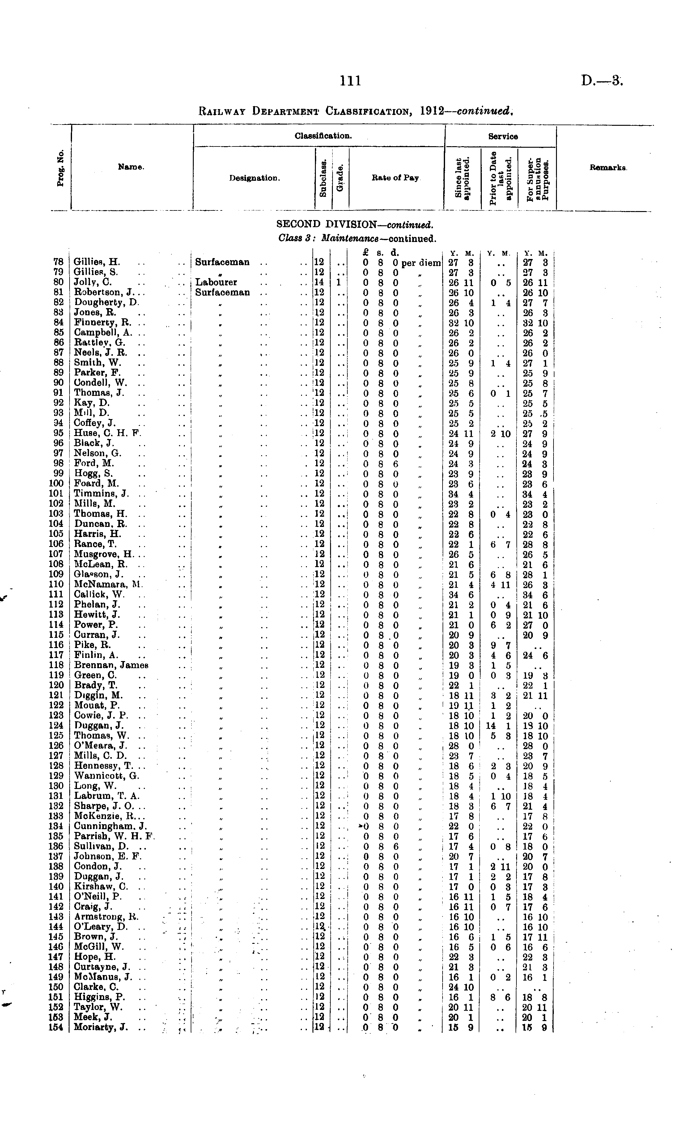 Clasi iiflcatio; Service 6 Z t'c 2 Name. I 4 i s S 12 0 2 0,-sI ».9 ° 33 = « o if |i m Remark:; Designation. ~ ■a Rate of Pay 91 SECOND I iiv: [VISION— continued. Class 3: M tint intenance— continued. 78 79 80 81 82 83 84 85 86 87 88 89 90 91 92 93 94 95 96 97 98 99 100 101 102 103 104 105 106 107 108 109 110 111 112 113 114 115 116 117 118 119 120 121 122 123 124 125 126 127 128 129 130 131 132 133 134 135 136 137 138 139 140 141 142 143 144 145 146 147 148 149 150 151 152 153 154 Gillies, H. Gillies, S. Jolly, C. Robertson, J. .. Dougherty, D. Jones, R. Finnerty, R. . . Campbell, A. .. Rattlev, G. .. Neels, J. R. Smith, W. .. Parker, P. (Jondell, W. .. Thomas, J. Kay, D. Mill, D. Coffey, J. Huse, C. H. F. Black, J. Nelson, G. Ford, M. Hogg, S. Foard, M. Timmina, J. . . Mills, M. Thomas, H. .. Duncan, R. Harris, H. Ranee, T. Musgrove, H. .. McLean, R. .. Gla»son, J. McNamara, M Callick, W. . . Phelan, J. Hewitt, J. Power, P. Curran, J. Pike, R. Fiiilin, A. Brennan, James Green, C. Brady, T. Diggin, M. .. Mouat, P. Cowie, J. P. Duggan, J. Thomas, W. .. O'Meara, J. Mills, CD. Hennessy, T. .. Wannieott, G. Long, W. Labrura, T. A. Sharpe, J. O. .. MeKenzie, It.. . Cunningham. J. Parrish, W. H. F. Sullivan, D. .. Johnson, E. P. Condon, J. Duggan, J. Kirshaw, C. . . O'Neill, P. Craig, J. Armstrong, B. O'Leary, D. .. Brown, J. McGill, W. .. Hope, H. Curtayne, J. . . McManus, J. . . Clarke, C. Higgins, P. .. Taylor, W. Meek, J. Moriarty, J. .. ■ ■ i Surfaceman . . .. 12 ..12 Labourer II Surfaceman . . .. 12 12 ..12 .. .. I . .. ..12 ..12 ..12 ..12 12 ..12 12 ..12 12 .. 12 .. ! . .. .. 12 12 .12 .12 .12 .12 ..12 ..12 . . 12 ... . .. 12 ..12 .12 .12 ..12 . . 12 .. il2 .12 .12 ..12 12 12 :: la ..12 . . 12 .12 12 ..12 . . 12 . . 12 . . 12 ..12 ..Iμ ..12 . . 12 ..12 .. „ ..12 ..12 .. 12 .12 .. 12 .. 12 .. 12 .12 .12 .12 ..12 .. 12 .. 12 .12 :-. : .: :> '■ ,, i . ■ ..12 ' r; ' ■. ■ .. ..12 ..12 .., . •>:: ..i2 :. „ .. .12 .12 .. 12 12 .."".. ..12 . :, i -„ .. ..i2 £ s. d. y. m. 0 8 0 per diem 27 3 0 8 0 „ 27 3 1 0 8 0 , 26 11 0 8 0 „ 26 10 0 8 0 „ 26 4 0 8 0 , 26 3 0 8 0 „ 32 10 0 8 0 „ 26 2 0 8 0 „ 26 2 0 8 0 „ 26 0 0 8 0 „ 25 9 0 8 0 . 25 9 0 8 0 „ 25 8 ..080 . 25 6 ..080 „ 25 5 ..080 „ 25 5 0 8 0 „ 25 2 0 8 0 . 24 11 ii 8 0 „ 24 9 0 8 0 „ 24 9 0 8 6 .. 24 3 .•080 „ 23 9 0 8 0 „ 23 6 0 8 0 „ 34 4 ..080 „ 23 2 0 8 0 „ 22 8 0 8 0 „ 22 8 0 8 0 „ 22 6 0 8 0 ., 22 1 0 8 0 „ 26 5 0 8 0 „ 21 6 0 8 0 „ 21 5 i>8 0 „ 21 4 0 8 0 „ I 34 6 0 8 0 .. i 21 2 0 8 0 „ ! 21 1 0 8 0 , 21 0 0 8 0 „ 20 9 0 8 0 „ 20 3 0 8 0 „ 20 3 0 8 0 „ 19 3 0 8 0 „ 19 0 .. I 0 8 0 „ 22 1 0 8 0 ,, 18 11 .. 0 8 0 . : 19 11 0 8 0 „ 18 10 0 8 0 . 18 10 0 8 0 ,. 18 10 0 8 0 ., 28 0 . 0 8 0 „ 28 7 0 8 0 „ 18 6 0 8 0 . 18 5 0 8 0 , 18 4 0 8 0 . 18 4 .. 0 8 0 ., 18 3 0 8 0 „ 17 8 -0 8 0 „ 22 0 0 8 0 „ 17 6 0 8 6 „ 17 4 . . 0 8 0 „ . 20 7 ..! 0 8 0 . 17 1 • .i 0 8 0 „ 17 1 0 8 0 . 17 0 0 8 0 „ 16 11 0 8 0 , 16 11 0 8 0 ., 16 10 . .i 0 8 0 „ 16 10 0 8 0 . 16 6 0 8 0 „ 16 5 0 8 0 „ I 22 3 0 8 0 , 21 3 ..080 „ 16 1 0 8 0 „ ! 24 10 0 8 0 . 16 1 0 8 0 „ 20 11 0 8 0 ., 20 1 0 8 0 . • 15 9 V. M 05 1 4 1 4 0 1 2 10 0 4 6 7 6 8 4 11 0 4 0 9 6 2 9 7 4 6 1 5 0 3 V. M. 27 3 27 3 26 11 26 10 27 7 26 3 32 10 26 2 26 2 26 0 27 1 25 9 25 8 25 7 25 5 25 .5 25 2 27 9 24 9 24 9 24 3 23 9 23 6 34 4 23 2 23 0 22 8 22 6 28 8 26 5 21 6 28 1 26 3 34 6 21 6 21 10 27 0 20 9 24 6 19 3 22 1 21 11 3 2 1 2 1 2 14 1 5 3 20 0 15 10 18 10 28 0 23 7 20 9 18 5 18 4 18 4 21 4 17 8 2-2 0 17 6 18 0 20 7 20 0 17 8 17 3 18 4 17 6 16 10 16 10 17 11 16 6 22 3 21 3 16 1 23 0 4 l'io 6 7 0 8 2 11 2 2 0 3 1 5 0 7 1 5 0 6 0 2 8 6 18 8 20 11 20 1 IS 9