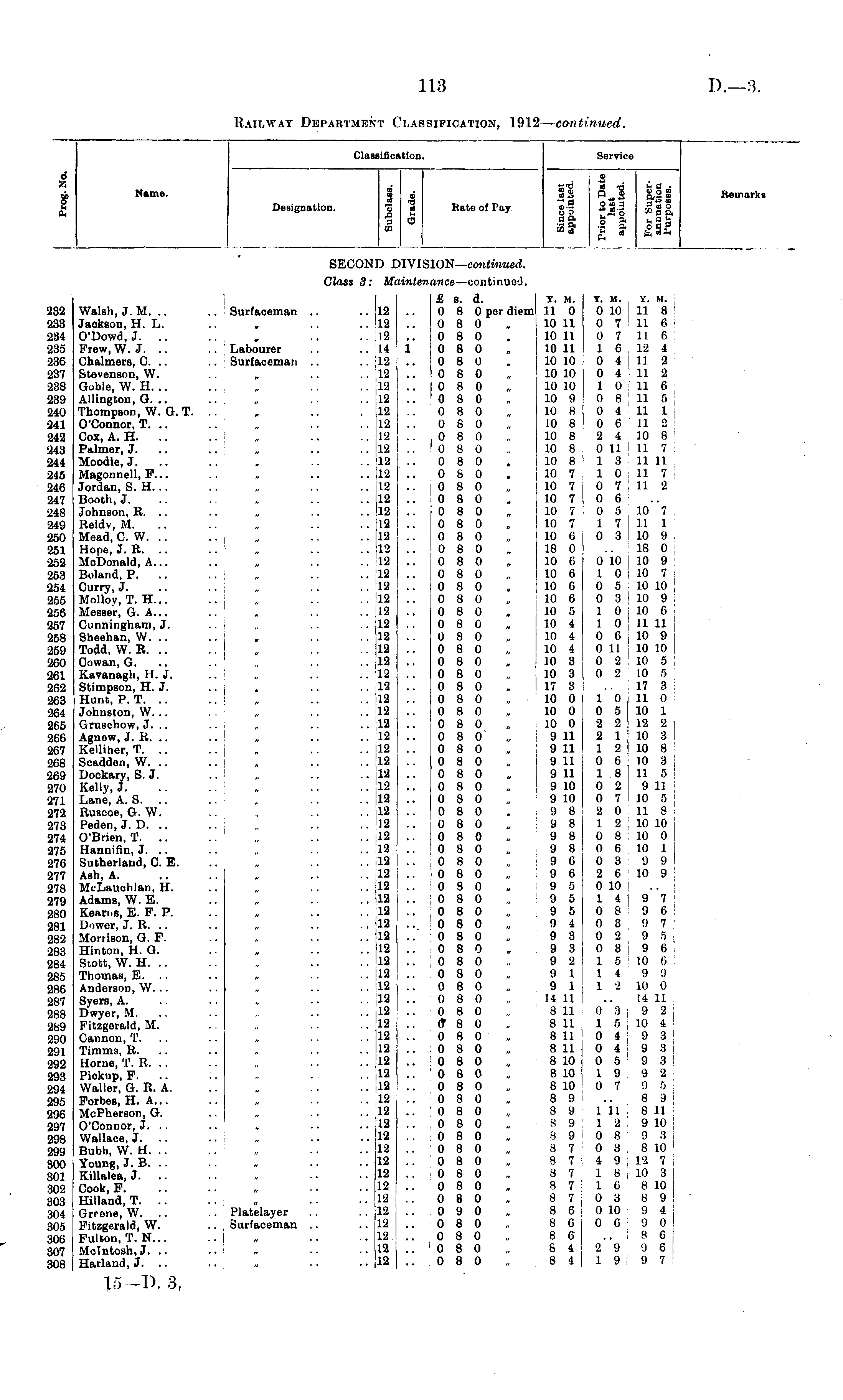 Clasi lification. Service d 7. E Name. Designation. ix IX 3 _ £ 3 CO © — aS fa e Rate of Pay is n i \\°i - "S *■" ft'S © e-2 2 2.2 23% So _£S T ' s a aft oft fa a -. co & ° ft o a a K Oi fa « JfaOlft -Remarks SECON )IVIS SION— continued. Class 3: Mi linten nance —continued. 182 188 S84 !35 186 187 133 189 140 141 112 148 144 145 146 147 !48 149 160 161 !52 !63 164 155 166 157 168 169 160 161 IG2 168 161 166 166 167 168 169 170 !71 172 173 174 175 17G 177 178 179 !80 181 132 183 184 186 18G 187 138 189 190 191 192 193 194 196 196 197 19S 199 too i(il (02 103 104 106 106 lu7 108 Walsh, J.M. .. Jackson, H. L. O'Dowd, J. .. Frew, W.J. .. Chalmers, C .. Stevenson, W. Goble, W. H. .. Allington, G. .. Thompson, W. G. T. O'Connor, T. .. Cox, A. H. Palmer, J. Moodie, J. Magonnell, F... Jordan, S. H. .. Booth, J. Johnson, R. .. Reidv, M. Mead, C. W. Hope, J. R. McDonald, A... Boland, P. .. Curry, J. Molloy, T. H... Messer, G. A... Cunningham, J. Sheehan, W. .. Todd, W. R. .. Cowan, G. Kavanagh, H.J. Stimpson, H. J. Hunt, P. T. Johnston, W. .. Gruschow, J. .. Agnew, J. R. Kelliher, T. .. Scadden, W. .. Dockary, S. J. Kelly, J. Lane, A. S. Ruscoe, G. W. Peden, J. D. O'Brien, T. .. Hannifin, J. .. Sutherland, C. E. Ash, A. McLauchlan, H. Adams, W. E. Keans, E. F. P. Dower, J. R. Morrison, G. F. Hinton, H. G. Stott, W. H. .. Thomas, E. .. Anderson, W. .. Syers, A. Dwyer, M. Fitzgerald, M. Cannon, T. Timms, R. Home, T. R. .. Pickup, P. Waller, G. R. A. Forbes, H. A... McPherson, G. O'Connor, J. .. Wallace, J. Bubb, W. H. .. Young, J. B. Killalea, J. .. Cook,F. Hilland, T. .. Greene, W. Fitzgerald, W. Fulton, T. N... Mcintosh, J. .. Harland, J. .. Surfaceman Labourer Surfacemaii .. 3 :: : :: .. | 3 " " Platelayer Surfaceman .. .. 12 12 12 14 12 12 12 12 12 12 12 12 12 ,12 12 12 !12 12 12 19 12 12 12 '12 12 12 12 13 12 12 12 12 12 12 12 12 12 12 12 12 12 12 .12 12 12 12 13 12 12 12 12 12 12 12 12 13 12 12 12 12 12 12 12 12 12 12 18 12 12 12 12 12 12 12 12 12 12 ;; £ s. d. 0 8 0 per diem! 0 8 0 0 8 0 0 8 0 0 8 0 0 8 0 0 8 0 0 8 0 0 8 0 0 8 0 ,080 1 0 8 0 0 8 0 0 8 0 0 8 0 0 8 0 0 8 0 0 8 0 0 8 0 0 8 0 0 8 0 0 8 0 0 8 0 0 8 0 0 8 0 0 8 0 0 8 0 0 8 0 0 8 0 0 8 0 0 8 0 0 8 0 0 8 0 0 8 0 0 8 0 0 8 0 0 8 0 0 8 0 0 8 0 0 8 0 0 8 0 0 8 0 0 8 0 0 8 0 0 8 0 0 8 0 0 8 0 0 8 0 0 8 0 0 8 0 0 8 0 0 8 0 0 8 0 0 8 0 0 8 0 0 8 0 0 8 0 (18 0 0 8 0 0 8 0 0 8 0 0 8 0 0 8 0 0 8 0 0 8 0 0 8 0 0 8 0 0 8 0 0 8 0 0 8 0 0 8 0 0 8 0 0 9 0 0 8 0 0 8 0 0 8 0 0 8 0 j Y. M. i! n o io n : io n ! 10 11 : 10 10 10 10 10 10 10 9 10 8 10 8 10 8 10 8 10 8 ; 10 7 I 10 7 10 7 10 7 . 10 7 10 G 18 0 10 6 10 6 10 6 10 6 10 5 10 4 10 4 10 4 10 3 10 3 17 3 10 0 10 0 10 0 9 11 9 11 9 11 9 11 j 9 10 9 10 9 8 9 8 9 8 9 8 9 0 9 6 9 5 9 5 9 5 9 4 9 8 9 3 9 2 9 1 9 1 14 11 8 11 8 11 8 11 8 11 8 10 8 10 8 10 8 9 8 9 8 9 S 9 8 7 8 7 8 7 8 7 8 7 8 G 8 6 8 6 8 4 8 4 Y. M. 1 Y. K. 0 10 11 8 0 7 11 6 0 7 11 6 1 G 12 4 0 1 11 2 0 4 11 2 1 0 11 6 0 8 I 11 5 0 4 11 1 0 6 11 2 2 4 10 8 0 11 11 7 18 11 11 1 0 ; 11 7 0 7 11 2 0 6 0 5 10 7 1 7 11 1 0 3 10 9 18 0 0 10 I 10 9 10 10 7 : 0 6 10 10 : 0 3 10 9 1 0 i 10 6 I 10 11 11 ! 0 6 10 9 0 11 ; 10 10 , 0 2 10 5 ! 0 2 10 5 17 3 10 11 0 0 5 10 1 2 2 12 2 2 1 10 3 : 1 2 10 8 0 6 10 3 1.8 11 5 0 2 9 11 0 7 10 5 2 0 11 8 1 2 , 10 10 0 8 10 0 I 0 6 10 1 0 3 9 9 I 2 6 10 9 0 10 14 9 7 0 8 9 6i 0 3 9 7 0 2 ; 9 5 0 3 j 9 6 1 5 j 10 6 14 9 9 12 10 0 14 11 0 3 | 9 2 1 5 j 10 4 0 4 ! 9 8 0 4 | 9 3 0 5 9 3 ! 19 9 2 0 7 9 5 8 9 1 11 8 11 12 9 10 0 8 9 8 0 8 8 10 4 9 12 7 18 10 3 16 8 10 0 3 8 9 0 10 9 4 0 6 9 0 8 6 2 9 9 6 19 9 7 15 -D. 3,