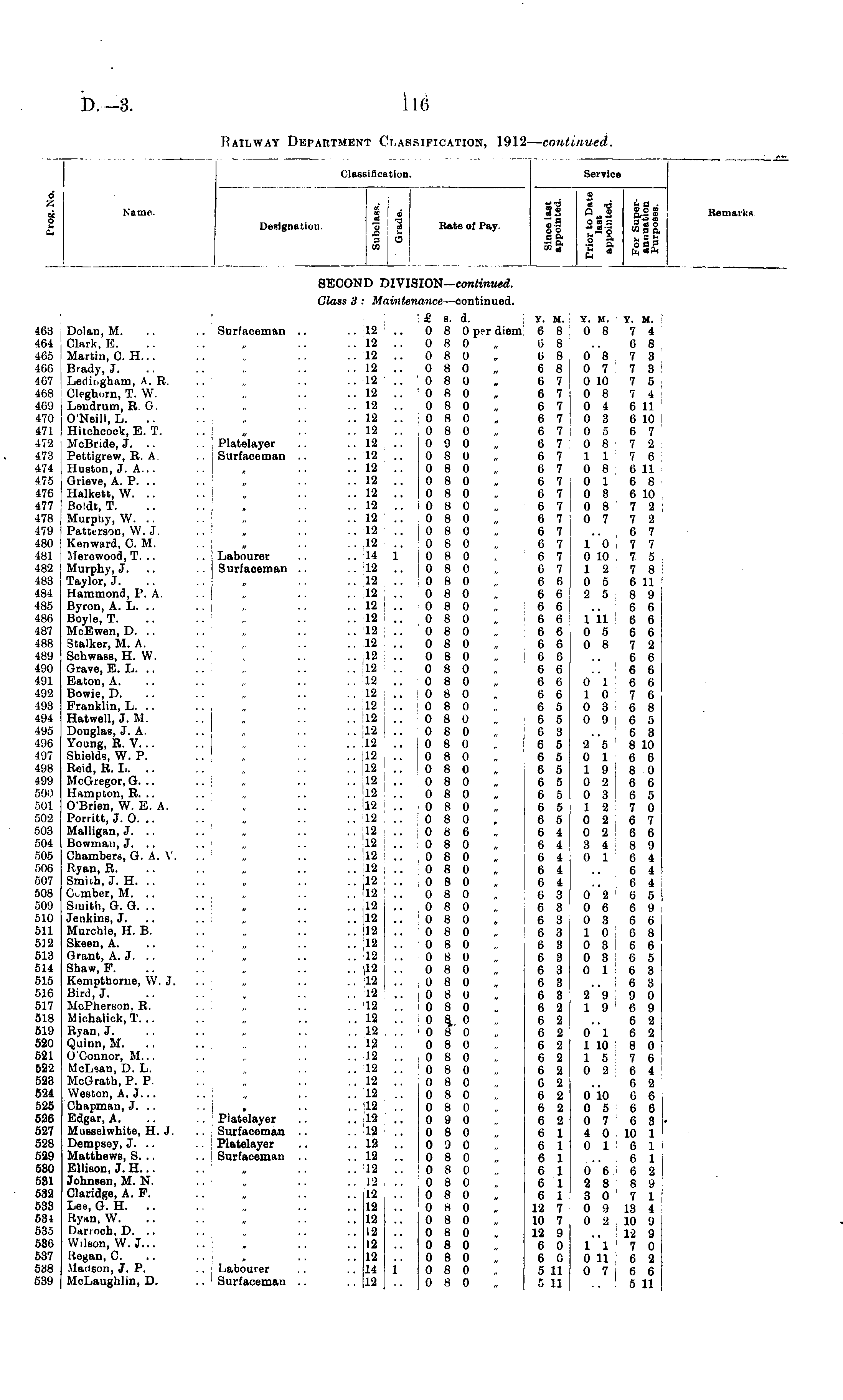 I o Name. Designation. Classification. I I II ? 3 t Service Remark;! Kate of Pay. SECOND DIVI ISION— continued. Class 3 : Maintt enance —continued. 463 464 465 460 467 468 469 470 471 472 473 474 475 476 477 478 479 480 481 482 483 484 485 486 187 488 489 490 491 492 193 494 495 4<J6 •197 498 499 500 :•> i I 502 503 504 505 506 507 B08 509 610 511 512 513 514 515 516 517 518 519 520 521 522 523 5-24 525 526 527 528 529 530 531 532 533 534 530 530 537 538 539 Dolan, M. Clark, E. Martin, C. H... Brady, J. Ijectihgham, A. R. Cleghurn, T. W. Lendrum, B G. O'Neill, L. Hitchcock, E. T. McBride, J. .. Pettigrew, K. A. Huston, J. A... Grieve, A. P. Halkett, W. .. Boldt, T. Murptiy, W. .. Patterson, W. J. Konward, C. M. Merewood, T. .. Murphy, J. Taylor, J. Hammond, P. A. Byron, A. L. Boyle, T. McEwen, D. .. Stalker, M. A. Sohwass, H. W. Grave, E. L. Eaton, A. Bowie, D. Franklin, L. .. Hatwell, J. M. Douglas, J. A. Young, R. V. .. Shields, W. P. Reid, R. L. .. McGregor, G. .. Hampton, R. .. O'Brien, W. B. A. Porritt, J. O. .. Mulligan. J. .. Bowman, J. .. Chambers, G. A. V. Ryan, R. Smuh, J. H. .. Comber, M. .. Smith, G. G. Jenkins, J. Murchie, H. B. Skeen, A. Grant, A. J. Shaw, P. Kempthorne, W. J. Bird, J. McPherson. R. Michalick, T. .. Ryan, J. Quinn, M. O'Connor, M... McLean, D. L. McGrath, P. P. Weston, A. J. .. Chapman, J. .. Edgar, A. Musselwhite, H. J. Dempsey, J. .. Matthews, S. .. Ellison, J. H... Johnsen, M. N. Claridge, A. F. Lee, G. H. .. Ryan, W. Darroch, D. .. Wilson, W.J... Regan, C. Madson, J. P. McLaughlin, D. .. Surfaceman .. .. I Platelayer .. i Surfaceman . . .. j .. Labourer .. Surfaceman .. .. I ",, ■'■ " . . Platelayer Surfaceman .. . . Platelayer . . Surfaceman .. Labourer .. ' Surfaceman .. ..12 .. ..12 .. ..12 .. ..12 .. ..12 .. ..12 .. ..12 .. ..12 .. ..12 .. ..12 .. .. 12 .. ..12 .. ..12 .. .. 12 .. ..12 .. ..12 .. .. 12 .. .. 12 .. ..14 1 ..12 .. ..12 .. ..12 .. .. 12 ' ..12 .. ..12 .. ..12 .. ..12 .. ..12 .. ..12 .. ..12 .. ..12 .. ..12 .. .12 .. .. 12 .. .. 12 .. .. 12 .. .. 12 .. ..12 .. .. ia .. .. i2 : .. ..12 .. ..12 .. .. 12 .. ..12 .. ..12 .. ..12 .. .. 12 .. .. 12 .. .. 12 .. .. V2 .. ..12 .. ..112 .. .. 12 .. 12 .. ..112 .. ..12 .. .. 12 , ..12 .. ..12 .. ..12 .. ..12 .. ..12 .. ..12 .. ..12 .. . 12 .. ..12 .. ..12 .. ..12 .. .. 12 I .. ..12 .. ..12 .. ..12 .. ..12 .. .. 12 .. ..12 .. ..14 1 .. 12 I .. If s. d. y. m. 0 8 0 p?r diem 6 8 0 8 0 „ (J 8 0 8 0 „ 6 8 0 8 0 „ 6 8 '080 „ 67 0 8 0 „ 6 7 0 8 0 „ 6 7 0 8 0 . 6 7 0 8 0 „ 6 7 0 9 0 „ 6 7 0 8 0 „ 6 7 0 8 0 „ 6 7 0 8 0 . 6 7 0 8 0 „ 6 7 i 0 8 0 „ 6 7 0 8 0 „ 6 7 0 8 0 „ 6 7 0 fct 0 „ 6 7 0 8 0 ,. 6 7 0 8 0 „ 6 7 0 8 0 „ 6 6 0 8 0 . 6 6 0 8 0 „ 6 6 0 H 0 „ 6 6 ' 0 8 0 ,. 6 6 0 8 0 . 6 6 0 8 0 „ 6 6 0 8 0 „ 6 6 0 8 0 , 6 6 0 8 0 „ 6 6 ! 0 8 0 „ 6 5 0 8 0 „ 6 5 0 8 0 „ 6 3 0 8 0 , 6 5 0 8 0 ,. 6 5 0 8 0 „ 6 5 0 8 0 „ 6 5 0 8 0 „ 6 5 0 8 0 „ 6 5 0 8 0 , 6 5 0 8 6 ., 6 4 0 8 0 „ 6 4 0 8 0 „ i64 0 8 0 „ 6 4 0 8 0 . 6 4 0 8 0 „ 6 3 0 8 0 „ 6 3 ! 0 8 0 „ 6 3 0 8 0 ,. 6 3 0 8 0 „ 6 3 0 8 0 „ 6 3 0 8 0 „ 6 3 0 8 0 . 6 3 0 8 0 , 6 3 0 8 0 „ 6 2 0 % 0 „ 6 2 ■ 0 8 0 „ 6 2 0 8 0 .. 6 2 0 8 0 „ 6 2 0 8 0 „ 6 2 0 8 0 „ 0 2 0 8 0 .. 6 2 0 8 0 .. 6 2 0 9 0 . 6 2 0 8 0 „ 6 1 0 9 0 „ 6 1 0 8 0 „ 6 1 0 8 0 „ 6 1 0 8 0 „ 6 1 0 8 0 „ 6 1 0 8 0 „ 12 7 0 8 0 „ 10 7 0 8 0 , 12 9 0 8 0 „ 6 0 0 8 0 „ 6 0 0 8 0 . 5 11 0 8 0 „ 5 11 y. m. y. m. 0 8 7 4 0 8 0 8 7 3 0 7 7 3 0 10 7 5 0 8 7 4 0 4 6 11 0 3 6 10 0 5 6 7 0 8 7 2 11 7 6 0 8 6 11 0 1 6 8 0 3 6 10 0 8 7 2 0 7 7 2 ... 6 7 10,77 0 10 7 5 12 7 8 0 5 6 11 2 5 8 9 6 6 1 11 6 6 0 5 6 6 0 8 7 2 6 6 6 6 0 1 6 6 10 7 6 0 3 6 8 o II 6 5 6 3 2 5 8 10 0 1 6 6 19 18 0 0 2 6 6 0 3 6 5 12 7 0 0 2 6 7 0 2 6 6 3 4 8 9 0 1 6 4 6 4 6 4 0 2 6 5 0 6 6 9 0 3 6 6 10 6 8 0 3 6 6 0 3 6 5 0 1 6 3 6 3 2 9 9 0 1 9 ' 6 9 6 2 0 1 6 2 1 10 8 0 15 7 6 0 2 6 4 6 2 0 10 0 6 0 5 6 6 0 7 6 3 4 0 10 1 0 1 6 1 6 1 0 6 6 2 2 8 8 9 3 0 7 1 0 9 18 4 0 :! 10 9 12 9 11 7 0 0 11 6 2 0 7 6 6 .. ! 5 11