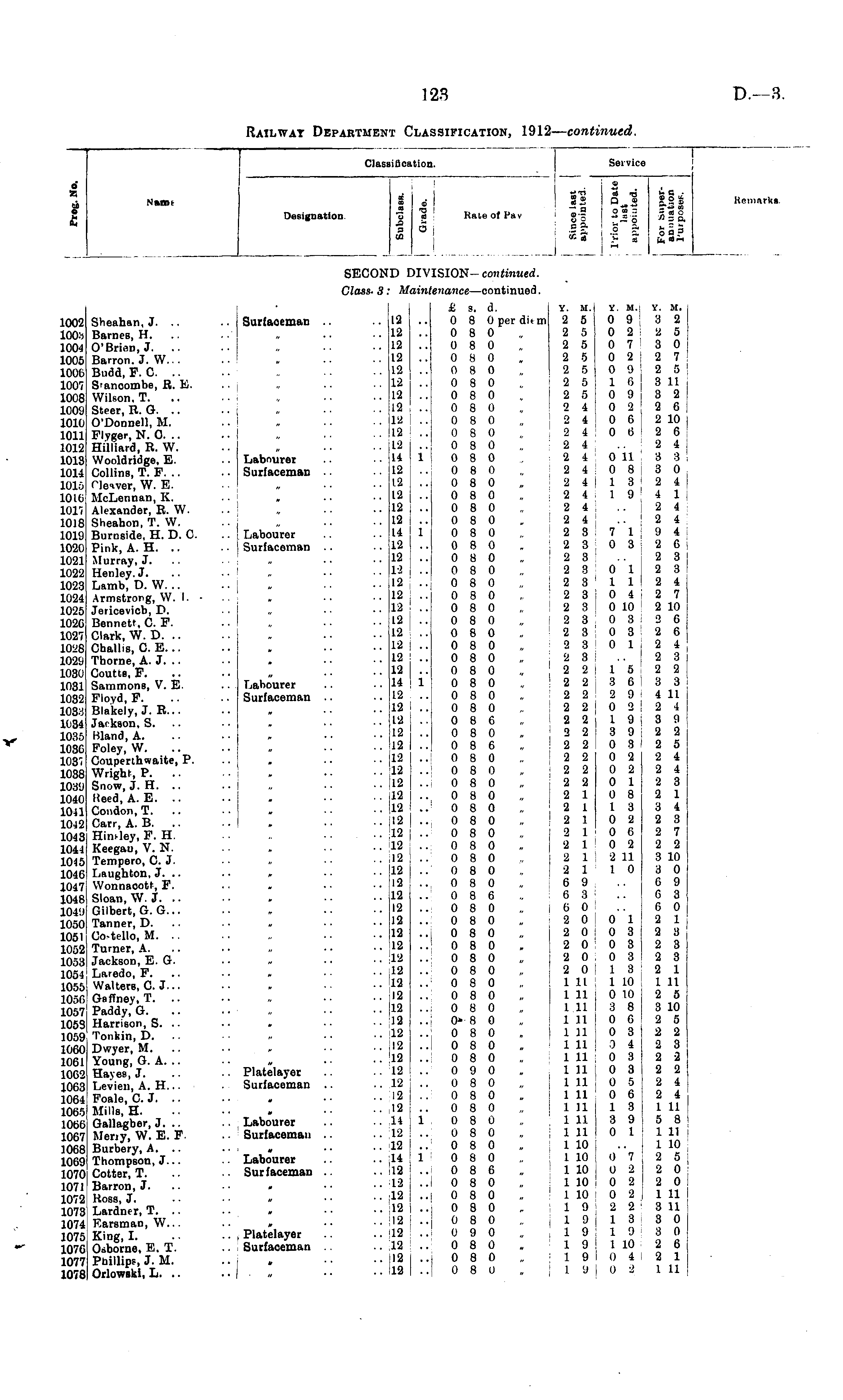 Clasi Service 1 lift cation. 4 X i I Name Designation. © £ 'a o © I O to Rate of Pav 1 "7 — d 03 fa a ,• iS a _ 92 5, '. 13 si 2 5*3 So ?£5 "=a a a. 3 a fa " a 7-3 £3 ,25ft K,»innrk8 SECOND HV IVISION- continued. Class. 3: A lint intenance —continued. 1002 1003 1004 1005 1006 1007 1008 1009 1010 1011 1012 1013 1014 1015 1016 1017 1018 1019 1020 1021 1022 1023 1024 1025 1026 1027 1028 1029 1030 1031 1032 1033 1034 1035 1036 103. 1038 1039 1040 1041 1042 1043 1044 1045 1046 1047 1048 1049 1050 1051 1052 1053 1054 1055 105G 1057| 1058! 1059 1060 1061 10G2 1063 10G4 10G5 10GG 1067: 1068! 1069! 1070J 1071 [ 1072 1073 1074, 1075! 1076: 1077 1078| Sheahan, J. .. Barnes, H. O'Brien, J. .. Barron. J. W... Budd, F. C. .. S'ancombe, R. E. Wilson. T. Steer, R. G. O'Donnell, M. Flyger, N. O. .. Hilliard, R. W. Wooldridge, E. Collins, T. F. .. Cleaver, W. E. McLennan, K. Alexander, R. W. Sheahon, T. W. Burnside, H. D. C Pink, A. H. .. Murray, J. Henley. J. Lamb, D. W. .. Armstrong, W. I. - Jericevicb, D. Bennett, C. F. Clark, W. D. Challis, CE... Thome, A. J. .. Coutta, F. Sammons, V. E. Floyd,F. Blakely, J. R... Jat kson, S. Bland, A. Foley, W. Couperthwaite, P. Wright, P. .. Snow, J. H. .. I.eed.A. E. .. Condon, T. Carr, A. B. Hin. ley, F. H. Keegau, V. N. Tempero, C. JLaughton, J. .. Wonnacotf, F. Sloan, W. J. .. Gilbert, G. G... Tanner, D. Co-tello, M. .. Turner, A. Jackson, E. G. Laredo, F. Walters, C.J... Gsffney, T. Paddy, G. Harrison, S. .. Tonkin, D. Dwyer, M. Young, G. A. .. Hayes, J. Levien, A. H... Foale, C J. Mills, H. Gallagher, J. .. Meny, W. E. F. Burbery, A. .. Thompson, J... Cotter, T. Barron, J. Ross, J. Lardner, T. .. P.arsman, W... King, I. Osborne, E. T. Phillips, J. M. Orlowski, L. .. .. Surfaceman ** .. Labourer .. Surfaceman .. [ Labourer .. j Surfaceman .. Labourer .. Surfaceman .. I Platelayer Surfaceman .. Labourer Surfacemaii Labourer Surfaceman .. Platelayer Surfaceman .. 12 .. 12 .. 12 .. 12 .. 12 .. 12 .. 12 .. 12 .. 12 .. 12 .. 12 .. 14 .. 12 .. 12 .. 12 .. 12 .. 12 .. 14 .. 12 .. 12 .. 12 .. 12 .. 12 .. 12 .. 12 .. 12 .. 12 .. 12 .. 12 .. 14 .. 12 .. 12 .. 12 .. 12 .. 12 .. 12 .. 12 .. 12 .. 12 .. 12 . IS .. 12 .. 12 .. 12 .. 12 .. 12 .. 12 .. 12 .. 12 .. 12 .. 12 .. 12 .. 12 .. 12 .. 12 .. 12 .. 12 .. 12 .. 12 .. 12 .. 12 .. 12 .. 12 .. 12 .. 14 .. 12 .. 12 .. 14 .. 12 .. 12 .. 12 .. 12 .. 12 .. 12 .. 12 .. 12 .. 12 £ s. d. 0 8 Operditm 0 8 0 0 8 0 0 3 0 0 8 0 0 8 0 0 8 0 0 8 0 0 8 0 0 8 0 0 8 0 1 0 8 0 0 8 0 0 8 0 0 8 0 0 8 0 0 8 0 1 0 8 0 0 8 0 0 8 0 0 8 0 0 8 0 0 8 0 0 8 0 0 8 0 0 8 0 0 8 0 0 8 0 0 8 0 1 0 8 0 0 8 0 0 8 0 0 8 6 0 8 0 0 8 6 0 8 0 0 8 0 0 8 0 .. 0 8 0 „ 0 8 0 0 8 0 0 8 0 0 8 0 0 8 0 .. 0 8 0 0 8 0 0 8 6 0 8 0 0 8 0 ..i 0 8 0 0 8 0 0 8 0 0 8 0 0 8 0 0 8 0 0 8 0 0* 8 0 0 8 0 0 8 0 0 8 0 0 9 0 0 8 0 0 8 0 .. 0 8 0 1 0 8 0 0 8 0 0 8 0 1 0 8 0 0 8 6 o 8 0 0 8 0 0 8 0 0 8 0 0 9 0 0 8 0 0 8 0 ..| 0 8 0 Y. M. i 2 5 2 5 2 5 2 5 2 5 2 5 2 5 2 4 2 4 2 4 2 4 2 4 2 4 2 4 2 4 2 4 2 4 2 3 2 3 2 3 2 3 2 3 2 3 2 3 2 3 2 3 2 3 j 2 3 2 2 2 2 2 2 2 2 2 2 ; 2 2 : 2 2 : 2 2 . 2 2 j 2 2 2 1 2 1 2 1 2 1 2 1 2 1 2 1 6 9 6 3 , 6 0 2 0 I 2 0 2 0 2 0 2 0 1 11 1 11 1 11 1 11 1 11 ! 1 11 1 11 1 11 1 11 1 11 1 11 1 11 1 11 1 10 1 10 1 10 : 1 10 1 10 : 1 9 , 1 9 , 1 9 1 9 ■ 1 9 ! 1 9 Y. M. Y. M. 0 9 3 2 0 2 2 5 0 7 3 0 0 2 S 2 7 n g 2 5 16 3 11 0 9 3 2 0 2 2 6 0 G 2 10 0 G 2 6 2 4 0 11 3 3 0 8:30 18 2 4 19 4 1 ..2 4 .. j 2 4 7 1 9 4 0 3 2 6 2 3 0 1 2 3 11 2 4 0-1 2 7 0 10 2 10 0 8 2 6 0 3 2 6 0 1 2 4 2 3 15 2 2 3 6 3 3 2 9 4 11 0 2 2 4 19 3 9 3 9 2 2 0 3 2 5 0 2 2 4 0 2 2 4 0 1 2 3 0 8 2 1 13 3 4 0 2 2 3 0 6 2 7 0 2 2 2 2 11 3 10 10 3 0 6 9 6 3 6 0 0 1 2 1 0 3 2 3 0 3 2 3 0 3 2 8 2 1 1 10 1 11 0 10 2 5 3 8 3 10 0 6 2 5 0 3 2 2 0 4 2 3 0 3 2 2 0 3 2 2 0 6 2 4 0 G 2 4 13 1 11 3 9 5 8 0 1 1 11 1 10 0 7 2 5 0 2 2 0 0 2 2 0 0 2 1 11 2 2 3 11 13 3 0 19 3 0 1 10 2 6 0 4:21 0 2 1 11