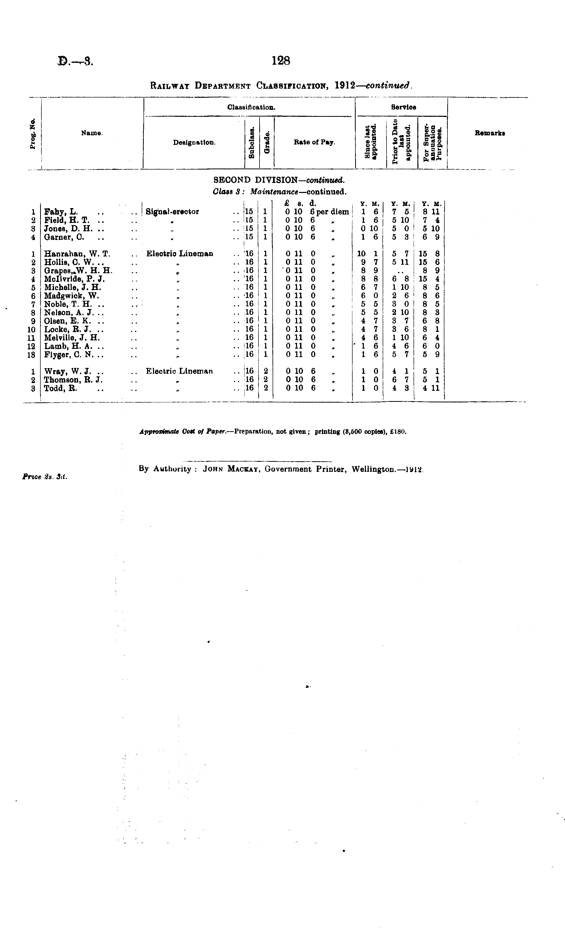 I Name. Classifici I tion. I o Rate ol Pay. 5? *J Service 6g-G.--3 g Us Designation. Remarks l_ SECOND >iv: ISION— continued. Class 3: * tint lenance —continued. 1 2 a 4 Fahy, L. Field, H. T. Jones, D. H. Garner, C. Hanrahan, W. T. Hollis, C. VV. .. Grapes,.W. H. H. Mcllvride, P. J. Michelle, J. H. Madgwick, W. Noble, T. H. .. Nelson, A. J. Olsen, E. K. Locke, R. J. Melville, J. H. Lamb, H. A. .. Flyger, C. N. .. .. I Signal-erector .. 15 ..15 ..15 ..Iβ Electric Lineman .. 16 ..16 ..16 ..16 ..16 . . 16 ..16 ..16 .. !16 ..16 .16 ..16 ..1C i i i i £ s. d. 0 10 6 per diem 0 10 6 0 10 6 0 10 6 Y. M. 1 6 : i 6 I 0 10 1 6 Y. M. 7 5 5 10 5 0 5 3 y. m. 8 11 7 i 5 10 6 9 1 2 8 i 5 6 7 8 9 .0 .1 .2 .8 i i i i i i i i i i i i i 0 11 0 0 11 0 0 11 0 0 11 0 0 11 0 0 11 0 0 11 0 0 11 0 0 11 0 0 11 0 0 11 0 0 11 0 0 11 0 10 1 9 7 8 9 ' 8 8 6 7 6 0 5 5 5 5 4 7 4 7 4 6 j 1 6 I 1 6 5 7 5 U 6 8 1 10 2 6 3 0 2 10 3 7 3 6 1 10 4 6 5 7 15 8 15 6 8 9 15 4 8 5 8 6 8 5 8 3 6 8 8 1 6 4 6 0 5 9 1 2 a Wray, W.J. Thomson, R. J. Todd, R. .. Electric Lineman .. 16 ..16 ..16 2 2 2 0 10 6 0 10 6 0 10 6 1 0 1 0 1 0 4 1 6 7 4 3 5 1 5 1 4 11
