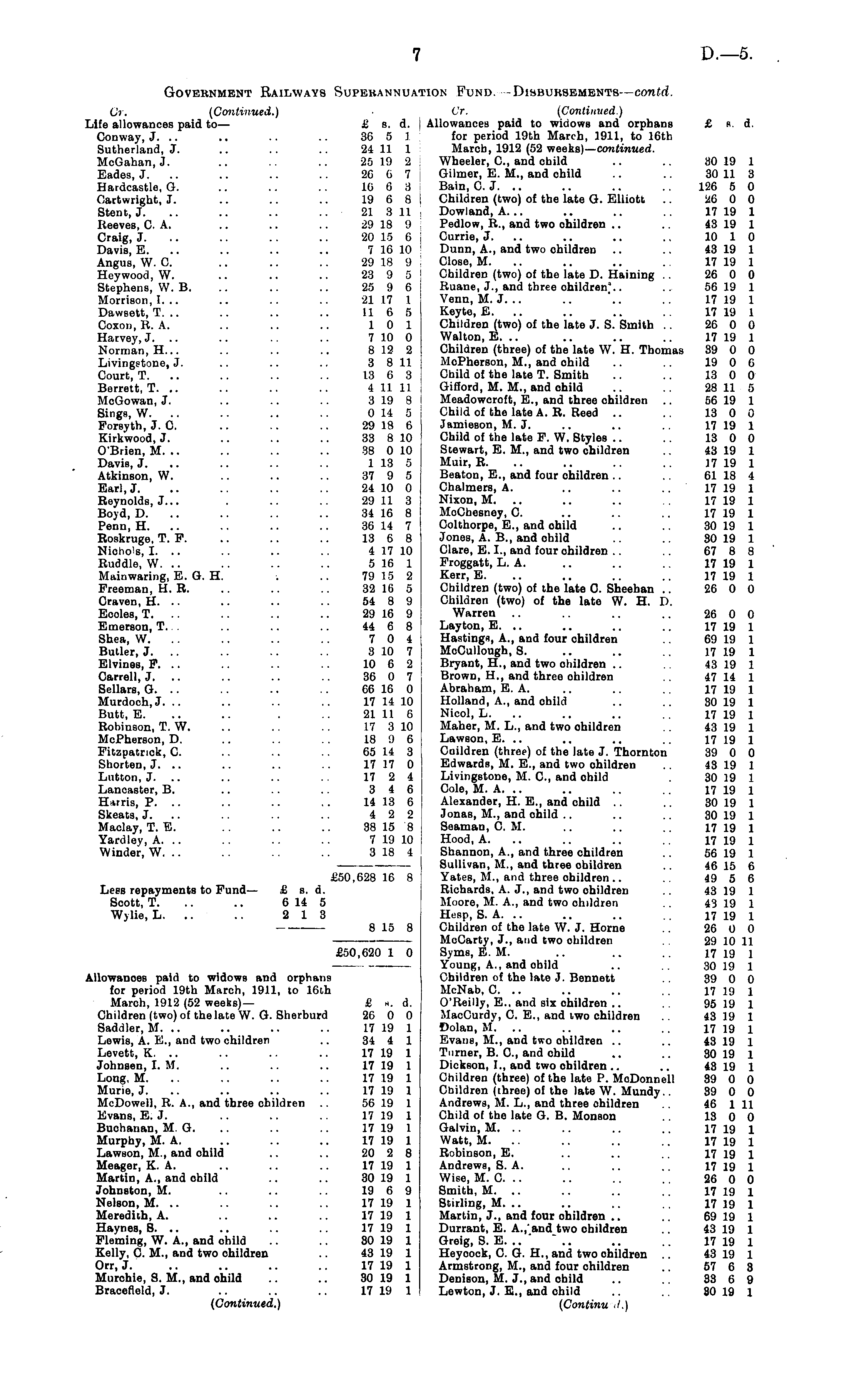 Or. (Continued.) ■ Cr. (Continued.) Life allowances paid to— £ s. d. Allowances paid to widows and orphans £ r d. Conway, J. .. .. .. .. 36 5 I for period 19th March, 1911, to 16th Sutherland, J. .. .. .. 24 11 1 March, 1912 (52 weeks)— continued. McGahan, J. .. .. .. 25 19 2 Wheeler, C, and child .. .. 30 19 1 Eades, J. .. .. .. 2G (i 7 Gilmer, E. M., and child .. .. 30 11 3 Hardcastle, G. .. .. .. 1C 6 3 Bain, C. J. .. .. .. .. 126 5 0 Oartwright, J. .. .. .. 19 6 8 Children (two) of the late G. Elliott .. iiG 0 0 Stent, J. .. .. .. .. - 21 3 11 Dowland, A. .. .. .. .. 17 19 1 Reeves, C. A. .. .. .. 29 18 9 ! Pedlow, B., and two ohildren .. .. 43 19 1 Craig, J. .. .. .. 20 15 6 Currie, J. .. .. .. .. 10 1 0 Davis, E. .. .. .. .. 7 16 10 ! Dunn, A., and two ohildren .. .. 43 19 1 Angus, W. C. .. .. .. 29 18 9 j Close, M. .. .. .. .. 17 19 1 Hey wood, W. .. .. .. 23 9 5 j Children (two) of the late D. Haining .. 26 0 0 Stephens, W. B. .. .. .. 25 9 6 Ruane, J., and three ohildren*.. .. 56 19 1 Morrison, I. .. .. .. .. -21 17 1 Venn, M. J. .. .. '.. .. 17 19 1 Dawsett, T. .. .. .. .. 11 6 5 Keyte, E. .. .. .. .. 17 19 1 Coxon, R. A. .. .. .. 10 1 Children (two) of the late J. S. Smith .. 26 0 0 Harvey, J. .. .. .. .. 7 10 0 Walton, E. .. .. .. .. 17 19 1 Norman, H... .. .. .. 8 12 2 Children (three) of the late W. H. Thomas 39 0 0 Livingstone, J. .. .. .. 3 8 11 McPherson, M., and ohild .. .. 19 0 6 Court, T. .. .. .. 13 6 3 Child of the late T. Smith .. .. 13 0 0 Berrett, T. .. .. .. .. 4 1111 Gifiord, M. M., and child .. .. 28 11 5 McGowan, J. .. .. .. 3 19 8 Meadowcroft, E., and three children .. 56 19 1 Singa, W. .. .. .. .. 0 14 5 Child of the late A. R. Reed .. .. 13 0 0 Foreyth, J. C. .. .. .. 29 18 6 Jamieeon, M. J. .. .. .. 17 19 1 Kirkwood, J. .. .. .. 33 8 10 Child of the late P. W. Styles .. .. 13 0 0 O'Brien, M... .. .. .. 38 0 10 Stewart, E. M., and two children .. 43 19 1 Davia, J. .. .. .. .. 1 13 5 Muir, R. .. .. .. .. 17 19 1 Atkinson, W. .. .. .. 37 9 5 Beaton, E., and four children.. .. 61 18 4 Earl,J. .. .. .. .. 24 10 0 Chalmers, A. .. .. .. 17 19 1 Reynolds, J... . .. .. 29 11 3 Nixon, M. .. .. .. .. 17 19 1 Boyd, D. .. .. .. .. 34 16 8 MoChesney, C. .. .. .. 17 19 1 Penn, H. .. .. .. .. 36 14 7 Colthorpe, E., and ohild .. .. 30 19 1 Roskruge, T. P. .. .. .. 13 6 8 Jones, A. B., and ohild .. .. 30 19 1 Nicho's, I. .. .. .. .. 4 17 10 Clare, E. I., and four children .. .. 67 8 8 Ruddle, W. .. .. .. .. 5 16 1 Proggatt, L. A. .. .. .. 17 19 1 Mainwaring, E. G. H. . .. 79 15 2 Kerr, B. .. .. .. .. 17 19 1 Freeman, H. R. .. .. .. 32 16 5 Children (two) of the late 0. Sheehan .. 26 0 0 Craven, H. .. .. .. .. 54 8 9 Children (two) of the late W. H. D. Eooles, T. .. .. .. .. 29 16 9 Warren .. .. .. .. 26 0 0 Emerson, T.. . .. .. .. 44 6 8 Layton, E. .. .. .. .. 17 19 1 Shea, W. .. .. .. .. 7 0 4 Hastings, A., and four children .. 69 19 1 Butler, J. .. .. .. .. 3 10 7 McCullough, S. .. .. .. 17 19 1 Elvines, F. .. .. .. .. 10 6 2 Bryant, H., and two ohildren .. .. 43 19 1 Carrell, J. .. .. .. .. 36 0 7 Brown, H., and three ohildren .. 47 14 1 Sellars, G. .. .. .. .. 66 16 0 Abraham, E. A. .. .. .. 17 19 1 Murdoch, J... .. .. .. 17 14 10 Holland, A., and ohild .. .. 30 19 1 Butt, E. .. .. . .. 21 11 6 Nicol, L. .. .. .. .. 17 19 1 Robinson, T. W. .. .. .. 17 3 10 Maher, M. L., and two ohildren .. 43 19 1 McPherson, D. .. .. .. 18 9 6 Lawson, E. .. .. .. .. 17 19 1 Fitzpatrick, C. .. .. .. 65 14 3 Cuildren (three) of the late J. Thornton 39 0 0 Shorten, J. .. .. .. .. 17 17 0 Edwards, M. E., and two children . . 43 19 1 Lntton, J. .. .. .. .. 17 2 4 Livingstone, M. C, and ohild . 30 19 1 Lancaster, B. .. .. .. 3 4 6 Cole, M. A. .. .. .. .. 17 19 1 Harris, P. .. .. .. .. 14 13 6 Alexander, H. E., and child .. .. 30 19 1 Skeats, J. .. .. .. 4 2 2 Jonas, M., and ohild .. .. .. 30 19 1 Maclay, T. E. .. .. .. 38 15 8 Seaman, C. M. .. .. .. 17 19 1 Yardley, A. .. .. .. .. 7 19 10 Hood, A. .. .. .. .. 17 19 1 Winder, W... .. .. .. 8 18 4 ] Shannon, A., and three children .. 56 19 1 Sullivan, M., and three ohildren .. 46 15 6 £50,628 16 8 Yates, M., and three ohildren.. .. 49 5 6 Lees repayments to Fund— £ s. d. Richards, A. J., and two children .. 43 19 1 Scott, T. .. .. 6 14 5 Moore, M. A., and two ohildren .. 43 19 1 Wjlie, L. .. .. 2 13 Hesp, S. A. .. .. .. .. 17 19 1 8 15 8 Children of the late W. J. Home .. 26 O 0 McCarty, J., and two ohildren 29 10 11 £50,620 1 0 Syma, E. M. .. .. .. 1719 1 Young, A., and ohild .. .. 30 19 1 Allowances paid to widows and orphans Children of the late J. Bennett .. 39 0 0 for period 19th March, 1911, to 16th McNab, C. .. .. .. .. 17 19 1 March, 1912 (52 weeks)— £ e. d. O'Reilly, E.. and six children .. .. 95 19 1 Children (two) of the late W. G. Sherburd 26 0 0 MacCurdy, C. E., and two children .. 43 19 1 Saddler, M. .. .. .. .. 17 19 1 Dolan, M. .. .. .. .. 17 19 1 Lewis, A. E., and two children .. 34 4 1 EvariB, M., and two ohildren .. .. 43 19 1 Levett, K. .. .. .. .. 17 19 1 Turner, B. C, and child .. .. 30 19 1 Johnsen, I. M. .. .. .. 17 19 1 Diekson, I., and two children.. .. 43 19 1 Long. M. .. .. .. .. 17 19 1 Children (three) of the late P. McDonnell 39 0 0 Murie, J. .. .. .. .. 17 19 1 Children (three) of the late W. Mundy.. 39 0 0 McDowell, R. A., and three children .. 56 19 1 Andrews, M. L., and three children .. 46 1 11 Evans, E. J. .. .. .. 17 19 1 Child of the late G. B. Moneon .. 13 0 0 Buchanan, M. G. .. .. .. 17 19 1 Galvin, M. .. .. .. .. 17 19 1 Murphy, M. A. .. .. .. 17 19 1 Watt, M. .. .. .. .. 17 19 1 Lawson, M., and ohild .. .. 20 2 8 Robinson, E. .. .. 17 19 1 Meager, K. A. .. .. .. 17 19 1 Andrews, 8. A. .. .. .. 17 19 1 Martin, A., and ohild .. .. 30 19 1 Wise, M. C. .. .. .. .. 26 0 0 Johnston, M. .. .. .. 19 6 9 Smith, M. .. .. .. .. 17 19 1 Nelson, M. .. .. .. .. 17 19 1 Stirling, M. .. .. .. 17 19 1 Meredith, A. .. .. .. 17 19 1 Martin, J., and four ohildren .. .. 69 19 1 Haynes, 8. .. .. .. .. 17 19