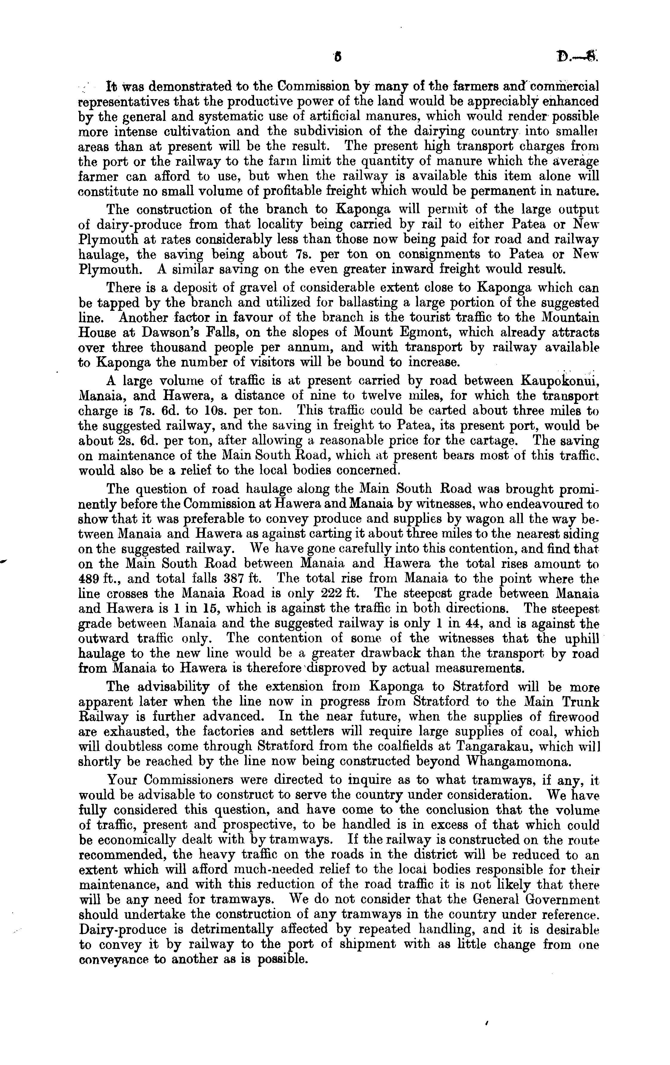 It was demonstrated to the Commission by many of the farmers and' commercial representatives that the productive power of the land would be appreciably enhanced by the general and systematic use of artificial manures, which would render possible more intense cultivation and the subdivision of the dairying country into smallei areas than at present will be the result. The present high transport charges from the port or the railway to the farm limit the quantity of manure which the average farmer can afford to use, but when the railway is available this item alone will constitute no small volume of profitable freight which would be permanent in nature. The construction of the branch to Kaponga will permit of the large output of dairy-produce from that locality being carried by rail to either Patea or New Plymouth at rates considerably less than those now being paid for road and railway haulage, the saving being about 7s. per ton on consignments to Patea or New Plymouth. A similar saving on the even greater inward freight would result. There is a deposit of gravel of considerable extent close to Kaponga which can be tapped by the branch and utilized for ballasting a large portion of the suggested line. Another factor in favour of the branch is the tourist traffic to the Mountain House at Dawson's Falls, on the slopes of Mount Egmont, which already attracts over three thousand people per annum, and with transport by railway available to Kaponga the number of visitors will be bound to increase. A large volume of traffic is at present carried by road between Kaupokonui, Manaia, and Hawera, a distance of nine to twelve miles, for which the transport charge is 7s. 6d. to 10s. per ton. This traffic could be carted about three miles to the suggested railway, and the saving in freight to Patea, its present port, would be about 2s. 6d. per ton, after allowing a reasonable price for the cartage. The saving on maintenance of the Main South Road, which at present bears most of this traffic, would also be a relief to the local bodies concerned. The question of road haulage along the Main South Road was brought prominently before the Commission at Hawera and Manaia by witnesses, who endeavoured to show that it was preferable to convey produce and supplies by wagon all the way between Manaia and Hawera as against carting it about three miles to the nearest siding on the suggested railway. We have gone carefully into this contention, and find that on the Main South Road between Manaia and Hawera the total rises amount to 489 ft., and total falls 387 ft. The total rise from Manaia to the point where the line crosses the Manaia Road is only 222 ft. The steepest grade between Manaia and Hawera is lin 15, which is against the traffic in both directions. The steepest grade between Manaia and the suggested railway is only 1 in 44, and is against the outward traffic only. The contention of some of the witnesses that the uphill haulage to the new line would be a greater drawback than the transport by road from Manaia to Hawera is therefore disproved by actual measurements. The advisability of the extension from Kaponga to Stratford will be more apparent later when the line now in progress from Stratford to the Main Trunk Railway is further advanced. In the near future, when the supplies of firewood are exhausted, the factories and settlers will require large supplies of coal, which will doubtless come through Stratford from the coalfields at Tangarakau, which will shortly be reached by the line now being constructed beyond Whangamomona. Your Commissioners were directed to inquire as to what tramways, if any, it would be advisable to construct to serve the country under consideration. We have fully considered this question, and have come to the conclusion that the volume of traffic, present and prospective, to be handled is in excess of that which could be economically dealt with by tramways. If the railway is constructed on the route recommended, the heavy traffic on the roads in the district will be reduced to an extent which will afford much-needed relief to the local bodies responsible for their maintenance, and with this reduction of the road traffic it is not likely that there will be any need for tramways. We do not consider that the General Government should undertake the construction of any tramways in the country under reference. Dairy-produce is detrimentally affected by repeated handling, and it is desirable to convey it by railway to the port of shipment with as little change from one conveyance to another as is possible.