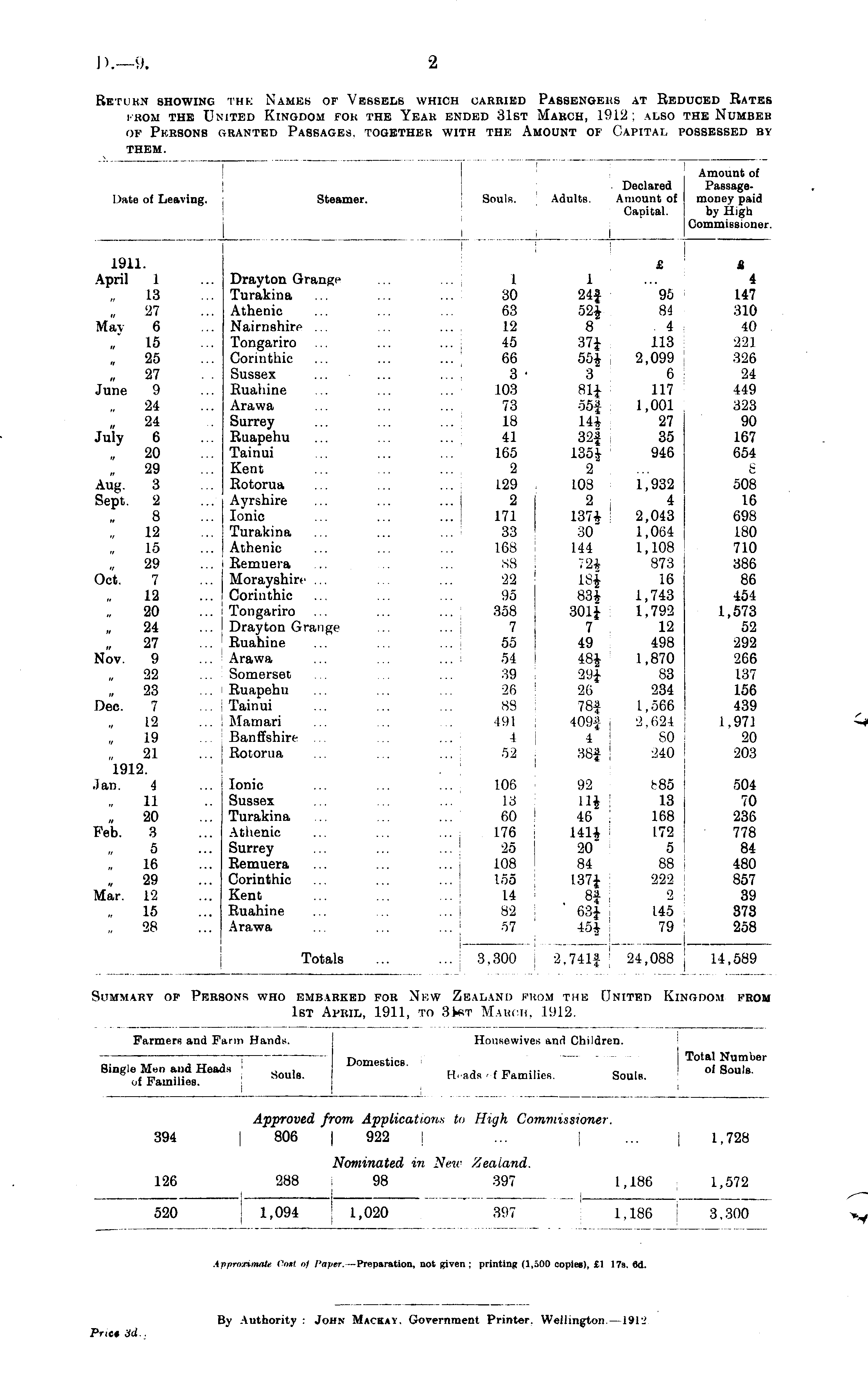Summary of Persons who embarked for New Zealand from the United Kingdom from 1st April, 1911, to 31st March, 1912.
