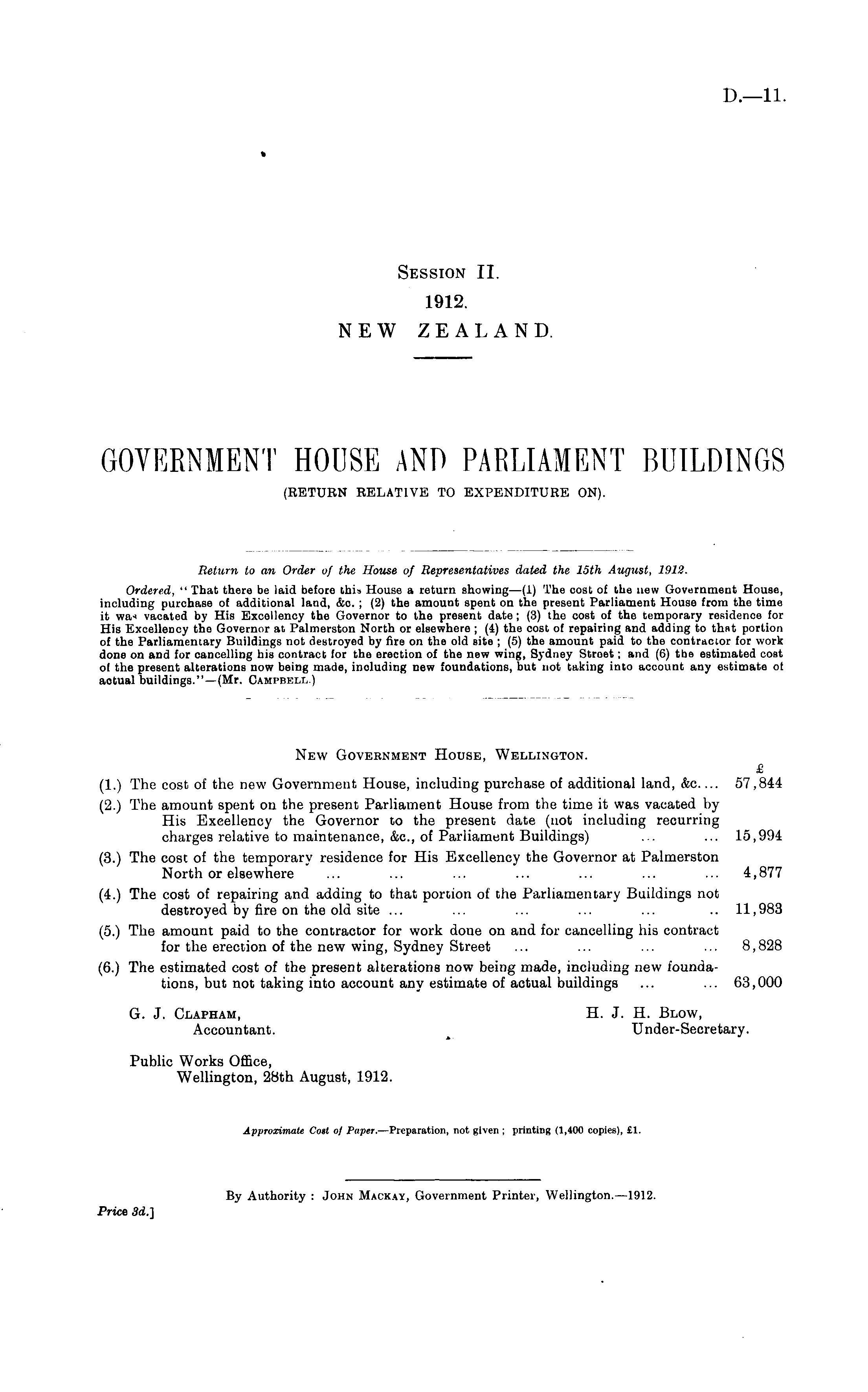 Return to an Order of the House of Representatives dated the 15th August, 1912. Ordered, " That there be laid before this House a return showing—(l) The cost of the new Government House, including purchase of additional land, &c. ; (2) the amount spent on the present Parliament House from the time it via< vacated by His Excellency the Governor to the present date; (3) the cost of the temporary residence for His Excellency the Governor at Palmerston North or elsewhere ; (4) the cost of repairing and adding to thflt portion of the Parliamentary Buildings not destroyed by fire on the old site ; (5) the amount paid to the contractor for work done on and for cancelling his contract for the erection of the new wing, Sydney Street; and (6) the estimated cost o( the present alterations now being made, including new foundations, but not taking into account any estimate of aotual buildings."—(Mr. Campbell.) New Government House, Wellington. & (1.) The cost of the new Government House, including purchase of additional land, &c— 57,844 (2.) The amount spent on the present Parliament House from the time it was vacated by His Excellency the Governor to the present date (not including recurring charges relative to maintenance, &c, of Parliament Buildings) ... ... 15,994 (3.) The cost of the temporary residence for His Excellency the Governor at Palmerston North or elsewhere ... ... ... ... ... ... ... 4,877 (4.) The cost of repairing and adding to that portion of the Parliamentary Buildings not destroyed by fire on the old site ... ... ... ... ... .. 11,983 (5.) The amount paid to the contractor for work done on and for cancelling his contract for the erection of the new wing, Sydney Street ... ... ... ... 8,828 (6.) The estimated cost of the present alterations now being made, including new foundations, but not taking into account any estimate of actual buildings ... ... 63,000 G. J. Clapham, H. J. H. Blow, Accountant. Under-Secretary. Public Works Office, Wellington, 28th August, 1912.