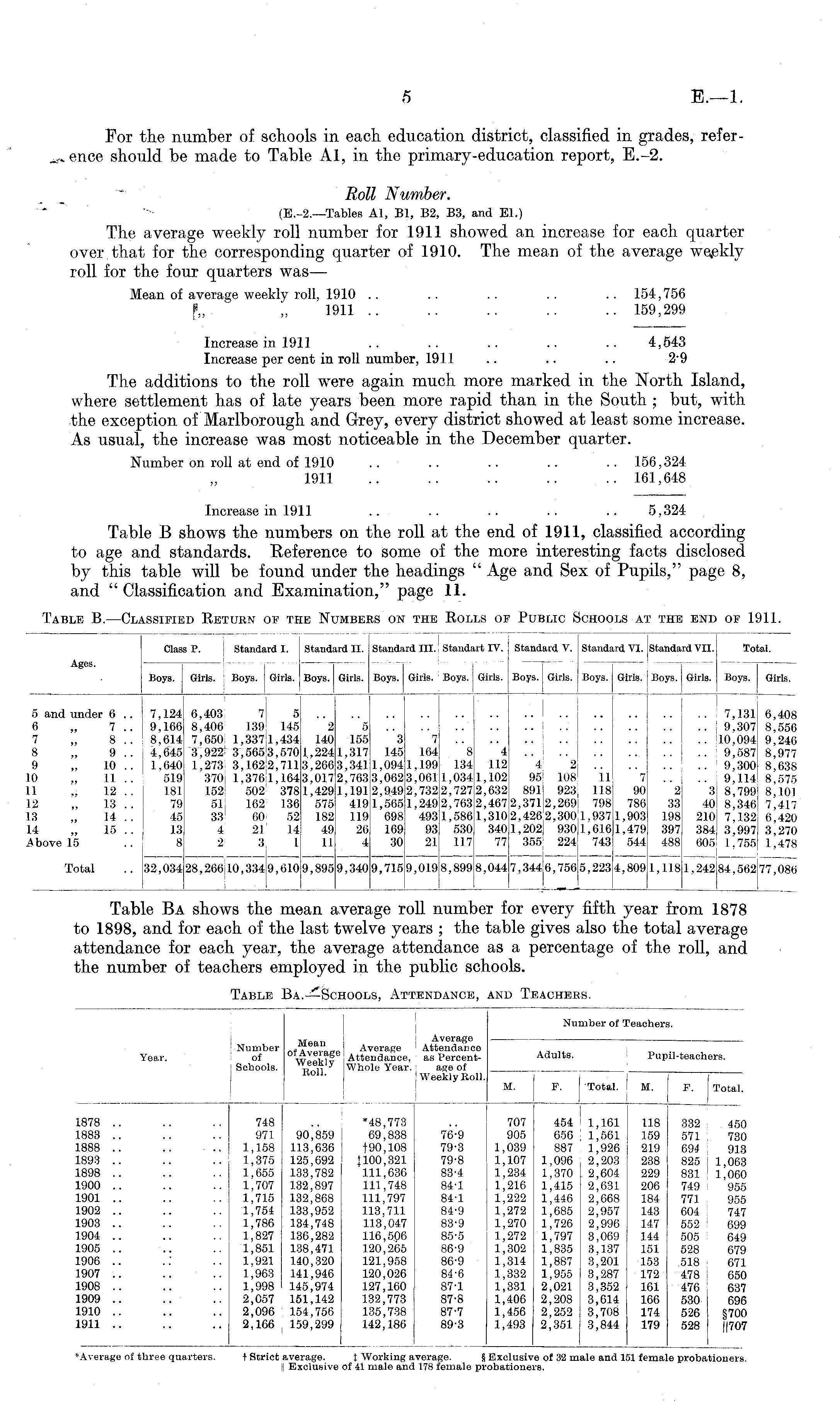 Table Bα shows the mean average roll number for every fifth year from 1878 to 1898, and for each of the last twelve years ; the table gives also the total average attendance for each year, the average attendance as a percentage of the roll, and the number of teachers employed in the public schools.