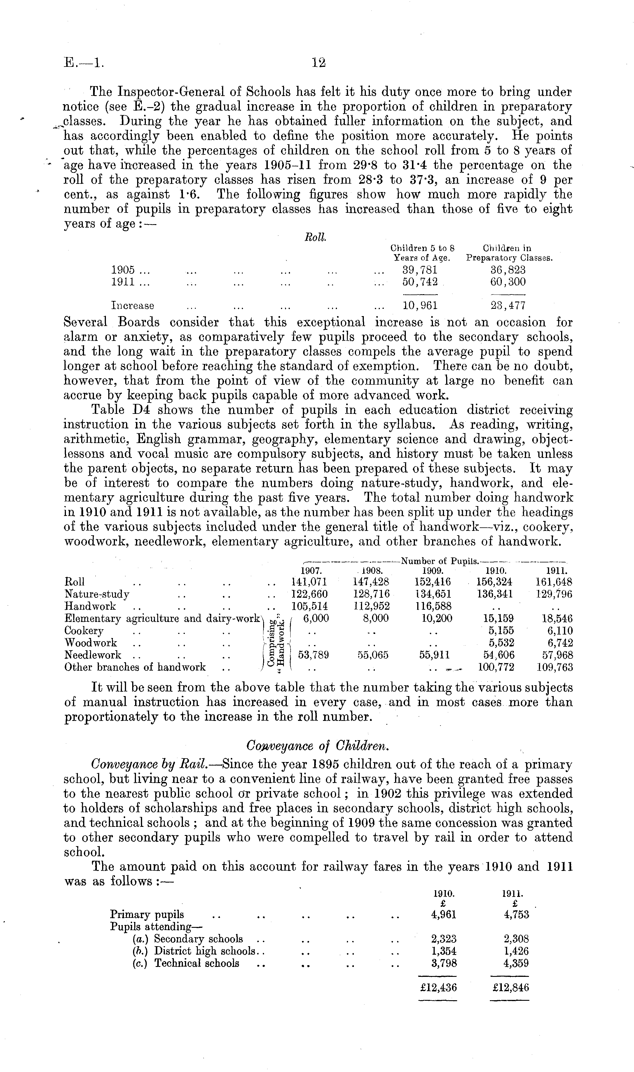 The Inspector-General of Schools has felt it his duty once more to bring under notice (see E.-2) the gradual increase in the proportion of children in preparatory .classes. During the year he has obtained fuller information on the subject, and has accordingly been enabled to define the position more accurately. He points out that, while the percentages of children on the school roll from 5 to 8 years of age have increased in the years 1905-11 from 29*8 to 31-4 the percentage on the roll of the preparatory classes has risen from 28*3 to 373, an increase of 9 per cent., as against I' 6. The following figures show how much more rapidly the number of pupils in preparatory classes has increased than those of five to eight years of age : — Roll. Children 5 to 8 Children in Years of Age. Preparatory Classes. 1905 ... ... ... ... ... ... 39,781 36,823 1911 ... ... ... ... .. ... 50,742 60,300 Increase ... ... ... ... ... 10,961 23,477 Several Boards consider that this exceptional increase is not an occasion for alarm or anxiety, as comparatively few pupils proceed to the secondary schools, and the long wait in the preparatory classes compels the average pupil to spend longer at school before reaching the standard of exemption. There can be no doubt, however, that from the point of view of the community at large no benefit can accrue by keeping back pupils capable of more advanced work. Table D 4 shows the number of pupils in each education district receiving instruction in the various subjects set forth in the syllabus. As reading, writing, arithmetic, English grammar, geography, elementary science and drawing, objectlessons and vocal music are compulsory subjects, and history must be taken unless the parent objects, no separate return has been prepared of these subjects. It may be of interest to compare the numbers doing nature-study, handwork, and elementary agriculture during the past five years. The total number doing handwork in 1910 and 1911 is not available, as the number has been split up under the headings of the various subjects included under the general title of handwork —viz., cookery, woodwork, needlework, elementary agriculture, and other branches of handwork. , Number of Pupils. 1907. 1908. 1909. 1910. 1911. Roll .. .. .. .. 141,071 147,428 152,416 156,324 161,648 Nature-study .. .. .. 122,660 128,716 134,651 136,341 129,796 Handwork .. .. .. .. 105,514 112,952 116,588 Elementary agriculture and dairy-work\ / 6,000 8,000 10,200 15,159 18,546 Cookery . . .. . . 1 J "g |.. .. .. 5,155 6,110 Woodwork .. .. .. pftl-f .. .. .. 5,532 6,742 Needlework .. .. .. i| § 53,789 55,065 55,911 54,606 57,968 Other branches of handwork .. Z o ?' .. .. .. 100,772 109,763 It will be seen from the above table that the number taking the various subjects of manual instruction has increased in every case, and in most cases more than proportionately to the increase in the roll number. Conveyance of Children. Conveyance by Rail. —Since the year 1895 children out of the reach of a primary school, but living near to a convenient line of railway, have been granted free passes to the nearest public school or private school; in 1902 this privilege was extended to holders of scholarships and free places in secondary schools, district high schools, and technical schools ; and at the beginning of 1909 the same concession was granted to other secondary pupils who were compelled to travel by rail in order to attend school. The amount paid on this account for railway fares in the years 1910 and 1911 was as follows :— 1910. 1911. £ £ Primary pupils .. .. .. .. .. 4,961 4,753 Pupils attending— (a.) Secondary schools .. .. .. .. 2,323 2,308 (b.) District high schools.. .. .. .. 1,354 1,426 (c.) Technical schools .. .. .. .. 3,798 4,359 £12,436 £12,846