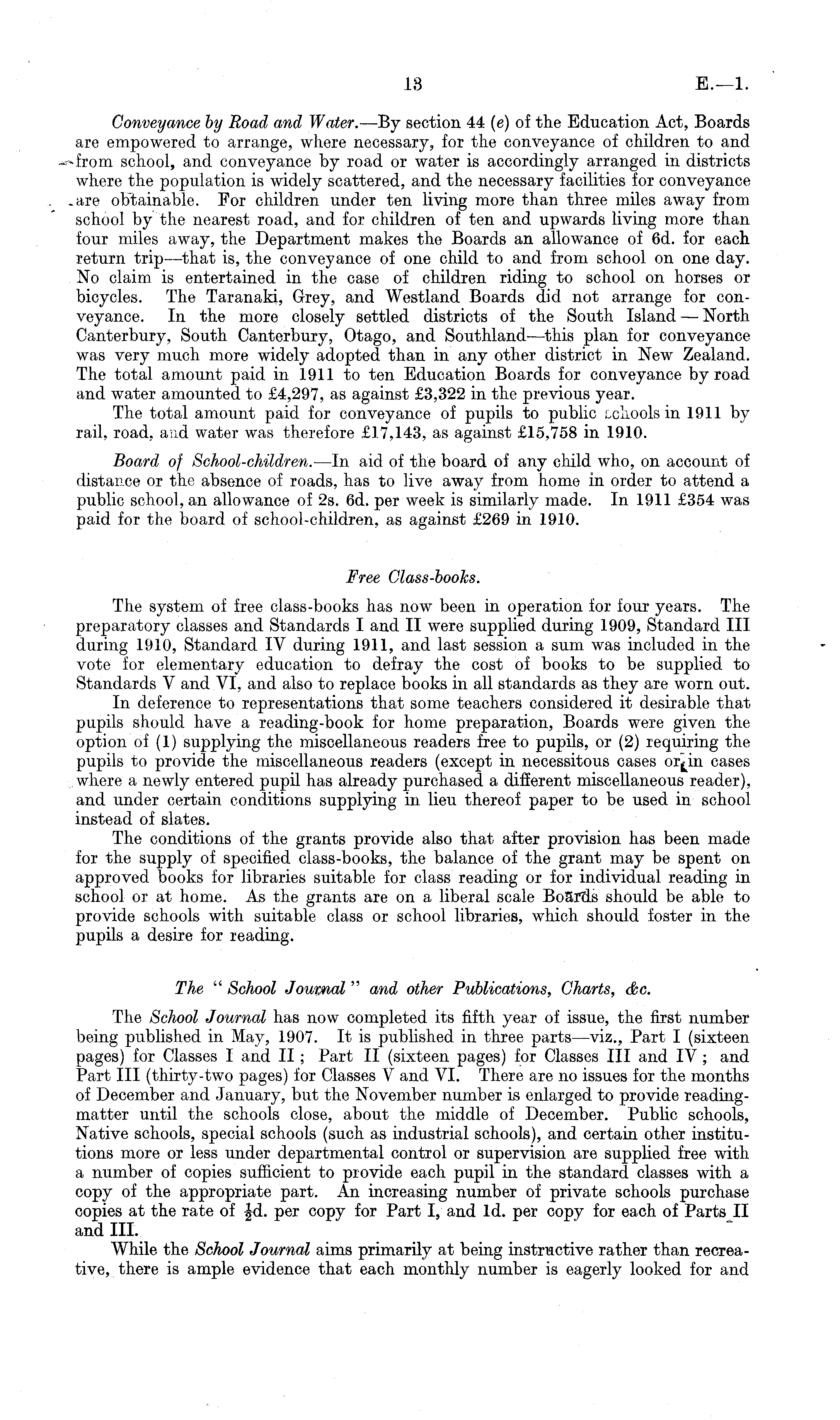 Conveyance by Road and Water. —By section 44 (c) of the Education Act, Boards are empowered to arrange, where necessary, for the conveyance of children to and from school, and conveyance by road or water is accordingly arranged in districts where the population is widely scattered, and the necessary facilities for conveyance are obtainable. For children under ten living more than three miles away from school by the nearest road, and for children of ten and upwards living more than four miles away, the Department makes the Boards an allowance of 6d. for each return trip—that is, the conveyance of one child to and from school on one day. No claim is entertained in the case of children riding to school on horses or bicycles. The Taranaki, Grey, and Westland Boards did not arrange for conveyance. In the more closely settled districts of the South Island — North Canterbury, South Canterbury, Otago, and Southland —this plan for conveyance was very much more widely adopted than in any other district in New Zealand. The total amount paid in 1911 to ten Education Boards for conveyance byroad and water amounted to £4,297, as against £3,322 in the previous year. The total amount paid for conveyance of pupils to public Lcliools in 1911 by rail, road, and water was therefore £17,143, as against £15,758 in 1910. Board of School-children. —In aid of the board of any child who, on account of distance or the absence of roads, has to live away from home in order to attend a public school, an allowance of 2s. 6d. per week is similarly made. In 1911 £354 was paid for the board of school-children, as against £269 in 1910. Free Class-books. The system of free class-books has now been in operation for four years. The preparatory classes and Standards I and II were supplied during 1909, Standard 111 during 1910, Standard IV during 1911, and last session a sum was included in the vote for elementary education to defray the cost of books to be supplied to Standards V and VI, and also to replace books in all standards as they are worn out. In deference to representations that some teachers considered it desirable that pupils should have a reading-book for home preparation, Boards were given the option of (1) supplying the miscellaneous readers free to pupils, or (2) requiring the pupils to provide the miscellaneous readers (except in necessitous cases orjan cases where a newly entered pupil has already purchased a different miscellaneous reader), and under certain conditions supplying in lieu thereof paper to be used in school instead of slates. The conditions of the grants provide also that after provision has been made for the supply of specified class-books, the balance of the grant may be spent on approved books for libraries suitable for class reading or for individual reading in school or at home. As the grants are on a liberal scale Boards should be able to provide schools with suitable class or school libraries, which should foster in the pupils a desire for reading. The " School Journal " and other Publications, Charts, &c. The School Journal has now completed its fifth year of issue, the first number being published in May, 1907. It is published in three parts—viz., Part I (sixteen pages) for Classes I and II; Part II (sixteen pages) for Classes 111 and IV ; and Part 111 (thirty-two pages) for Classes V and VI. There are no issues for the months of December and January, but the November number is enlarged to provide readingmatter until the schools close, about the middle of December. Public schools, Native schools, special schools (such as industrial schools), and certain other institutions more or less under departmental control or supervision are supplied free with a number of copies sufficient to provide each pupil in the standard classes with a copy of the appropriate part. An increasing number of private schools purchase copies at the rate of Jd. per copy for Part I, and Id. per copy for each of Parts II and 111. While the School Journal aims primarily at being instructive rather than recreative, there is ample evidence that each monthly number is eagerly looked for and