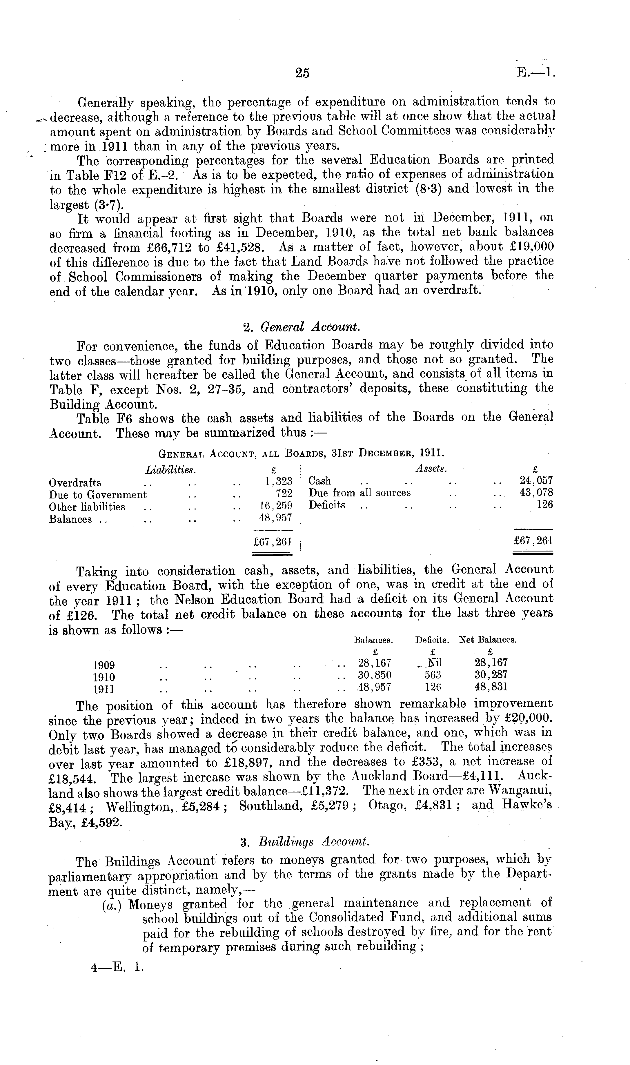Generally speaking, the percentage of expenditure on administration tends to decrease, although a reference to the previous table will at once show that the actual amount spent on administration by Boards and School Committees was considerably more in. 1911 than in any of the previous years. The corresponding percentages for the several Education Boards are printed in Table Fl2 of E.--2. As is to be expected, the ratio of expenses of administration to the whole expenditure is highest in the smallest district (8-3) and lowest in the largest (3-7). It would appear at first sight that Boards were not in December, 1911, on so firm a financial footing as in December, 1910, as the total net bank balances decreased from £66,712 to £41,528. As a matter of fact, however, about £19,000 of this difference is due to the fact that Land Boards have not followed the practice of School Commissioners of making the December quarter payments before the end of the calendar year. As in 1910, only one Board had an overdraft. 2. General Account. For convenience, the funds of Education Boards may be roughly divided into two classes—those granted for building purposes, and those not so granted. The latter class will hereafter be called the General Account, and consists of all items in Table F, except Nos. 2, 27-35, and contractors' deposits, these constituting the Building Account. . : Table F6 shows the cash assets and liabilities of the Boards on the General Account. These may be summarized thus : — General Account, all Boards, 31st December, 1911. Liabilities. £ Assets. £ Overdrafts .. .. .. 1.323 Cash .. .. .. .. 24,057 Due to Government .. .. "22 Due from all sources .. ~ 43,078 Other liabilities .. .. .. 16,259 Deficits .. .. .. .. 126 Balances .. .. .. ..48,957 £67,26] £67,261 Taking into consideration cash, assets, and liabilities, the General Account of every Education Board, with the exception of one, was in credit at the end of the year 1911 ; the Nelson Education Board had a deficit on its General Account of £126. The total net credit balance on these accounts for the last three years is shown as follows : — Balances. Deficits. Net Balances. £ £ £ 1909 .. •• ■• 28,167 Nil 28,167 1910 .. ..30,850 563 30,287 1911 .. .. .. .. .. .48,957 126 48,831 The position of this account has therefore shown remarkable improvement since the previous year; indeed in two years the balance has increased by £20,000. Only two Boards showed a decrease in their credit balance, and one, which was in debit last year, has managed to considerably reduce the deficit. The total increases over last year amounted to £18,897, and the decreases to £353, a net increase of £18,544. The largest increase was shown by the Auckland Board —£4,111. Auckland also shows the largest credit balance—£ll,372. The next in order are Wanganui, £8,414; Wellington, £5,284 ; Southland, £5,279 ; Otago, £4,831 ; and Hawke's Bay, £4,592. 3. Buildings Account. The Buildings Account refers to moneys granted for two purposes, which by parliamentary appropriation and by the terms of the grants made by the Department are quite distinct, namely,— (a.) Moneys granted for the general maintenance and replacement of school buildings out of the Consolidated Fund, and additional sums paid for the rebuilding of schools destroyed by fire, and for the rent of temporary premises during such rebuilding ;