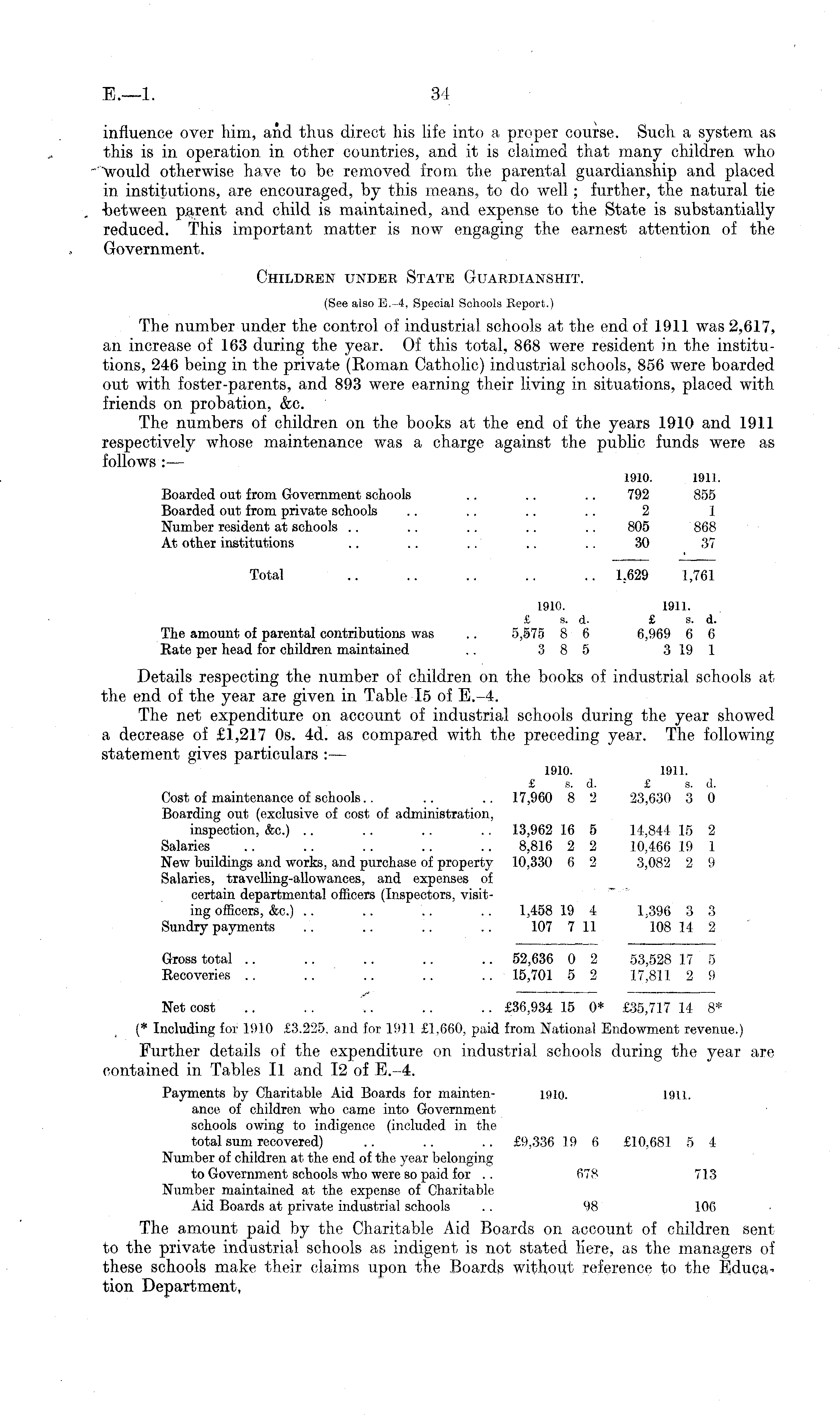 influence over him, and thus direct his life into a proper course. Such a system as this is in operation in other countries, and it is claimed that many children who would otherwise have to be removed from the parental guardianship and placed in institutions, are encouraged, by this means, to do well; further, the natural tie between parent and child is maintained, and expense to the State is substantially reduced. This important matter is now engaging the earnest attention of the Government. Children under State Guardianship. (See also E.-4, Special Schools Report.) The number under the control of industrial schools at the end of 1911 was 2,617, an increase of 163 during the year. Of this total, 868 were resident in the institutions, 246 being in the private (Roman Catholic) industrial schools, 856 were boarded out with foster-parents, and 893 were earning their living in situations, placed with friends on probation, &c. The numbers of children on the books at the end of the years 1910 and 1911 respectively whose maintenance was a charge against the public funds were as follows : — 1910. 1911. Boarded out from Government schools .. .. .. 792 855 Boarded out from private schools .. .. .. .. 2 1 Number resident at schools .. .. .. .. .. 805 868 At other institutions .. .. .. .. .. 30 37 Total .. .. .. .. .. 1 : 629 1,761 1910. 1911. £ s. d. £ s. d. The amount of parental contributions was .. 5,575 8 6 6,969 6 6 Eate per head for children maintained .. 3 8 5 3 19 1 Details respecting the number of children on the books of industrial schools at the end of the year are given in Table 15 of E.-4. The net expenditure on account of industrial schools during the year showed a decrease of £1,217 os. 4d. as compared with the preceding year. The following statement gives particulars : — 1910. 1911. £ s. d. £ s. d. Cost of maintenance of schools.. .. .. 17,960 8 2 23,630 3 0 Boarding out (exclusive of cost of administration, inspection, &c.) .. .. .. .. 13,962 16 5 14,844 15 2 Salaries .. .. .. .. .. 8,816 2 2 10,466 19 1 New buildings and works, and purchase of property 10,330 6 2 3,082 2 9 Salaries, travelling-allowances, and expenses of certain departmental officers (Inspectors, visiting officers, &c.) .. .. .. .. 1,458 19 4 1.396 3 3 Sundry payments .. .. .. .. 107 711 108 14 2 Gross total .. .. .. .. .. 52,636 0 2 53,528 17 5 Eecoveries .. .. .. .. .. 15,701 5 2 17,811 2 9 . „ Net cost .. .. .. .. .. £36,934 15 0* £35,717 14 8* (* Including for 1910 £3.225. and for 1911 £1,660, paid from National Endowment revenue.) Further details of the expenditure on industrial schools during the year are contained in Tables II and 12 of E.--4. Payments by Charitable Aid Boards for mainten- 1910. 1911. ance of children who came into Government schools owing to indigence (included in the total sum recovered) .. .. .. £9,336 19 6 £10,681 5 4 Number of children at the end of the year belonging to Government schools who were so paid for .. 678 713 Number maintained at the expense of Charitable Aid Boards at private industrial schools .. 98 106 The amount paid by the Charitable Aid Boards on account of children sent to the private industrial schools as indigent is not stated Here, as the managers of these schools make their claims upon the Boards without reference to the Education Department,