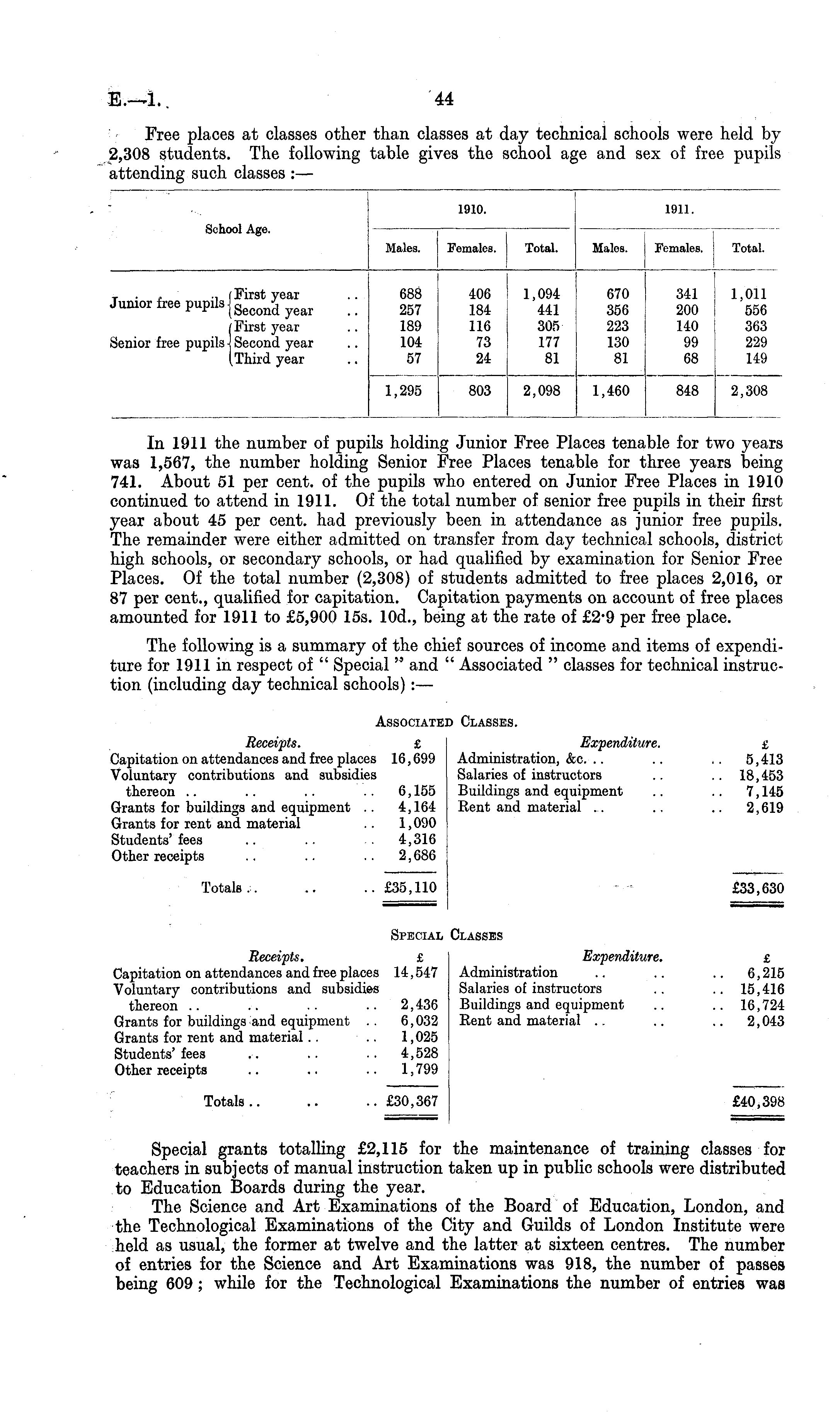 In 1911 the number of pupils holding Junior Free Places tenable for two years was 1,567, the number holding Senior Free Places tenable for three years being 741. About 51 per cent, of the pupils who entered on Junior Free Places in 1910 continued to attend in 1911. Of the total number of senior free pupils in their first year about 45 per cent, had previously been in attendance as junior free pupils. The remainder were either admitted on transfer from day technical schools, district high schools, or secondary schools, or had qualified by examination for Senior Free Places. Of the total number (2,308) of students admitted to free places 2,016, or 87 per cent., qualified for capitation. Capitation payments on account of free places amounted for 1911 to £5,900 15s. 10d., being at the rate of £2-9 per free place. The following is a summary of the chief sources of income and items of expenditure for 1911 in respect of " Special " and " Associated " classes for technical instruction (including day technical schools): — Associated Classes. Receipts. £ Expenditure. £ Capitation on attendances and free places 16,699 Administration, &c. .. .. .. 5,413 Voluntary contributions and subsidies Salaries of instructors .. .. 18,453 thereon .. .. .. .. 6,155 Buildings and equipment .. .. 7,145 Grants for buildings and equipment .. 4,164 Rent and material >. .. .. 2,619 Grants for rent and material .. 1,090 Students'fees .. .. .. 4,316 Other receipts .. .. .. 2,686 Totals.. .. ..£35,110 £33,630 Special Classes Receipts. £ Expenditure. £ Capitation on attendances and free places 14,547 Administration .. .. .. 6,215 Voluntary contributions and subsidies Salaries of instructors .. .. 15,416 thereon .. .. .. .. 2,436 Buildings and equipment .. .. 16,724 Grants for buildings and equipment .. 6,032 Rent and material .. .. .. 2,043 Grants for rent and material.. .. 1,025 Students'fees .. .. .. 4,528 Other receipts .. .. .. 1,799 Totals.. .. .. £30,367 £40,398 Special grants totalling £2,115 for the maintenance of training classes for teachers in subjects of manual instruction taken up in public schools were distributed to Education Boards during the year. The Science and Art Examinations of the Board of Education, London, and the Technological Examinations of the City and Guilds of London Institute were held as usual, the former at twelve and the latter at sixteen centres. The number of entries for the Science and Art Examinations was 918, the number of passes being 609; while for the Technological Examinations the number of entries was