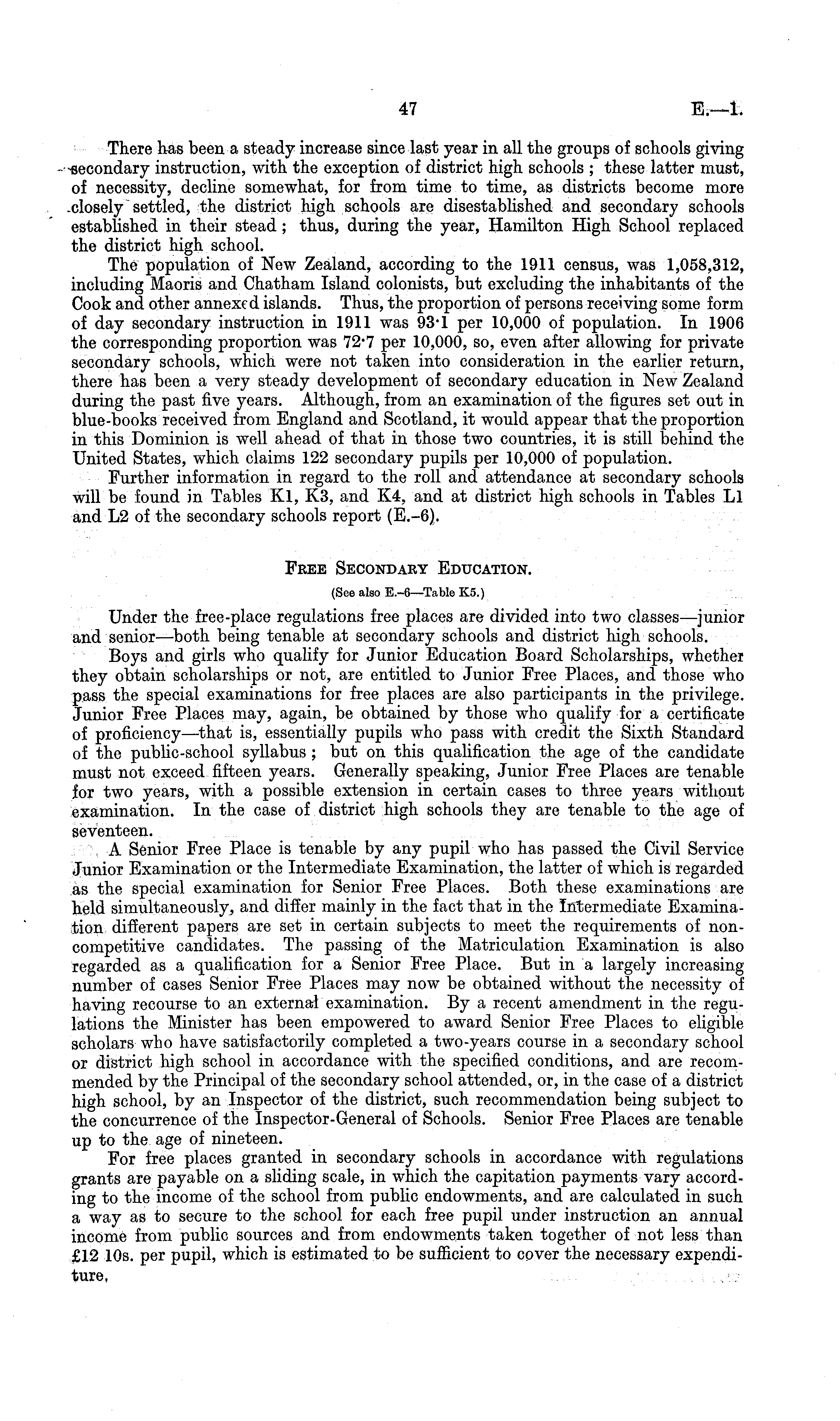 ! There has been a steady increase since last year in all the groups of schools giving -secondary instruction, with the exception of district high schools ; these latter must, of necessity, decline somewhat, for from time to time, as districts become more -closely settled, the district high schools are disestablished and secondary schools established in their stead; thus, during the year, Hamilton High School replaced the district high school. The population of New Zealand, according to the 1911 census, was 1,058,312, including Maoris and Chatham Island colonists, but excluding the inhabitants of the Cook and other annexed islands. Thus, the proportion of persons receiving some form of day secondary instruction in 1911 was 93-1 per 10,000 of population. In 1906 the corresponding proportion was 72 - 7 per 10,000, so, even after allowing for private secondary schools, which were not taken into consideration in the earlier return, there has been a very steady development of secondary education in New Zealand during the past five years. Although, from an examination of the figures set out in blue-books received from England and Scotland, it would appear that the proportion in this Dominion is well ahead of that in those two countries, it is still behind the United States, which claims 122 secondary pupils per 10,000 of population. Further information in regard to the roll and attendance at secondary schools will be found in Tables Xl, K3, and K4, and at district high schools in Tables Ll and L 2 of the secondary schools report (E.-6). Feee Secondary Education. (See also E.-6—Table K5.) Under the free-place regulations free places are divided into two classes—junior and senior—both being tenable at secondary schools and district high schools. Boys and girls who qualify for Junior Education Board Scholarships, whether they obtain scholarships or not, are entitled to Junior Free Places, and those who pass the special examinations for free places are also participants in the privilege. Junior Free Places may, again, be obtained by those who qualify for a certificate of proficiency —that is, essentially pupils who pass with credit the Sixth Standard of the public-school syllabus; but on this qualification the age of the candidate must not exceed fifteen years. Generally speaking, Junior Free Places are tenable for two years, with a possible extension in certain cases to three years without examination. In the case of district high schools they are tenable to the age of seventeen. A Senior Free Place is tenable by any pupil who has passed the Civil Service Junior Examination or the Intermediate Examination, the latter of which is regarded as the special examination for Senior Free Places. Both these examinations are held simultaneously, and differ mainly in the fact that in the Intermediate Examination different papers are set in certain subjects to meet the requirements of noncompetitive candidates. The passing of the Matriculation Examination is also regarded as a qualification for a Senior Free Place. But in a largely increasing number of cases Senior Free Places may now be obtained without the necessity of having recourse to an external examination. By a recent amendment in the regulations the Minister has been empowered to award Senior Free Places to eligible scholars who have satisfactorily completed a two-years course in a secondary school or district high school in accordance with the specified conditions, and are recommended by the Principal of the secondary school attended, or, in the case of a district high school, by an Inspector of the district, such recommendation being subject to the concurrence of the Inspector-General of Schools. Senior Free Places are tenable up to the age of nineteen. For free places granted in secondary schools in accordance with regulations grants are payable on a sliding scale, in which the capitation payments vary according to the income of the school from public endowments, and are calculated in such a way as to secure to the school for each free pupil under instruction an annual income from public sources and from endowments taken together of not less than £12 10s. per pupil, which is estimated to be sufficient to cover the necessary expenditure, . .