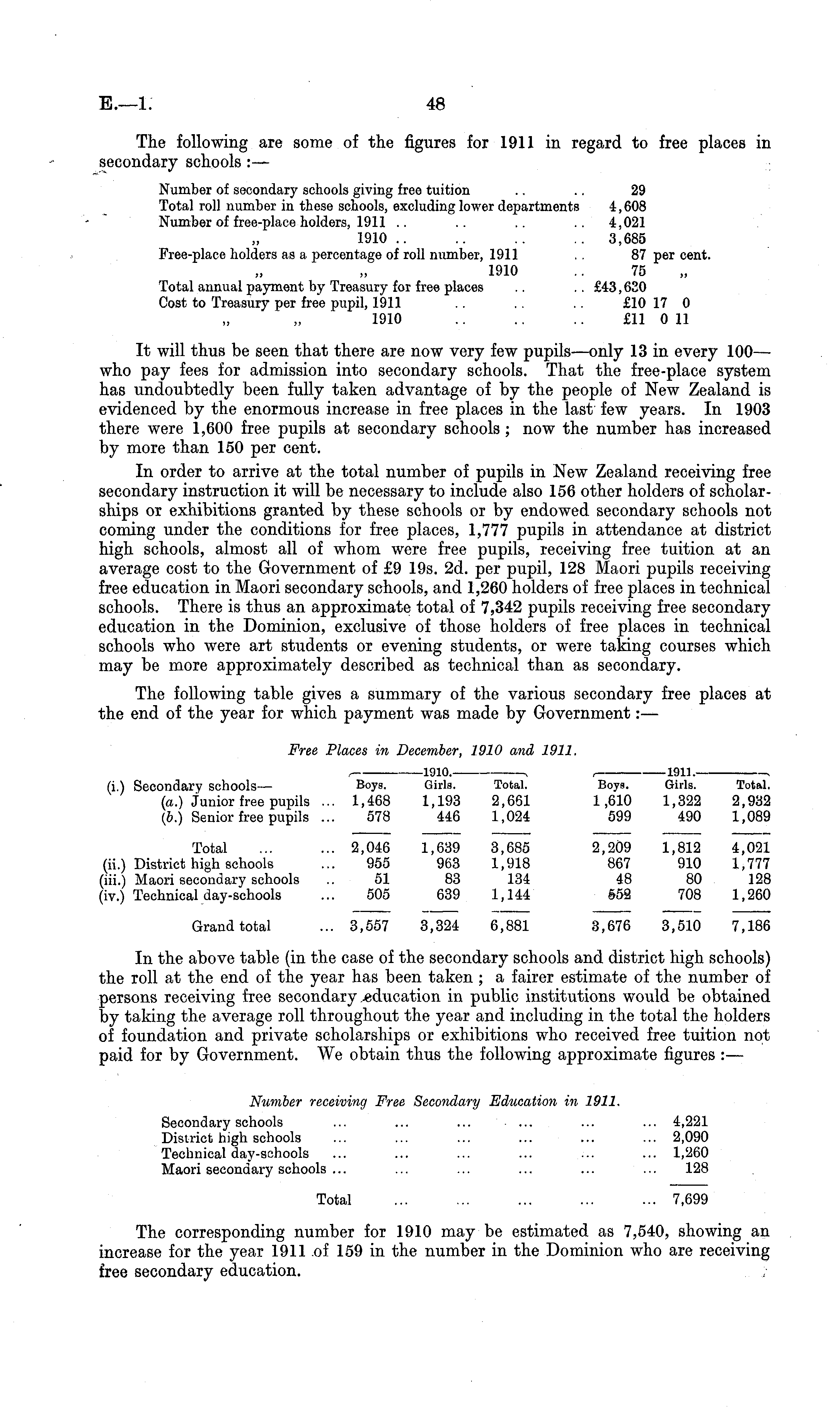 The following are some of the figures for 1911 in regard to free places in secondary schools :— Number of secondary schools giving free tuition .. .. 29 Total roll number in these schools, excluding lower departments 4,608 Number of free-place holders, 1911 .. .. .. .. 4,021 1910 .. .. .. .. 3,685 Free-place holders as a percentage of roll number, 1911 .. 87 per cent. 1910 .. 75 Total annual payment by Treasury for free places .. .. £43, 6SO Cost to Treasury per free pupil, 1911 .. .. .. £10 17 0 1910 .. .. .. £11 0 11 It will thus be seen that there are now very few pupils—only 13 in every 100 — who pay fees for admission into secondary schools. That the free-place system has undoubtedly been fully taken advantage of by the people of New Zealand is evidenced by the enormous increase in free places in the last few years. In 1903 there were 1,600 free pupils at secondary schools; now the number has increased by more than 150 per cent. In order to arrive at the total number of pupils in New Zealand receiving free secondary instruction it will be necessary to include also 156 other holders of scholarships or exhibitions granted by these schools or by endowed secondary schools not coming under the conditions for free places, 1,777 pupils in attendance at district high schools, almost all of whom were free pupils, receiving free tuition at an average cost to the Government of £9 19s. 2d. per pupil, 128 Maori pupils receiving free education in Maori secondary schools, and 1,260 holders of free places in technical schools. There is thus an approximate total of 7,342 pupils receiving free secondary education in the Dominion, exclusive of those holders of free places in technical schools who were art students or evening students, or were taking courses which may be more approximately described as technical than as secondary. The following table gives a summary of the various secondary free places at the end of the year for which payment was made by Government:— Free Places in December, 1910 and 1911. , 1910. , , 1911. , (i.) Secondary schools— Boys. Girls. Total. Boys. Girls. Total. (a.) junior free pupils ... 1,468 1,193 2,661 1,610 1,322 2,932 (b.) Senior free pupils ... 578 446 1,024 599 490 1,089 Total 2,046 1,639 3,685 2,209 1,812 4,021 (ii.) District high schools ... 955 963 1,918 867 910 1,777 (iii.) Maori secondary schools .. 51 83 134 48 80 128 (iv.) Technical day-schools ... 505 639 1,144 552 708 1,260 Grand total ... 3,557 3,324 6,881 3,676 3,510 7,186 In the above table (in the case of the secondary schools and district high schools) the roll at the end of the year has been taken; a fairer estimate of the number of persons receiving free secondary .education in public institutions would be obtained by taking the average roll throughout the year and including in the total the holders of foundation and private scholarships or exhibitions who received free tuition not paid for by Government. We obtain thus the following approximate figures :— Number receiving Free Secondary Education in 1911. Secondary schools ... ... ... ... ... ... 4,221 District high schools ... ... ... ... ... ... 2,090 Technical day-schools ... ... ... ... ... ... 1,260 Maori secondary schools ... ... ... ... ... ... 128 Total ... ... ... ... ... 7,699 The corresponding number for 1910 may be estimated as 7,540, showing an increase for the year 1911 of 159 in the number in the Dominion who are receiving free secondary education.