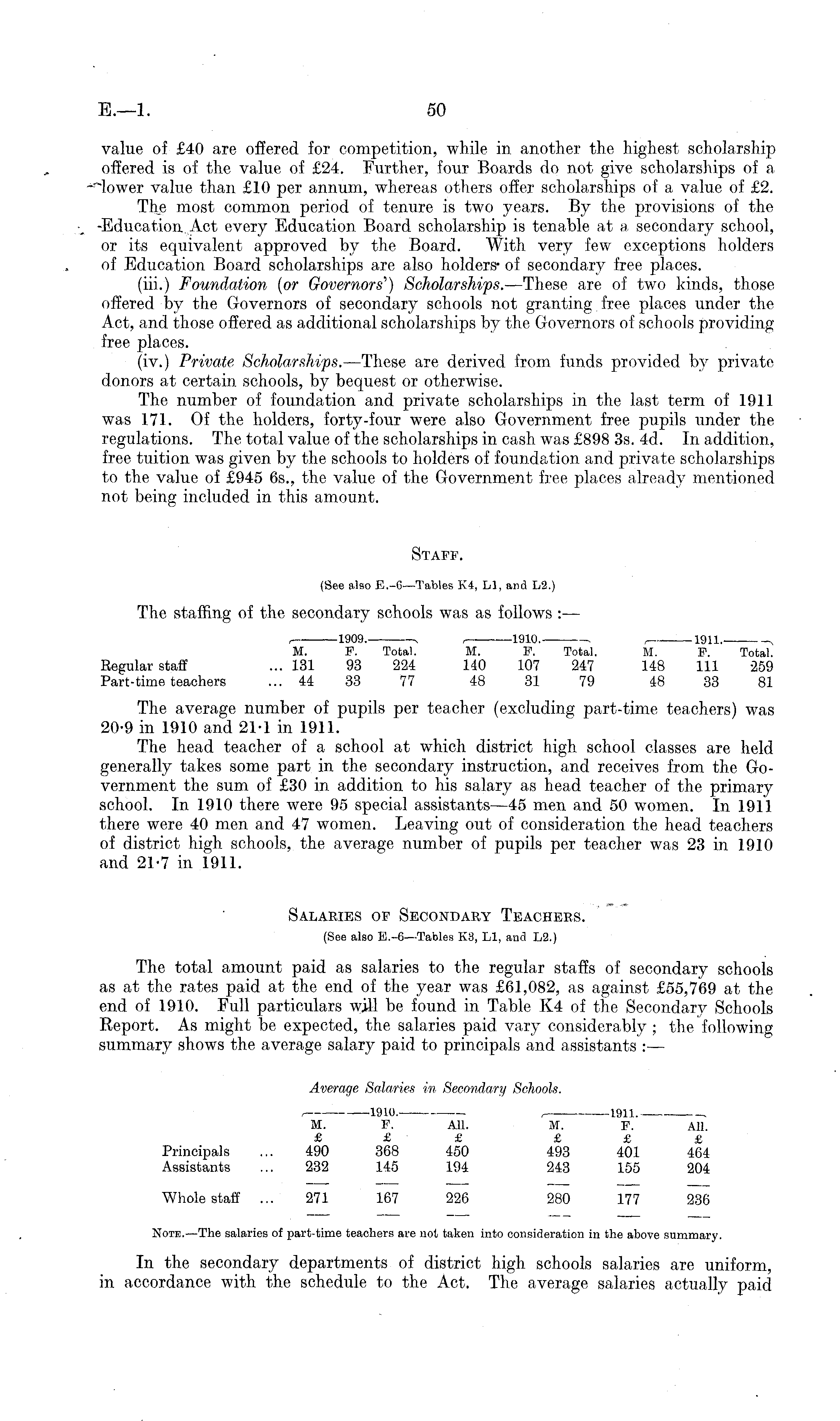 value of £40 are offered for competition, while in another the highest scholarship offered is of the value of £24. Further, four Boards do not give scholarships of a iower value than £10 per annum, whereas others offer scholarships of a value of £2. The most common period of tenure is two years. By the provisions of the Education Act every Education Board scholarship is tenable at a secondary school, or its equivalent approved by the Board. With very few exceptions holders of Education Board scholarships are also holders- of secondary free places. (iii.) Foundation (or Governors' , ) Scholarships. —These are of two kinds, those offered by the Governors of secondary schools not granting free places under the Act, and those offered as additional scholarships by the Governors of schools providing free places. (iv.) Private Scholarships. —These are derived from funds provided by private donors at certain schools, by bequest or otherwise. The number of foundation and private scholarships in the last term of 1911 was 171. Of the holders, forty-four were also Government free pupils under the regulations. The total value of the scholarships in cash was £898 3s. 4d. In addition, free tuition was given by the schools to holders of foundation and private scholarships to the value of £945 65., the value of the Government free places already mentioned not being included in this amount. Staff. (See also E.-6—Tables K4, LI, and L 2.) The staffing of the secondary schools w T as as follows :— , 1909. , , 1910. . , 1911. , M. F. Total. M. F. Total. M. F. Total. Regular staff ... 131 93 224 140 107 247 148 111 259 Part-time teachers ... 44 33 77 48 31 79 48 33 81 The average number of pupils per teacher (excluding part-time teachers) was 20-9 in 1910 and 21-1 in 1911. The head teacher of a school at which district high school classes are held generally takes some part in the secondary instruction, and receives from the Government the sum of £30 in addition to his salary as head teacher of the primary school. In 1910 there were 95 special assistants—4s men and 50 women. In 1911 there were 40 men and 47 women. Leaving out of consideration the head teachers of district high schools, the average number of pupils per teacher was 23 in 1910 and 21-7 in 1911. Salaries of Secondary Teachers. (See also E.-6—Tables K3, LI, and L 2.) The total amount paid as salaries to the regular staffs of secondary schools as at the rates paid at the end of the year was £61,082, as against £55,769 at the end of 1910. Full particulars will be found in Table K4 of the Secondary Schools Report. As might be expected, the salaries paid vary considerably ; the following summary shows the average salary paid to principals and assistants :— Average Salaries in Secondary Schools. , 1910. , 1911. . M. F. All. M. F. All. £ £ £ £ £ £ Principals ... 490 368 450 493 401 464 Assistants ... 232 145 194 243 155 204 Whole staff ... 271 167 226 280 177 236 Note.—The salaries of part-time teachers are not taken into consideration in the above summary. In the secondary departments of district high schools salaries are uniform, in accordance with the schedule to the Act. The average salaries actually paid