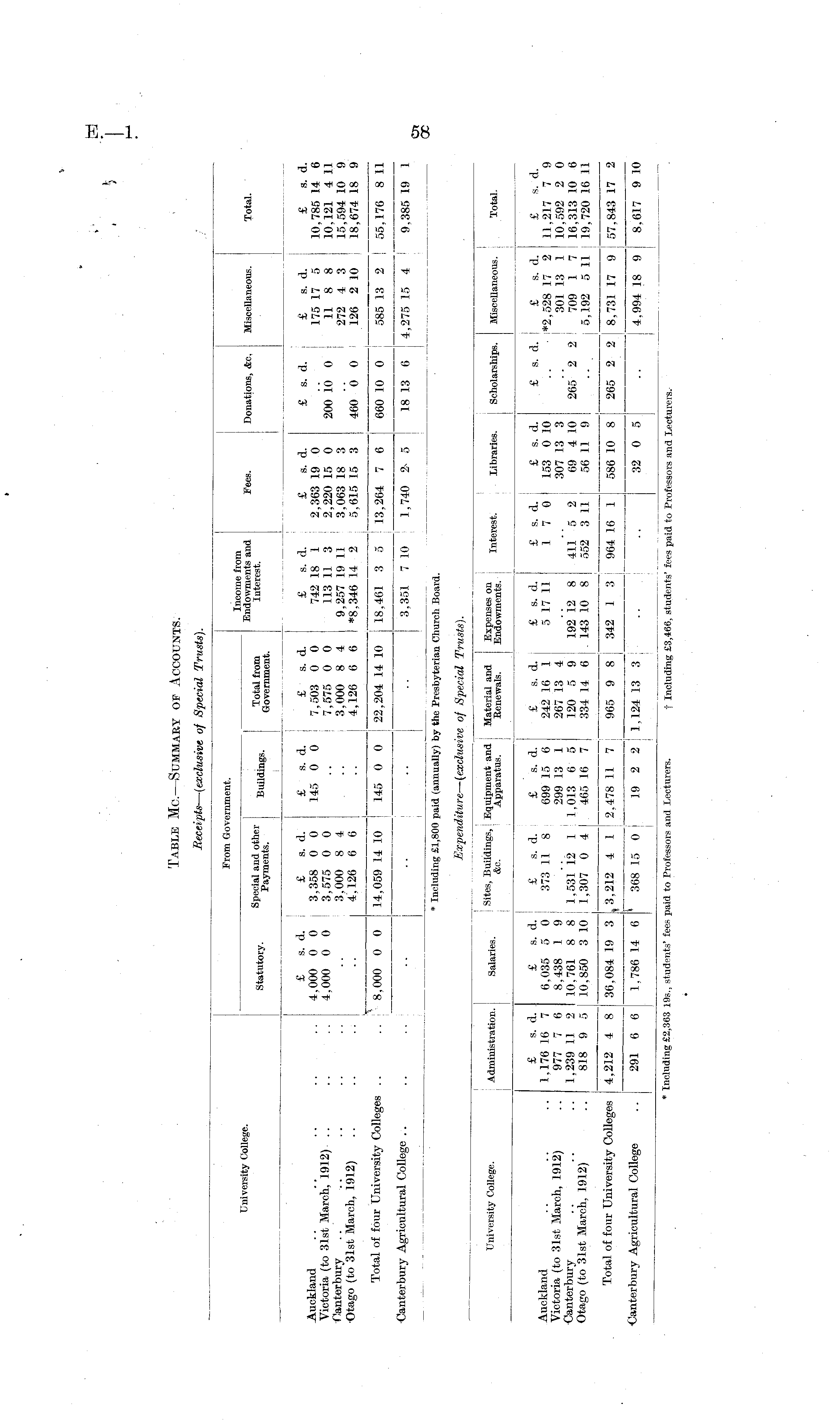 University College. Administration. Salaries. Sites, Buildings, \ Equipment and &c. Apparatus. Material and Expenses on Benewals. Endowments. Interest. libraries. Scholarships. Miscellaneous. \ Total. Auckland Victoria (to 31st March, 1912) Canterbury Otago (to 31st March, 1912) £ s. d. 1,176 16 7 977 7 6 1,239 11 2 818 9 5 £ s. d. £ s. d. ; £ s. d. 6,035 5 0 ! 373 11 8 699 15 6 8,438 19 .. 299 13 1 10,761 8 8 I 1,531 12 1 ! 1,013 6 5 10,850 3 10 ! 1,307 0 4 I 465 16 7 £ s. d. £ s. d. 242 16 1 5 17 11 267 13 4 I 120 5 9 I 192 12 8 334 14 6 I 143 10 8 £ s. d. 17 0 411 "5 2 552 3 11 £ s. d. 153 0 10 307 13 3 69 4 10 56 11 9 £ s. d. I £ s. d. i*2,528 17 2 301 13 1 265 2 2 709 1 7 i 5,192 5 11 £ s. d. 11,217 7 ( 10,592 2 ( 16,313 10 ( 19,720 16 i: a e i Total of four University Colleges 4,212 4 8 j j 36,084 19 3 j 3,212 4 1 ! 2,478 11 7 j 965 9 8 j 342 1 3 964 16 1 1,786 14 6 368 15 0 I 19 2 2 j 1,124 13 3 586 10 8 i 265 2 2 8,731 17 9 ! 57,843 17 I ] 4,994 18 9 ! 8,617 9 It •Canterbury Agricultural College I 291 6 6 I ] 32 0 5 • Including £2,363 19s., students' fees paid to Professors and lecturers. t Including £3,466, students' fees paid to Pr< ifessors and Xecti :rers.