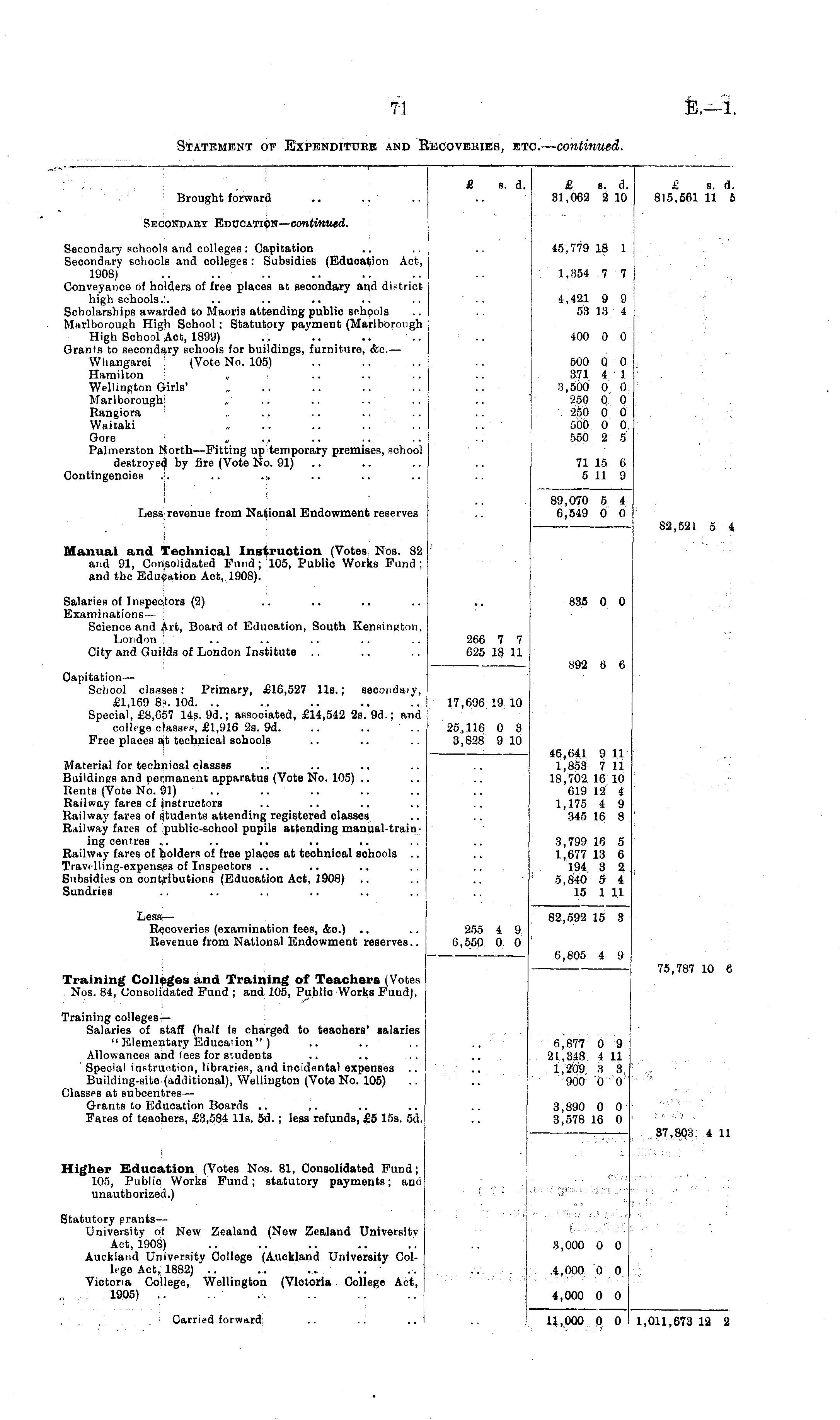 Brought forward £ «. d. £ e. d. 31,062 2 10 £ s. 815,561 11 Secondary Education — continued. Secondary schools and colleges : Capitation Secondary schools and colleges : Subsidies (Eduoation Act, 1908) Conveyance of holders of free places at secondary and district high schools.:. Scholarships awarded to Maoris attending public schools Marlborough High School : Statutory payment (Marlborough High School Act, 1899) Grants to secondary schools for buildings, furniture, &c. — Whangarei (Vote No. 105) Hamilton ■ Wellington Girls' Marlborough: „ .. .. .. Rangiora „ .. .. ••'■". Waicaki Gore „ Palmerston Morth—Fitting up temporary premises, school destroyed by fire (Vote No. 91) Contingencies .. .. .. 45,779 18 1 1,354 7 7 4,421 9 9 53 13 4 400 0 0 500 0 0 371 4 1 3,500 0 0 250 0 0 '250 0 0 500 0 0 550 2 5 71 15 6 5 11 9 Less: revenue from National Endowment reserves 89,070 5 4 6,549 0 0 82,521 5 4 Manual and Technical Instruction (Votes Nos. 82 and 91, Consolidated Fund;'105, Publio Works Fund; and the Education Act, 1908). Salaries of Inspectors (2) Examinations— ; Science and Art, Board of Education, South Kensington, London City and Guilds of London Institute 835 0 0 266 7 7 625 18 11 892 6 6 Capitation— School classes: Primary, £16,527 11s.; secondaiy, £1,169 8?. 10d. .. Special, £8,657 Us. 9d.; associated, £14,542 2s. 9d.; and college classes, £1,916 2s. 9d. .. .. Free places at technical schools 17,696 19 10 46,641 9 11 1,853 7 11 18,702 16 10 619 12 4 1,175 4 9 345 16 8 25,116 0 3 3,828 9 10 Material for technical classes Buiidines and permanent apparatus (Vote No. 105) Rents (Vote No. 91) Railway fares of instructors Railway fares of students attending registered classes Railway fares of public-school pupils attending manual-train-ing centres Railway fares of holders of free places at technical schools .. Travelling-expenses of Inspectors .. Subsidies on contributions (Education Act, 1908) Sundries 3,799 16 5 1,677 13 6 194 3 2 5,840 5 i 15 1 11 Less— Recoveries (examination fees, &c.) Revenue from National Endowment reserves.. 255 4 9 6,550 0 0 82,592 15 3 6,805 4 9 Training Colleges and Training of Teachers (Votes Nos. 84, Consolidated Fund ; and 105, Publio Works Fund). 75,787 10 6 Training collegesSalaries of staff (half is charged to teachers' salaries " Elementary Education ") Allowances and lees for students Special instruction, libraries, and incidental expenses .. Building-site (additional), Welliugton (Vote No. 105) Classes at subcentres— Grants to Education Boards .. Fares of teachers, £3,584 11s. 5d.; less refunds, £5 15s. 5d. 6,877 0 9 21,348 4 11 1,209 3 3 900 0 0 j 3,890 0 0 3,578 16 0 87,803 4 11 Higher Education (Votes Nos. 81, Consolidated Fund; 105, Public Works Fund; statutory payments; and unauthorized.) .-■ ■ ,: ■• . ' 'J. 'iijj / ■'; Statutory grantsUniversity of New Zealand (New Zealand University Act, 1908) Auckland University College (Auckland University College Act, 1882) .. .. ... ..- Victoria College, Wellington (Victoria College Act, „ : 1905) .. \ '■■ . "■ v i 3,000 0 0 .4,000 0 0 4,000 0 0 Carried forward. ,000 0 0 1,011,673 12 2