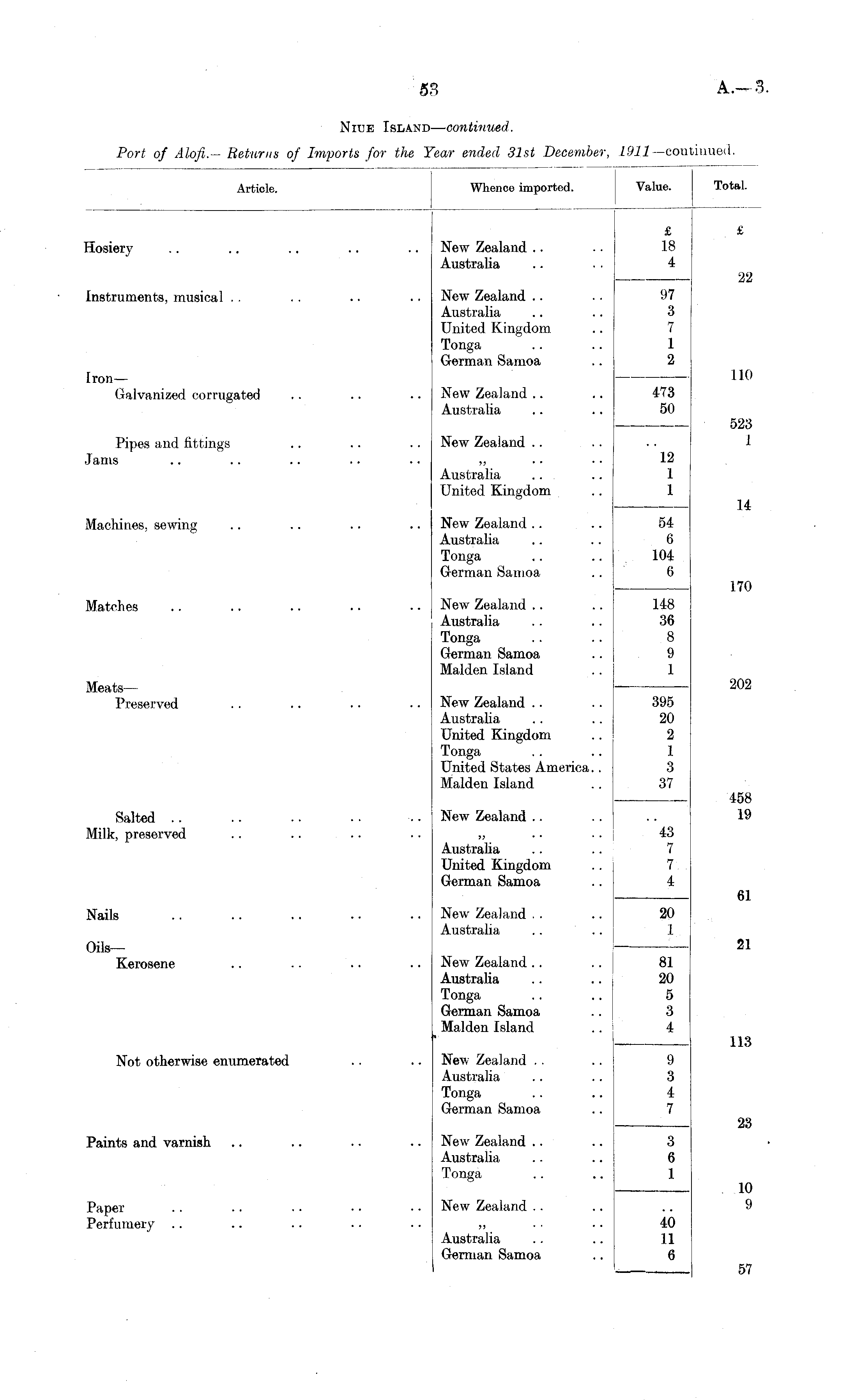 Article. Whence imported. Value. Total. £ 18 4 £ Hosiery New Zealand Australia 22 Instruments, musical New Zealand Australia United Kingdom Tonga German Samoa 97 3 7 1 2 Iron— 110 Galvanized corrugated New Zealand Australia 473 50 523 I Pipes and fittings New Zealand .. Jams Australia United Kingdom 12 1 1 Machines, sewing New Zealand Australia Tonga German Samoa 54 6 104 6 14 Matches New Zealand Australia Tonga German Samoa Maiden Island 170 148 36 8 9 1 202 Meats— Preserved New Zealand Australia United Kingdom Tonga United States America.. Maiden Island 395 20 2 1 3 37 Salted .. Milk, preserved 458 19 New Zealand .. Australia United Kingdom German Samoa 43 7 7 4 61 Nails New Zealand Australia 20 1 21 OilsKerosene New Zealand Australia Tonga German Samoa Maiden Island 81 20 5 3 4 113 Not otherwise enumerated New Zealand Australia Tonga German Samoa 9 3 4 7 Paints and varnish 23 New Zealand Australia Tonga 3 6 1 10 9 Paper Perfumery New Zealand .. ,, . . . . Australia German Samoa 40 11 6 57