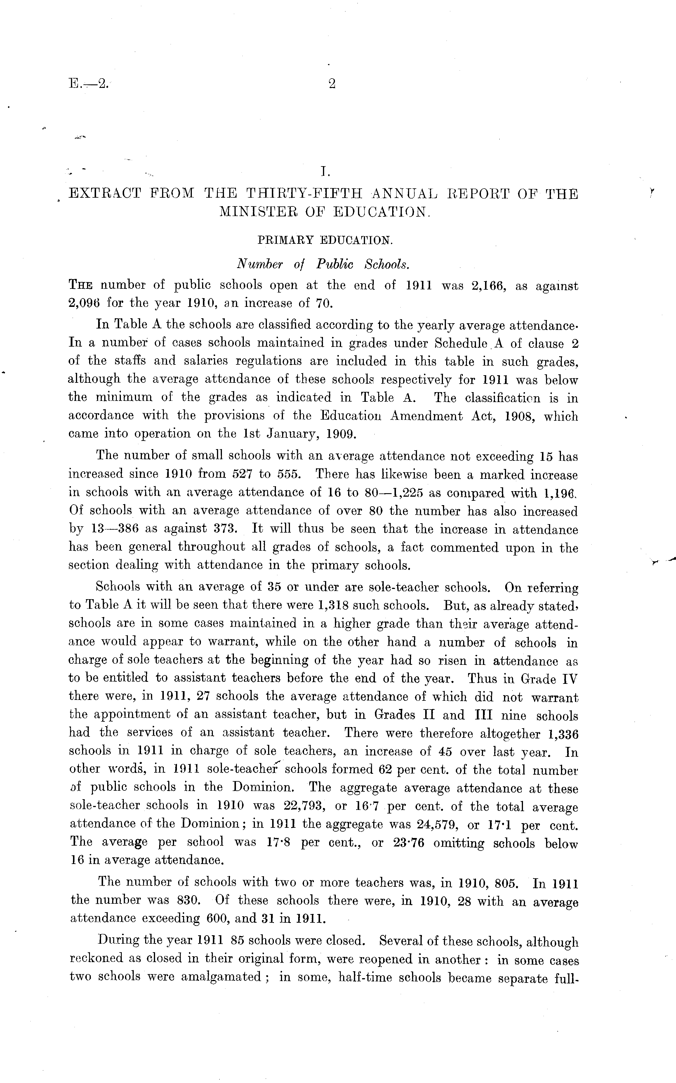 - - I. EXTRACT PROM THE THIRTY-FIETH ANNUAL REPORT OF THE MINISTER OF EDUCATION. PRIMARY EDUCATION. Number of Public Schools. The number of public schools open at the end of 1911 was 2,166, as against 2,096 for the year 1910, an increase of 70. In Table A the schools are classified according to the yearly average attendanceIn a number of cases schools maintained in grades under Schedule A of clause 2 of the staffs and salaries regulations are included in this table in such grades, although the average attendance of these schools respectively for 1911 was below the minimum of the grades as indicated in Table A. The classification is in accordance with the provisions of the Education Amendment Act, 1908, which came into operation on the Ist January, 1909. The number of small schools with an average attendance not exceeding 15 has increased since 1910 from 527 to 555. There has likewise been a marked increase in schools with an average attendance of 16 to 80 —1,225 as compared with 1,196. Of schools with an average attendance of over 80 the number has also increased by 13 —386 as against 373. It will thus be seen that the increase in attendance has been general throughout all grades of schools, a fact commented upon in the section dealing with attendance in the primary schools. Schools with an average of 35 or under are sole-teacher schools. On referring to Table Ait will be seen that there were 1,318 such schools. But, as already stated* schools are in some cases maintained in a higher grade than their average attendance would appear to warrant, while on the other hand a number of schools in charge of sole teachers at the beginning of the year had so risen in attendance as to be entitled to assistant teachers before the end of the year. Thus in Grade IV there were, in 1911, 27 schools the average attendance of which did not warrant the appointment of an assistant teacher, but in Grades II and 111 nine schools had the services of an assistant teacher. There were therefore altogether 1,336 schools in 1911 in charge of sole teachers, an increase of 45 over last year. In other words, in 1911 sole-teacher schools formed 62 per cent, of the total number of public schools in the Dominion. The aggregate average attendance at these sole-teacher schools in 1910 was 22,793, or 16 7 per cent, of the total average attendance of the Dominion; in 1911 the aggregate was 24,579, or 17*1 per cent. The average per school was 17-8 per cent., or 23-76 omitting schools below 16 in average attendance. The number of schools with two or more teachers was, in 1910, 805. In 1911 the number was 830. Of these schools there were, in 1910, 28 with an average attendance exceeding 600, and 31 in 1911. During the year 1911 85 schools were closed. Several of these schools, although reckoned as closed in their original form, were reopened in another : in some cases two schools were amalgamated ; in some, half-time schools became separate full-