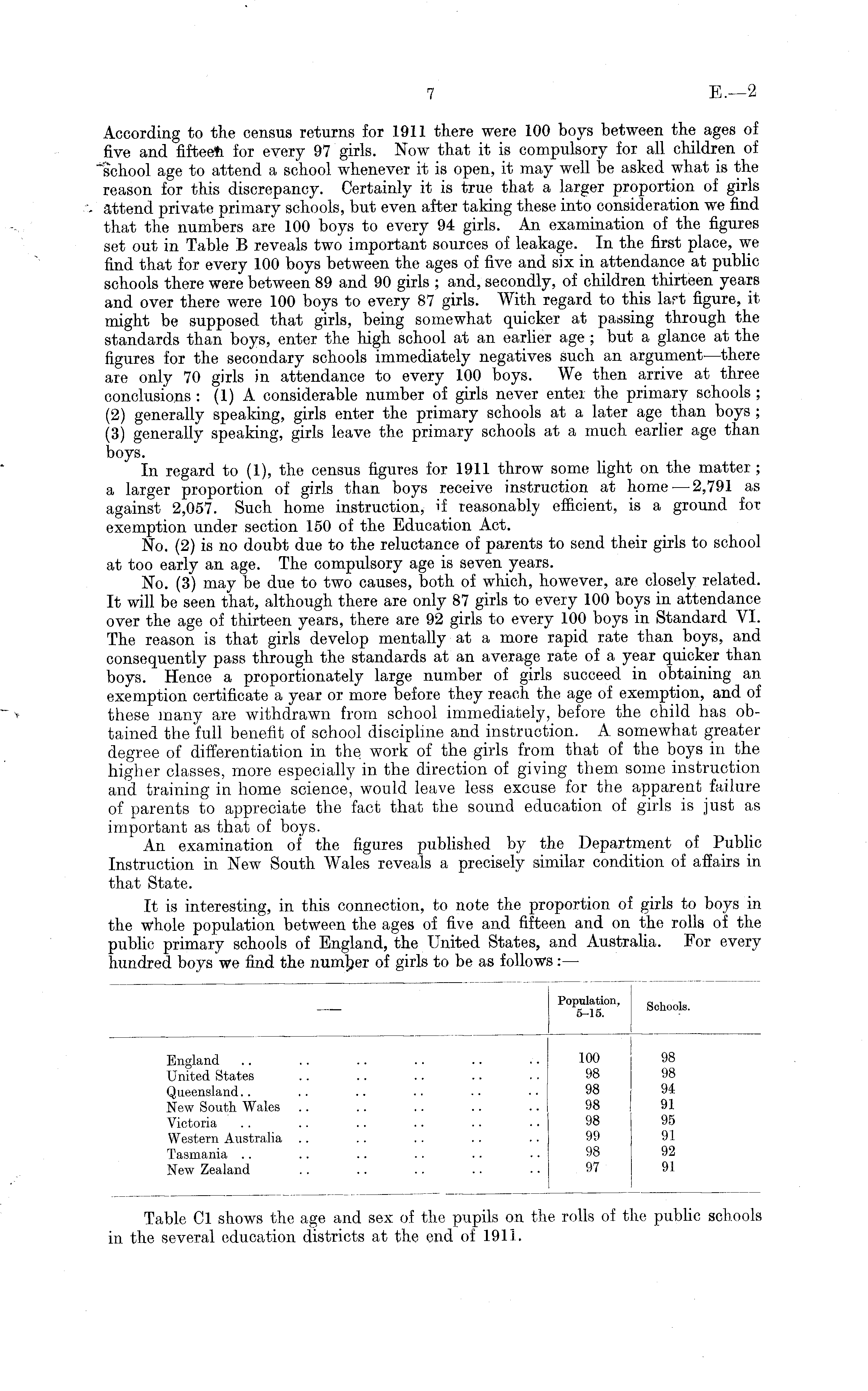 According to the census returns for 1911 there were 100 boys between the ages of five and fifteen for every 97 girls. Now that it is compulsory for all children of school age to attend a school whenever it is open, it may well be asked what is the reason for this discrepancy. Certainly it is true that a larger proportion of girls attend private primary schools, but even after taking these into consideration we find that the numbers are 100 boys to every 94 girls. An examination of the figures set out in Table B reveals two important sources of leakage. In the first place, we find that for every 100 boys between the ages of five and six in attendance at public schools there were between 89 and 90 girls ; and, secondly, of children thirteen years and over there were 100 boys to every 87 girls. With regard to this lart figure, it might be supposed that girls, being somewhat quicker at passing through the standards than boys, enter the high school at an earlier age ; but a glance at the figures for the secondary schools immediately negatives such an argument —there are only 70 girls in attendance to every 100 boys. We then arrive at three conclusions : (1) A considerable number of girls never enter the primary schools ; (2) generally speaking, girls enter the primary schools at a later age than boys; (3) generally speaking, girls leave the primary schools at a much earlier age than boys. In regard to (1), the census figures for 1911 throw some light on the matter ; a larger proportion of girls than boys receive instruction at home — 2,791 as against 2,057. Such home instruction, if reasonably efficient, is a ground for exemption under section 150 of the Education Act. No. (2) is no doubt due to the reluctance of parents to send their girls to school at too early an age. The compulsory age is seven years. No. (3) may be due to two causes, both of which, however, are closely related. It will be seen that, although there are only 87 girls to every 100 boys in attendance over the age of thirteen years, there are 92 girls to every 100 boys in Standard VI. The reason is that girls develop mentally at a more rapid rate than boys, and consequently pass through the standards at an average rate of a year quicker than boys. Hence a proportionately large number of girls succeed in obtaining an exemption certificate a year or more before they reach the age of exemption, and of these many are withdrawn from school immediately, before the child has obtained the full benefit of school discipline and instruction. A somewhat greaterdegree of differentiation in the work of the girls from that of the boys in the higher classes, more especially in the direction of giving them some instruction and training in home science, would leave less excuse for the apparent failure of parents to appreciate the fact that the sound education of girls is just as important as that of boys. An examination of the figures published by the Department of Public Instruction in New South Wales reveals a precisely similar condition of affairs in that State. It is interesting, in this connection, to note the proportion of girls to boys in the whole population between the ages of five and fifteen and on the rolls of the public primary schools of England, the United States, and Australia. For every hundred boys we find the number of girls to be as follows: —