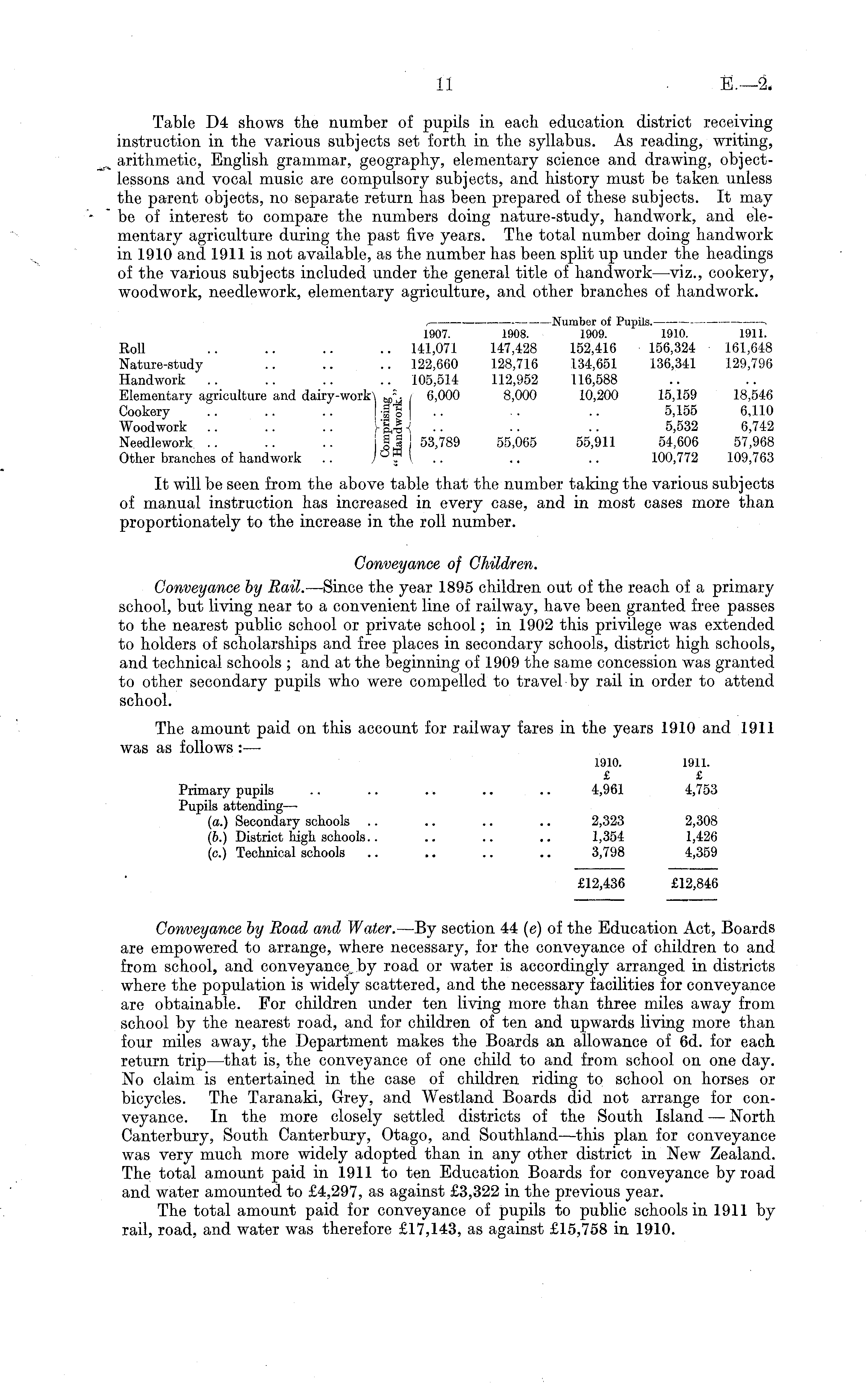 Table D 4 shows the number of pupils in each education district receiving instruction in the various subjects set forth in the syllabus. As reading, writing, arithmetic, English grammar, geography, elementary science and drawing, objectlessons and vocal music are compulsory subjects, and history must be taken unless the parent objects, no separate return has been prepared of these subjects. It may be of interest to compare the numbers doing nature-study, handwork, and elementary agriculture during the past five years. The total number doing handwork in 1910 and 1911 is not available, as the number has been split up under the headings of the various subjects included under the general title of handwork—viz., cookery, woodwork, needlework, elementary agriculture, and other branches of handwork. , Number of Pupils. . 1907. 1908. 1909. 1910. 1911. Roll .. .. .. .. 141,071 147,428 152,416 156,324 161,648 Nature-study .. .. .. 122,660 128,716 134,651 136,341 129,796 Handwork .. .. .. .. 105,514 112,952 116,588 Elementary agriculture and dairy-work\ / 6,000 8,000 10,200 15,159 18,546 Cookery |-|| .. .. .. 5,155 6,110 Woodwork V&%4 .. .. .. 5,532 6,742 Needlework .. .. .. i| 1 53,789 55,065 55,911 54,606 57,968 Other branches of handwork .. J 3 ? I .. .. .. 100,772 109,763 It will be seen from the above table that the number taking the various subjects of manual instruction has increased in every case, and in most cases more than proportionately to the increase in the roll number. Conveyance of Children. Conveyance by Rail. —Since the year 1895 children out of the reach of a primary school, but living near to a convenient line of railway, have been granted free passes to the nearest public school or private school; in 1902 this privilege was extended to holders of scholarships and free places in secondary schools, district high schools, and technical schools ; and at the beginning of 1909 the same concession was granted to other secondary pupils who were compelled to travel by rail in order to attend school. The amount paid on this account for railway fares in the years 1910 and 1911 was as follows : — 1910. 1911. £ £ Primary pupils .. .. .. .. .. 4,961 4,753 Pupils attending — (a.) Secondary schools .. .. .. .. 2,323 2,308 (b.) District high schools.. .. .. .. 1,354 1,426 (c.) Technical schools .. .. .. .. 3,798 4,359 £12,436 £12,846 Conveyance by Road and Water. —By section 44 (c) of the Education Act, Boards are empowered to arrange, where necessary, for the conveyance of children to and from school, and conveyance by road or water is accordingly arranged in districts where the population is widely scattered, and the necessary facilities for conveyance are obtainable. Eor children under ten living more than three miles away from school by the nearest road, and for children of ten and upwards living more than four miles away, the Department makes the Boards an allowance of 6d. for each return trip —that is, the conveyance of one child to and from school on one day. No claim is entertained in the case of children riding to school on horses or bicycles. The Taranaki, Grey, and Westland Boards did not arrange for conveyance. In the more closely settled districts of the South Island — North Canterbury, South Canterbury, Otago, and Southland-—this plan for conveyance was very much more widely adopted than in any other district in New Zealand. The total amount paid in 1911 to ten Education Boards for conveyance byroad and water amounted, to £4,297, as against £3,322 in the previous year. The total amount paid for conveyance of pupils to public schools in 1911 by rail, road, and water was therefore £17,143, as against £15,758 in 1910.