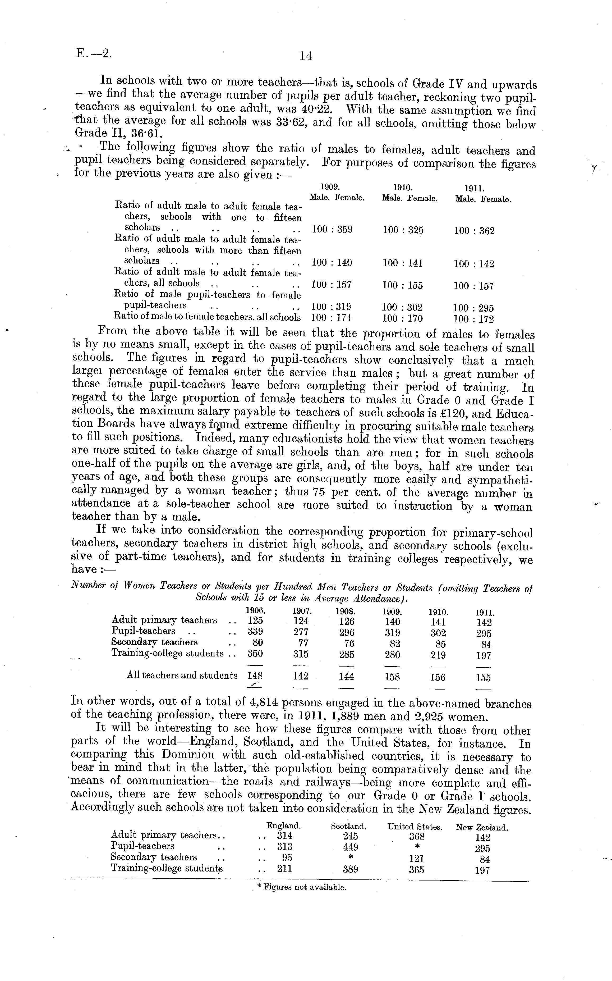 In schools with two or more teachers—that is, schools of Grade IV and upwards —we find that the average number of pupils per adult teacher, reckoning two pupilteachers as equivalent to one adult, was 40-22. With the same assumption we find that the average for all schools was 33-62, and for all schools, omitting those below Grade 11, 36-61. - The following figures show the ratio of males to females, adult teachers and pupil teachers being considered separately. For purposes of comparison the figures for the previous years are also given : — 1909. 1910. 1911. . Male. Female. Male. Eemale. Male. Female. Katio of adult male to adult female teachers, schools with one to fifteen scholars 100 : 359 100 : 325 100 : 362 Eatio of adult male to adult female teachers, schools with more than fifteen scholars .. .. .. .. 100 : 140 100 : 141 100 : 142 Ratio of adult male to adult female teachers, all schools .. .. .. 100 : 157 100 : 155 100 : 157 Ratio of male pupil-teachers to female pupil-teachers .. .. .. 100 : 319 100 : 302 100 : 295 Ratio of male to female teachers, all schools 100:174 100:170 100:172 From the above table it will be seen that the proportion of males to females is by no means small, except in the cases of pupil-teachers and sole teachers of small schools. The figures in regard to pupil-teachers show conclusively that a much largei percentage of females enter the service than males ; but a great number of these female pupil-teachers leave before completing their period of training. In regard to the large proportion of female teachers to males in Grade 0 and Grade I schools, the maximum salary payable to teachers of such schools is £120, and Education Boards have always fo.und extreme difficulty in procuring suitable male teachers to fill such positions. Indeed, many educationists hold the view that women teachers are more suited to take charge of small schools than are men; for in such schools one-half of the pupils on the average are girls, and, of the boys, half are under ten years of age, and both these groups are consequently more easily and sympathetically managed by a woman teacher; thus 75 per cent, of the average number in attendance at a sole-teacher school are more suited to instruction by a woman teacher than by a male. If we take into consideration the corresponding proportion for primary-school teachers, secondary teachers in district high schools, and secondary schools (exclusive of part-time teachers), and for students in training colleges respectively, we have :— Number of Women Teachers or Students per Hundred Men Teachers or Students (omitting Teachers of Schools with 15 or less in Average Attendance). 1906. 1907. 1908. 1909. 1910. 1911. Adult primary teachers .. 125 124 126 140 141 142 Pupil-teachers .. ..339 277 296 319 302 295 Secondary teachers 80 77 76 82 85 84 Training-college students .. 350 315 285 280 219 197 All teachers and students 148 142 144 158 156 155 In other words, out of a total of 4,814 persons engaged in the above-named branches of the teaching profession, there were, in 1911, 1,889 men and 2,925 women. It will be interesting to see how these figures compare with those from othei parts of the world—England, Scotland, and the United States, for instance. In comparing this Dominion with such old-established countries, it is necessary to bear in mind that in the latter, the population being comparatively dense and the means of communication—the roads and railways—being more complete and efficacious, there are few schools corresponding to our Grade 0 or Grade I schools. Accordingly such schools are not taken into consideration in the New Zealand figures. England. Scotland. United States. New Zealand. Adult primary teachers.. .. 314 245 368 142 Pupil-teachers .. .. 313 449 * 295 Secondary teachers .. 95 * 121 84 Training-college students .. 211 389 365 197
