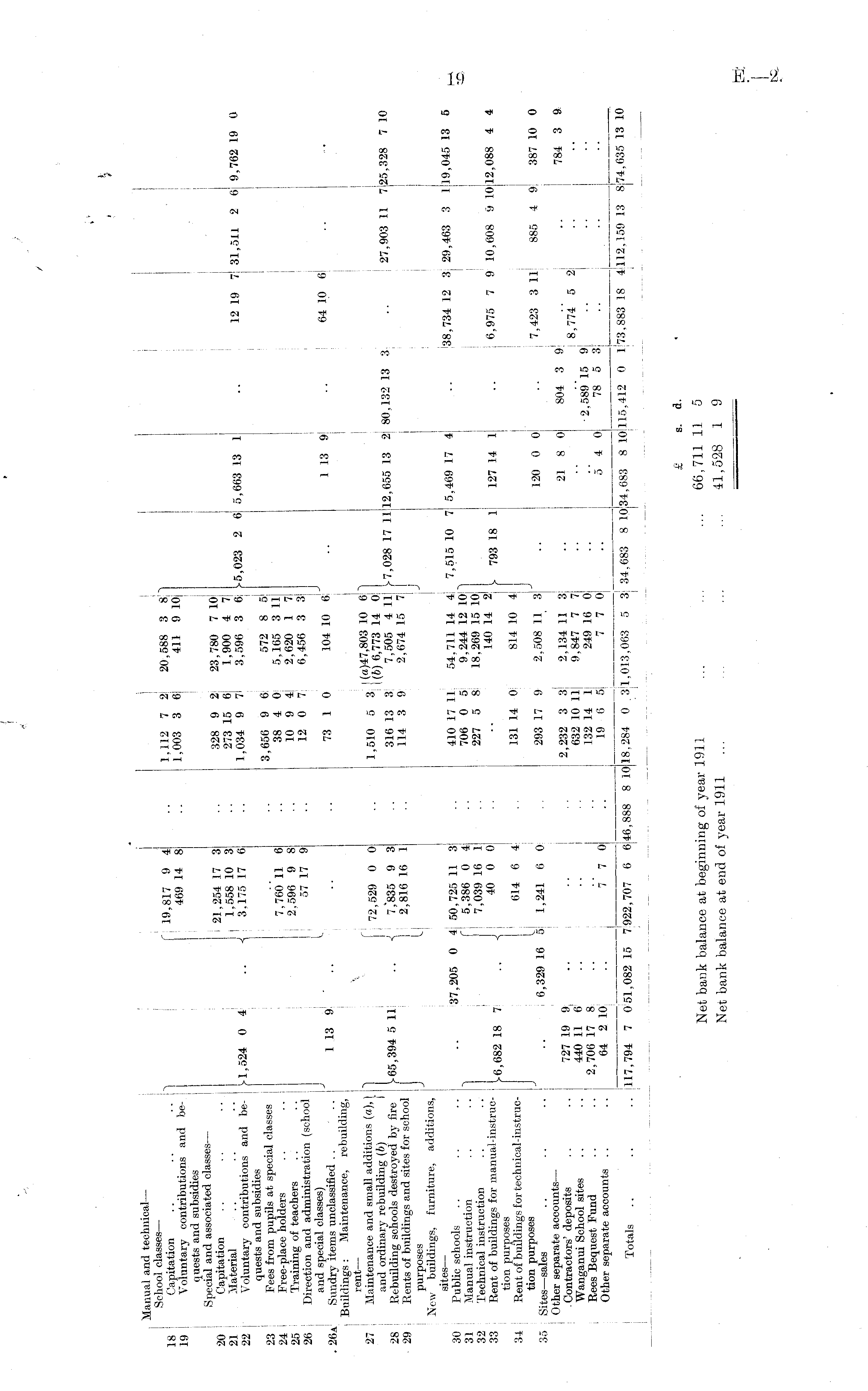 } , Manual and technical — School classes— A 18 ! Capitation H f 19,81/ 9 4 19 S Voluntary contributions and be- j [ 4b9 14 s quests and subsidies Special and associated classes — 20 ■ 'Capitation .. .. •• I : ' 21,254 17 3 21 I . Material I I] l>558 10 3 22 j Voluntary contributions and be- ! |>1,524 0 4 .. •< 3,175 17 6 quests and subsidies 23 ! Fees from pupils at special classes ! 24 i Free-placeholders .. .. 7,760 11 6 25 ' Training of teachers .. .. ' 5^ 6 " 8 26 I Direction and administration (school j | 57 17 9 and special classes) J . L 26a ! Sundry items unclassified . . ' .. 1 13 9 i Building's: Maintenance, rebuilding, | rent — | 27 [ Maintenance and small additions (a), \ j~) I r-2 529 0 0 and ordinary rebuilding (b) ill I ', 28 ! Rebuilding schools destroyed by fire I )>65,394 5 11 .. < j 7,835 9 3 29 i Rents of buildings and sites for school [ | 2,816 16 1 purposes J 1 1 New buildings, furniture, additions, sites — 30 : Public schools j .. 37,205 0 4; 50,725 11 3 31 Manual instruction .. .. jl f; 5,386 0 4j 32 Technical instruction .. .. ! j | : 7,039 16 1 33 Rent of buildings for manual-instruc- ; I g g g2 18 7 J 40 0 0| tion purposes 34 Rent of buildings for technical-instruc- j 614 6 4 tion purposes J U 35 Sites-sales ' •• 6,329 16 5 1,241 6 0 : Other separate accounts — . Contractors' deposits .. .. 727 19 9, Wanganui School sites .. .. 440 11 6 .. .. .. Rees Bequest Fund .. .. 2,706 17 8 .. . ■ \ Other separate accounts .. .. 64 2 10 .. ■ 7 7 0 1 : j I Totals .. .. .. |117,794 7 0 51,082 15 7922,707 6 6J46,888 8 l< 1,112 7 2 20,588 3 8:"j 1,003 3 6 411 9 10| I I I 328 9 2 23,780 7 10j | 1,034 X 9 7 I'S 3 frV5,023 2 6 5,663 13 1 •- 12 19 7 31,511 2 6 9,762 19 0 3,656 9 6: 572 8 5 38 4 0: 5,165 3 111 10 9 4 2,620 1 7| [ 12 0 7 6,456 3 3 | 73 1 0 104 10 6 .. 1 13 91 .. 64 10 6 |(a)47,803 10 6p) 316 13 3 7'605 4 17 1112,655 13 2j 80,132 13 3 .. 27,903 11 7j25,328 7 10 114 3 9 2'674 15 7 | J 410 17 11 54,71114 4 7,515 10 7 5,469 17 4 .. '38,734 12 3 29,463 3 119,045 13 5 706 0 5 12 10! 227 5 8 18,269 15 10j j 140 14 2 I 793 18 L 127 14 j ,. 6,975 7 9 10,608 9 1012,088 4 4 i I ! 131 14 0 814 10 4 293 17 9 2,508 11 3 .. | 120 0 o| .. 7,423 3 11 885 4 9 387 10 0 2,232 3 3; 2,134 11 3 .. 21 8 0 804 3 9! .. \ .. 784 3 9 632 10 111 9,847 7 71 .. •• •• 8,774 5 2 132 14 1 249 16 0 .. .. 2,589 15 9 19 6 5 7 7 0 .. 5 4 0 78 5 3; 1187284~"0~lilT01^063"5 r "3 r 34T68rTl0 8 101115,412 0 173,883 18 4112,159 13 874,635 13 10 ■ II i ' 5,663 13 1 k s. d. Net bank balance at beginning of year Net bank balance at end of year 1911 1911 ... ... ... 66,711 11 5 41,528 1 9