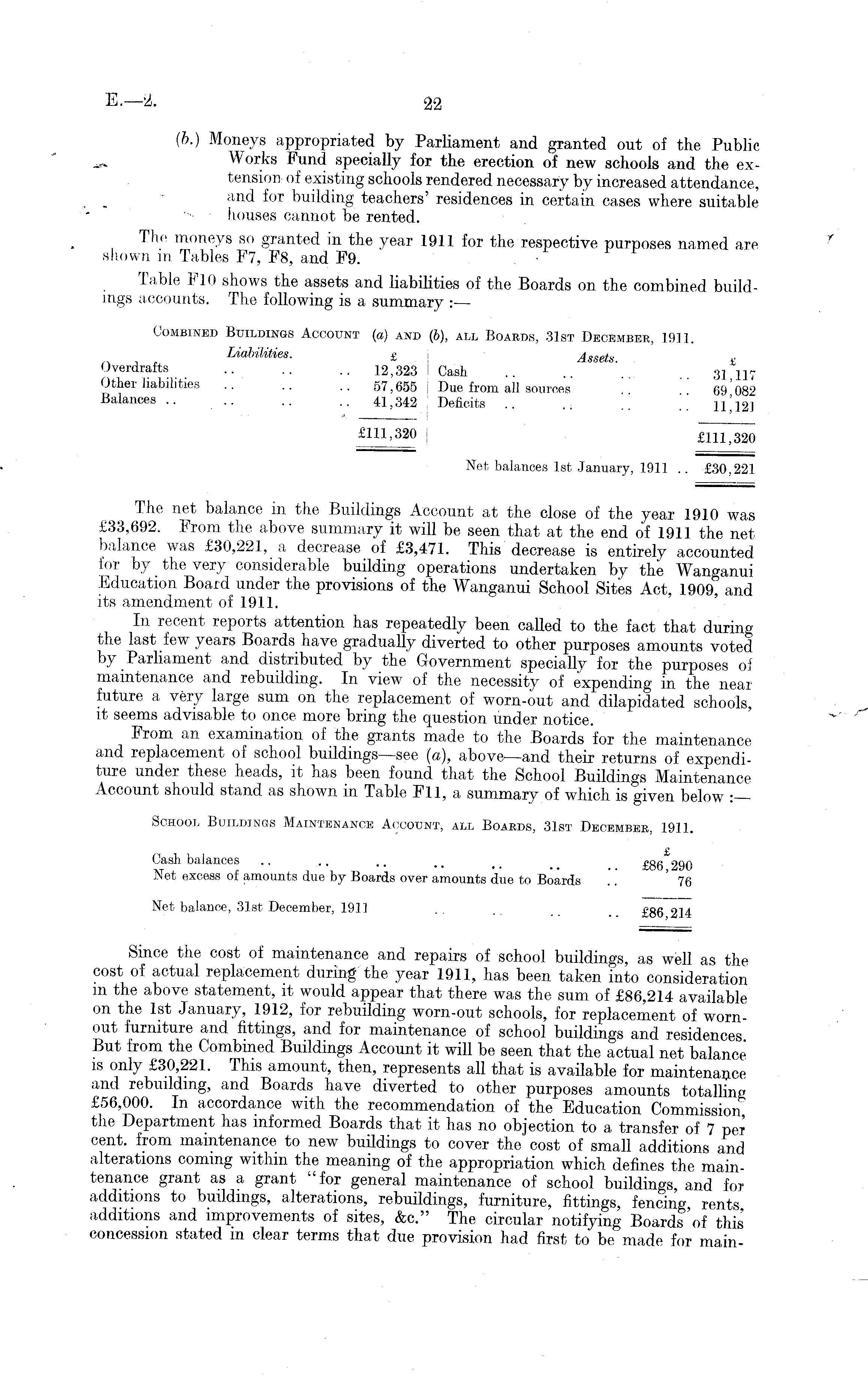 (b.) Moneys appropriated by Parliament and granted out of the Public Works Fund specially for the erection of new schools and the extension of existing schools rendered necessary by increased attendance, and for building teachers' residences in certain cases where suitable houses cannot be rented. The moneys so granted in the year 1911 for the respective purposes named are shown in Tables F7, FB, and F9. . ■ Table FlO shows the assets and liabilities of the Boards on the combined buildings accounts. The following is a summary :— Combined Buildings Account (a) and (b), all Boards, 31st December, 1911. Liabilities. £ Assets Overdrafts .. .. .. 12,323 Cash .. 3] 117 Other liabilities .. .. .. 57,655 Due from all sources 6 9082 Balances .. .. .. .. 41,342 Deficits .. ~ .. \\\\2l £111,320 Oujm Net balances Ist January, 1911 .. £30,221 The net balance in the Buildings Account at the close of the year 1910 was £33,692. From the above summary it will be seen that at the end of 1911 the net balance was £30,221, a decrease of £3,471. This decrease is entirely accounted for by the very considerable building operations undertaken by the Wanganui Education Board under the provisions of the Wanganui School Sites Act, 1909, and its amendment of 1911. In recent reports attention has repeatedly been called to the fact that during the last few years Boards have gradually diverted to other purposes amounts voted by Parliament and distributed by the Government specially for the purposes oi maintenance and rebuilding. In view of the necessity of expending in the near future a very large sum on the replacement of worn-out and dilapidated schools, it seems advisable to once more bring the question under notice. From an examination of the grants made to the Boards for the maintenance and replacement of school buildings—see (a), above—and their returns of expenditure under these heads, it has been found that the School Buildings Maintenance Account should stand as shown in Table Fll, a summary of which is given below :— School Buildings Maintenance Account, all Boards, 31st December, 1911. Cash balances .. ~ .. _ # »j. oqo Net excess of amounts due by Boards over amounts due to Boards .'.' '76 Net balance, 31st December, 1911 . . .. £gg 2 14 Since the cost of maintenance and repairs of school buildings, as well as the cost of actual replacement during the year 1911, has been taken into consideration m the above statement, it would appear that there was the sum of £86,214 available on the Ist January, 1912, for rebuilding worn-out schools, for replacement of wornout furniture and fittings, and for maintenance of school buildings and residences But from the Combined Buildings Account it will be seen that the actual net balance is only £30,221. This amount, then, represents all that is available for maintenance and rebuilding, and Boards have diverted to other purposes amounts totalling £56,000. In accordance with the recommendation of the Education Commission" the Department has informed Boards that it has no objection to a transfer of 7 per cent, from maintenance to new buildings to cover the cost of small additions and alterations coming withm the meaning of the appropriation which defines the maintenance grant as a grant "for general maintenance of school buildings, and for additions to buildings, alterations, rebuildings, furniture, fittings, fencing rents additions and improvements of sites, &c." The circular notifying Boards'of this concession stated m clear terms that due provision had first to be made for main-