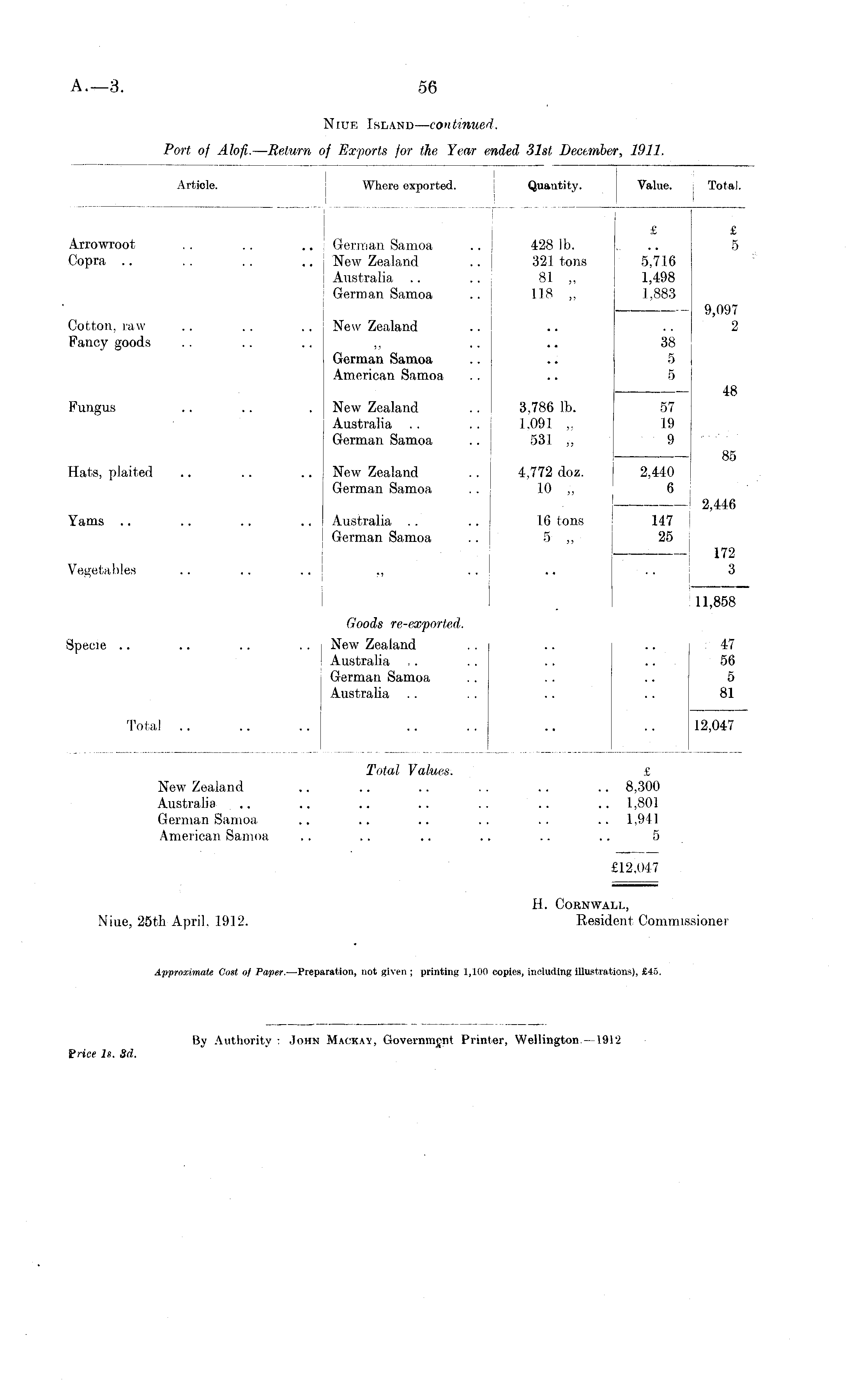 Total Values. £ New Zealand .. .. .. .. .. .. 8,300 Australia .. .. .. .. .. .. .. 1,801 German Samoa .. .. .. .. .. ..1.941 American Samoa .. .. .. . . .. . . 5 £12,047 H. Cornwall, Niue, 25th April. 1912. Resident Commissioner Approximate Cost of Paper. —Preparation, not given ; printing 1,100 copies, including illustrations), £45.