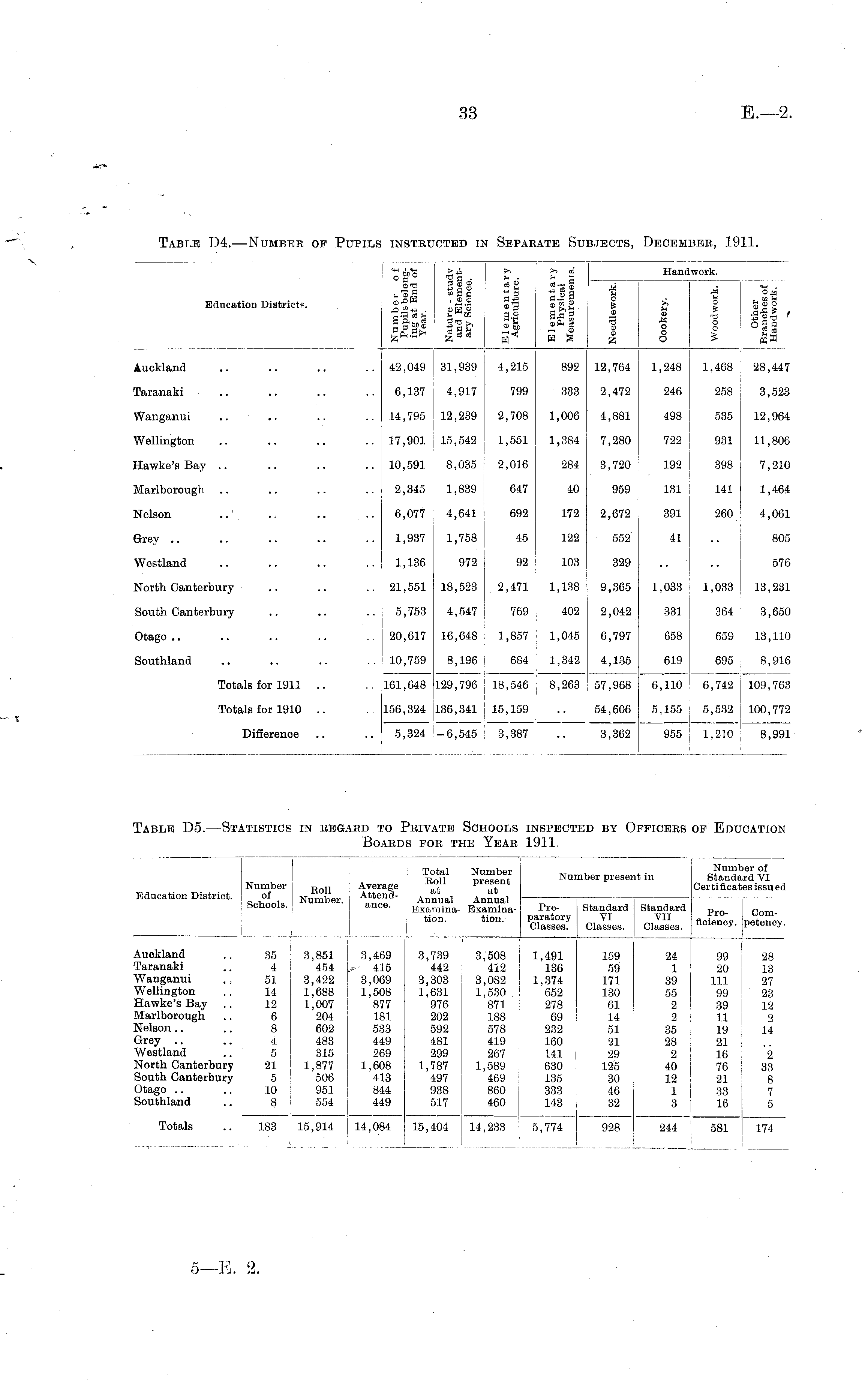 Table D5.—Statistics in regard to Private Schools inspected by Officers of Education Boards for the Year 1911.