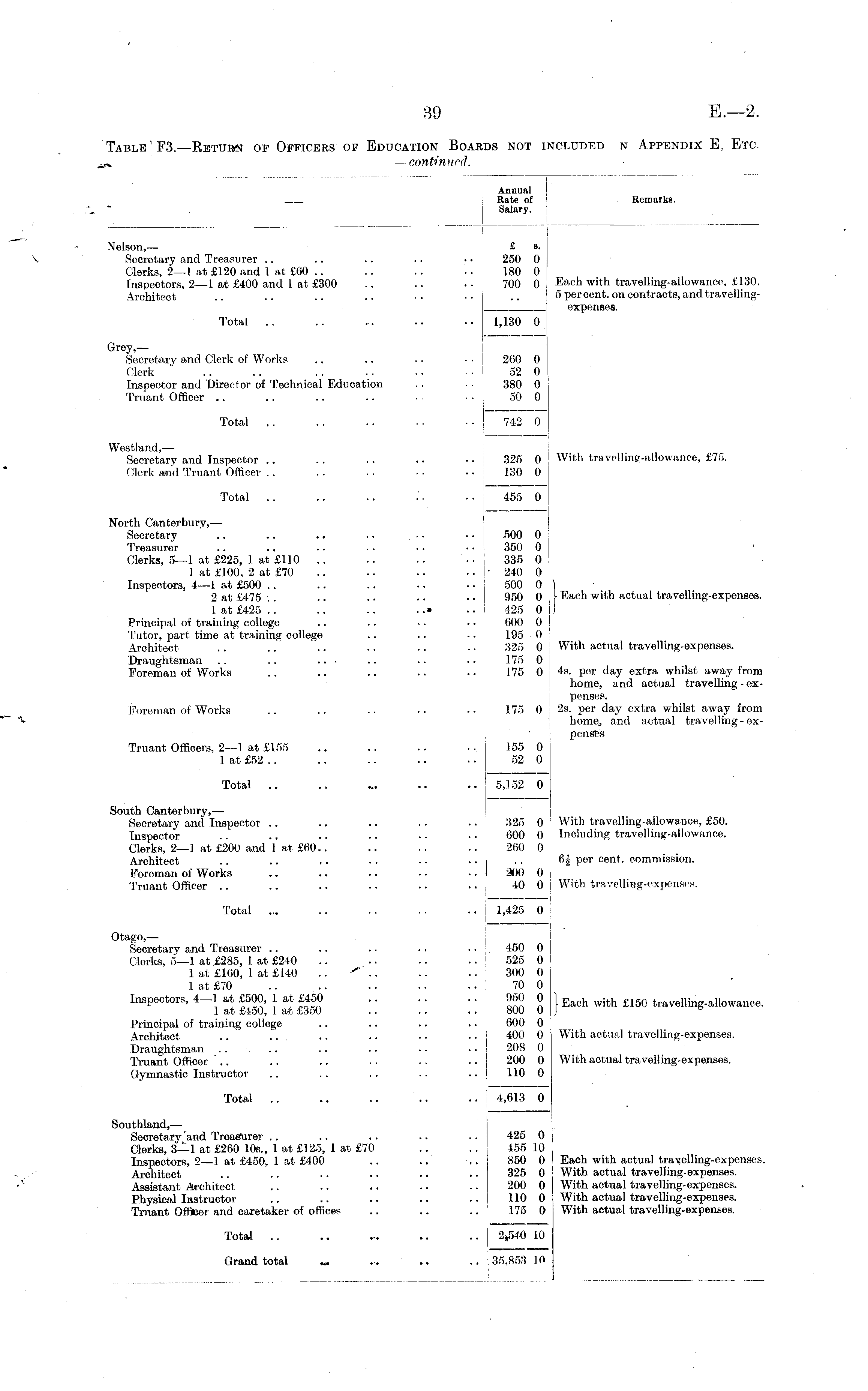 Annual Rate of Salary. Remarks. Nelson, — Secretary and Treasurer Clerks, 2—1 at £120 and 1 at £60 Inspectors, 2—1 at £400 and 1 at £300 Architect £ s. 250 0 | 180 0 | 700 0 Each with travelling-allowance. £130. 5 percent, on contracts, and travellingexpenses. Total 1,130 0 Grey,-— Secretary and Clerk of Works Clerk Inspector and Director of Technical Education Truant Officer i 260 0 52 0 380 0 50 0 Total .. Westland, — Secretary and Inspector Clerk and Truant Officer 742 0 With travelling-allowance, £75. 325 0 ! 130 0 Total 455 0 North Canterbury,— Secretary .. .. .. Treasurer Clerks, 5—1 at £225, 1 at £110 1 at £100, 2 at £70 Inspectors, 4—1 at £500 2 at £475 1 at £425 Principal of training college Tutor, part time at training college Architect Draughtsman .. .. .. • Foreman of Works . .* 500 0 350 0 j 335 0 j • 240 0 500 0 950 O 425 0 600 0 195 0 325 0 175 0 175 0 L Each with actual travelling-expenses. With actual travelling-expenses. Foreman of Works 175 0 4s. per day extra whilst away from home, arid actual travelling - expenses. 2s. per day extra whilst away from home, and actual travelling-ex-penses Truant Officers, 2—1 at £1.55 1 at £52 155 0 52 0 Total .. 5,152 0 With travelling-allowance, £50. Including travelling-allowance. South Canterbury,— Secretary and Inspector Inspector Clerks, 2—1 at £200 and 1 at £60.. Architect Foreman of Works Truant Officer 325 0 600 0 260 0 6J per cent, commission. 300 0 40 0 With travelling-expenses. Total ... 1,425 0 ! Otago,— Secretary and Treasurer Clerks, 5—1 at £285, 1 at £240 1 at £160, 1 at £140 .. 1 at £70 Inspectors, 4—1 at £500, I at £450 1 at £450, 1 at £350 Principal of training college Architect .. Draughtsman Truant Officer Gymnastic Instructor I 450 0 525 0 300 0 70 0 950 0 800 0 600 0 400 0 208 0 200 0 110 0 [Each with £150 travelling-allowance. With actual travelling-expenses. With actual travelling-expenses. Total .. 4,613 0 Southland, — Secretary and Treasurer Clerks, 3—1 at £260 10s., 1 at £125, 1 at £70 Inspectors, 2—1 at £450, 1 at £400 Architect Assistant Architect Physical Instructor Truant Officer and caretaker of offices 425 0 455 10 850 0 325 0 200 0 110 0 175 0 Each with actual travelling-expenses. ! With actual travelling-expenses. With actual travelling-expenses. With actual travelling-expenses. With actual travelling-expenses. Total .. 2*540 10 Grand total 35,853 10