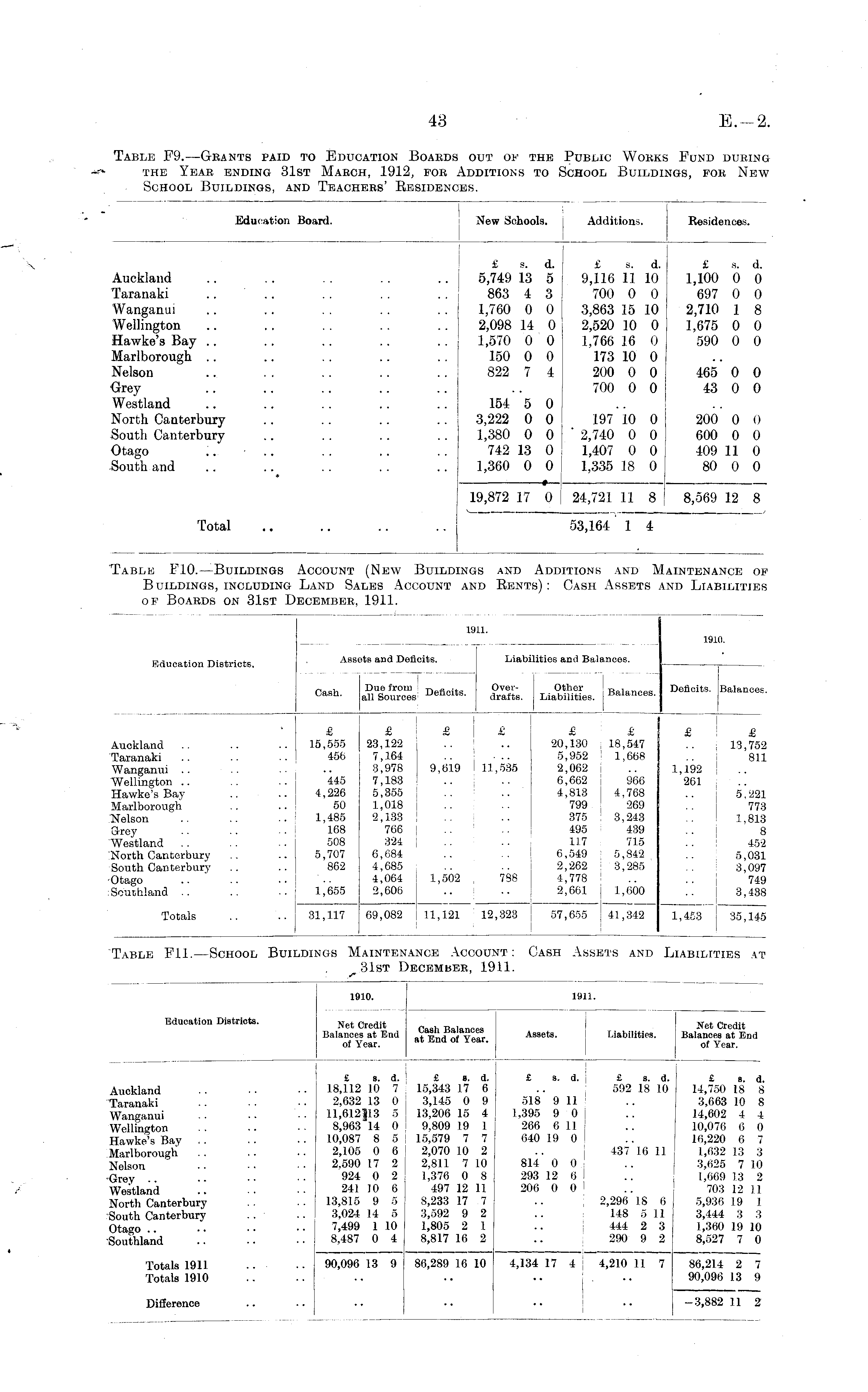 1910. 1911. Education Districts. Net Credit Balances at End of Year. Cash Balances at End of Year. Assets. Liabilities. Net Credit Balances at End of Year. Auckland Taranaki Wanganui Wellington Hawke's Bay Marlborough Nelson £ s. d. 18,112 10 7 2,632 13 0 11,612]13 5 8,963 14 0 10,087 8 5 2,105 0 6 2,590 17 2 924 0 2 241 10 6 13,815 9 5 3,024 14 5 7,499 1 10 8,487 0 4 £ s. d. 15,343 17 6 3,145 0 9 13,206 15 4 9,809 19 I 15,579 7 7 2,070 10 2 2,811 7 10 1,376 0 8 497 12 11 8,233 17 7 3,592 9 2 1,805 2 1 8,817 16 2 £ s. d. 518 9 11 1,395 9 0 266 6 11 640 19 0 814' 0 0 293 12 0 206 0 0 £ s. d. 592 18 10 437 16 11 2,296 IS 6 148 5 11 444 2 3 290 9 2 £ s. d. 14,750 18 8 3,663 10 8 14,602 4 4 10,076 0 0 16,220 6 7 1,632 13 3 3,625 7 10 1,669 13 2 703 12 11 5,936 19 1 3,444 3 3 1,360 19 10 8,527 7 0 Grey Westland North Canterbury South Canterbury Otago Southland Totals 1911 Totals 1910 90,096 13 9 86,289 16 10 4,134 17 4 4,210 11 7 86,214 2 7 90,096 13 9 Difference -3,882 11 2 I