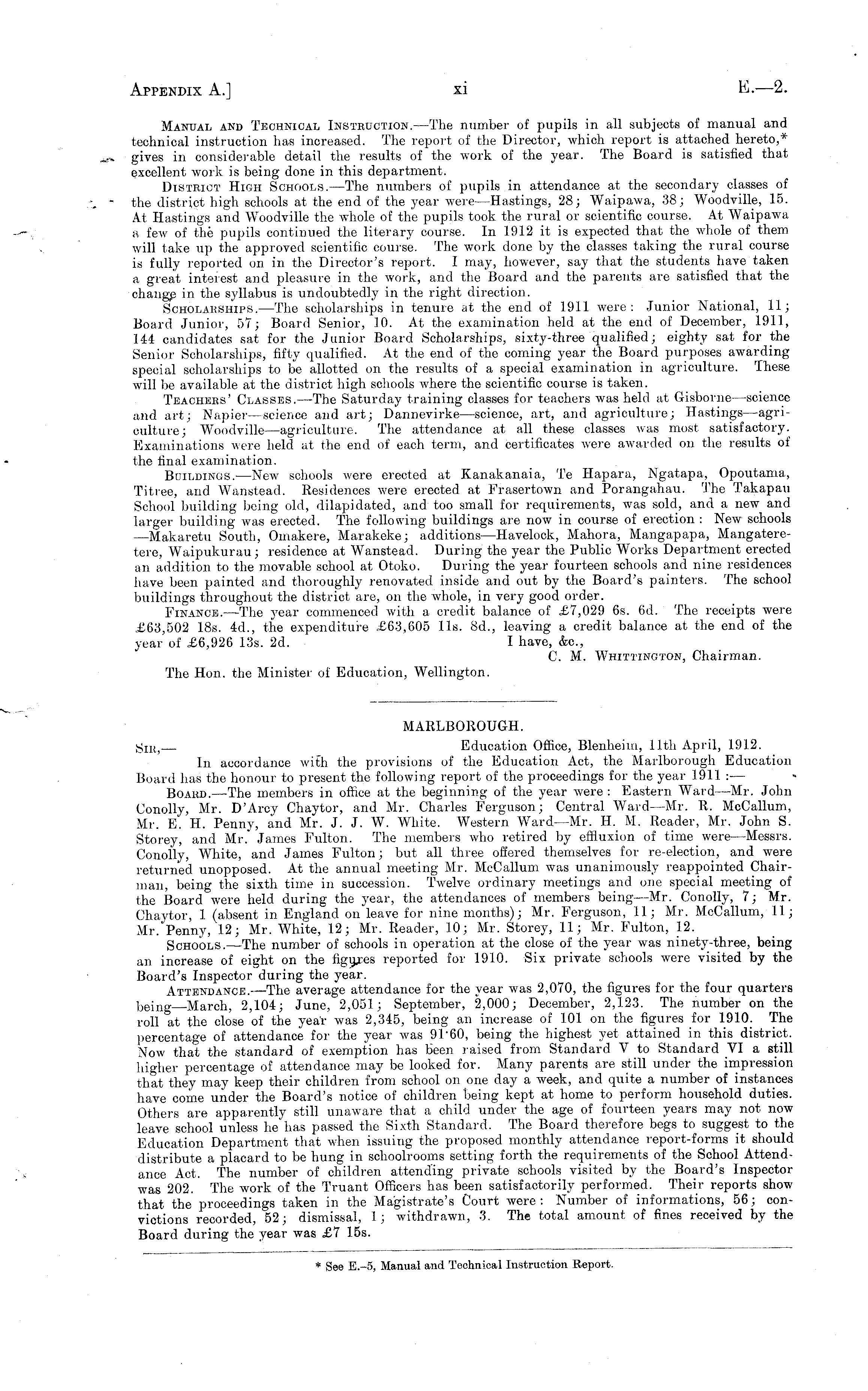 MARLBOROUGH. S IX) Education Office, Blenheim, 11th April, 1912. In accordance with the provisions of the Education Act, the Marlborough Education Board has the honour to present the following report of the proceedings for the year 1911 : — Board. —The members in office at the beginning of the year were : Eastern Ward —Mr. John Conolly, Mr. D'Arcy Chaytor, and Mr. Charles Ferguson; Central Ward —Mr. R. McCallum, Mr. E. H. Penny, and Mr. J. J. W. White. Western Ward—Mr. H. M. Reader, Mr. John S. Storey, and Mr. James Fulton. The members who retired by effluxion of time were —Messrs. Conolly, White, and James Fulton; but all three offered themselves for re-election, and were returned unopposed. At the annual meeting Mr. McCallum was unanimously reappointed Chairman, being the sixth time in succession. Twelve ordinary meetings and one special meeting of the Board were held during the year, the attendances of members being —Mr. Conolly, 7; Mr. Chaytor, 1 (absent in England on leave for nine months); Mr. Ferguson, 11; Mr. McCallum, 11; Mr. Penny, 12; Mr. White, 12; Mr. Reader, 10; Mr. Storey, 11; Mr. Fulton, 12. Schools. —The number of schools in operation at the close of the year was ninety-three, being an increase of eight on the figuj-es reported for 1910. Six private schools were visited by the Board's Inspector during the year. Attendance. —The average attendance for the year was 2,070, the figures for the four quarters being —March, 2,104; June, 2,051; September, 2,000; December, 2,123. The number on the roll at the close of the year was 2,345, being an increase of 101 on the figures for 1910. The percentage of attendance for the year was 91-60, being the highest yet attained in this district. Now that the standard of exemption has been raised from Standard V to Standard VI a still higher percentage of attendance may be looked for. Many parents are still under the impression that they may keep their children from school on one day a week, and quite a number of instances have come under the Board's notice of children being kept at home to perform household duties. Others are apparently still unaware that a child under the age of fourteen years may not now leave school unless he has passed the Sixth Standard. The Board therefore begs to suggest to the Education Department that when issuing the proposed monthly attendance report-forms it should distribute a placard to be hung in schoolrooms setting forth the requirements of the School Attendance Act. The number of children attending private schools visited by the Board's Inspector was 202. The work of the Truant Officers has been satisfactorily performed. Their reports show that the proceedings taken in the Magistrate's Court were: Number of informations, 56; convictions recorded, 52; dismissal, 1; withdrawn, 3. The total amount of fines received by the Board during the year was £7 15s.